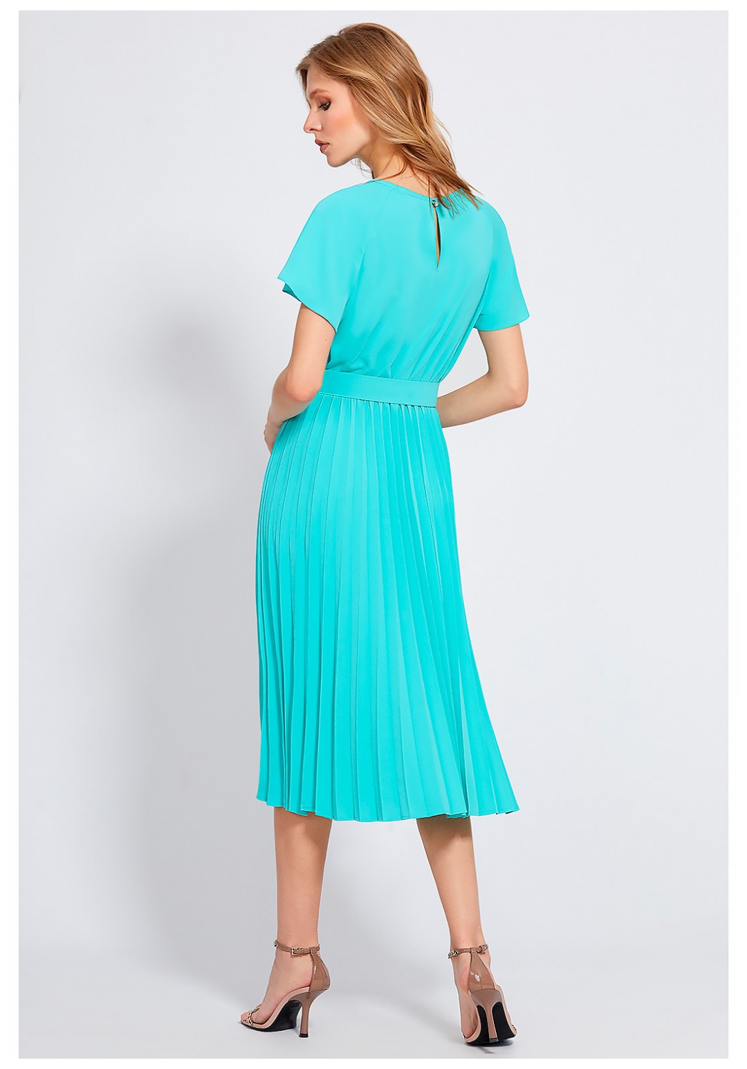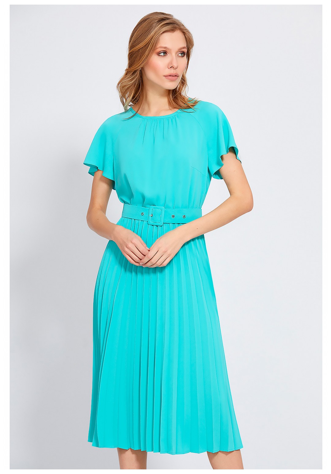 Это красивое платье, идеально подходящее для любого типа фигуры – безупречное предложение для тех женщин, которые любят оригинальную элегантность. Изделие сшили из мягкой приятной, немнущейся ткани нежного бирюзового оттенка. Модель Х-образного силуэта длины миди, с округлой формой горловины, со скрытой резинкой на талии и короткими рукавами-бабочками. В среднем шве спинки лифа обработана застёжка на навесную петлю и ювелирную пуговицу. Платье привлекает к себе внимание также благодаря плиссированной юбке, придающей фигуре изящные движения. Линия талии красиво подчёркивается поясом с пряжкой в тон.