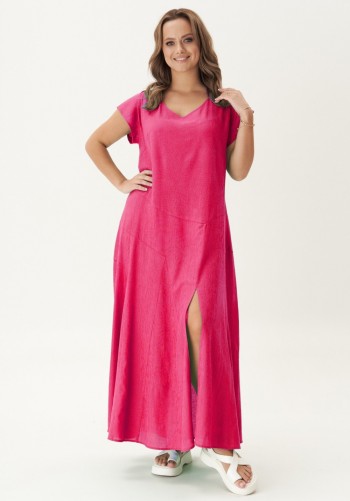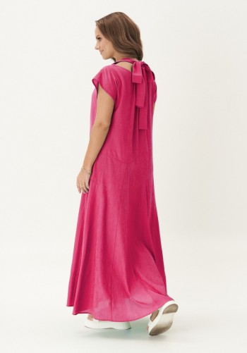 Платье миди, силуэт полуприлегающий в верхней части, переходящий в расклешенный А-силуэт к низу, создающий эффект удлиненной и струящейся фигуры. Воротник широкий, плоский, отложной, с закругленными краями. Лиф с застежкой на петли пуговицы. Декоративный ряд контрастных пуговиц, подчеркивает V-образный вырез и утончает силуэт. Для лучшего прилегания в платье выполнены нагрудные выточки и выточки по спинке, для большего удобства обработаны карманы-хулиганы. Рукава длинные, втачные, с легкой сборкой на манжетах, что добавляет мягкости и женственности. По полочке и спинке идет подрез чуть ниже линии талии, от которого по полочке юбки выполнена встречная складка. Длина изделия по спинке 120 см., длина рукава 62 см.