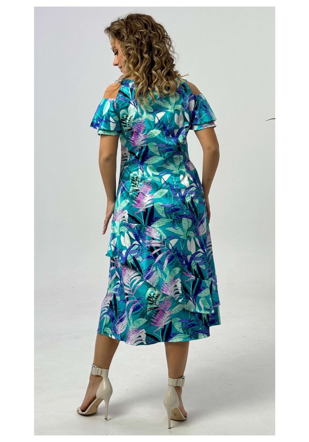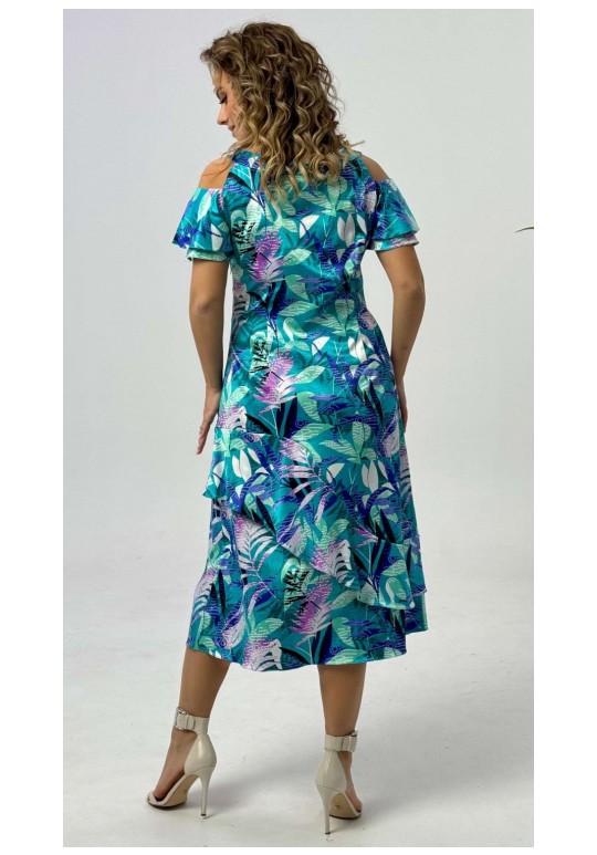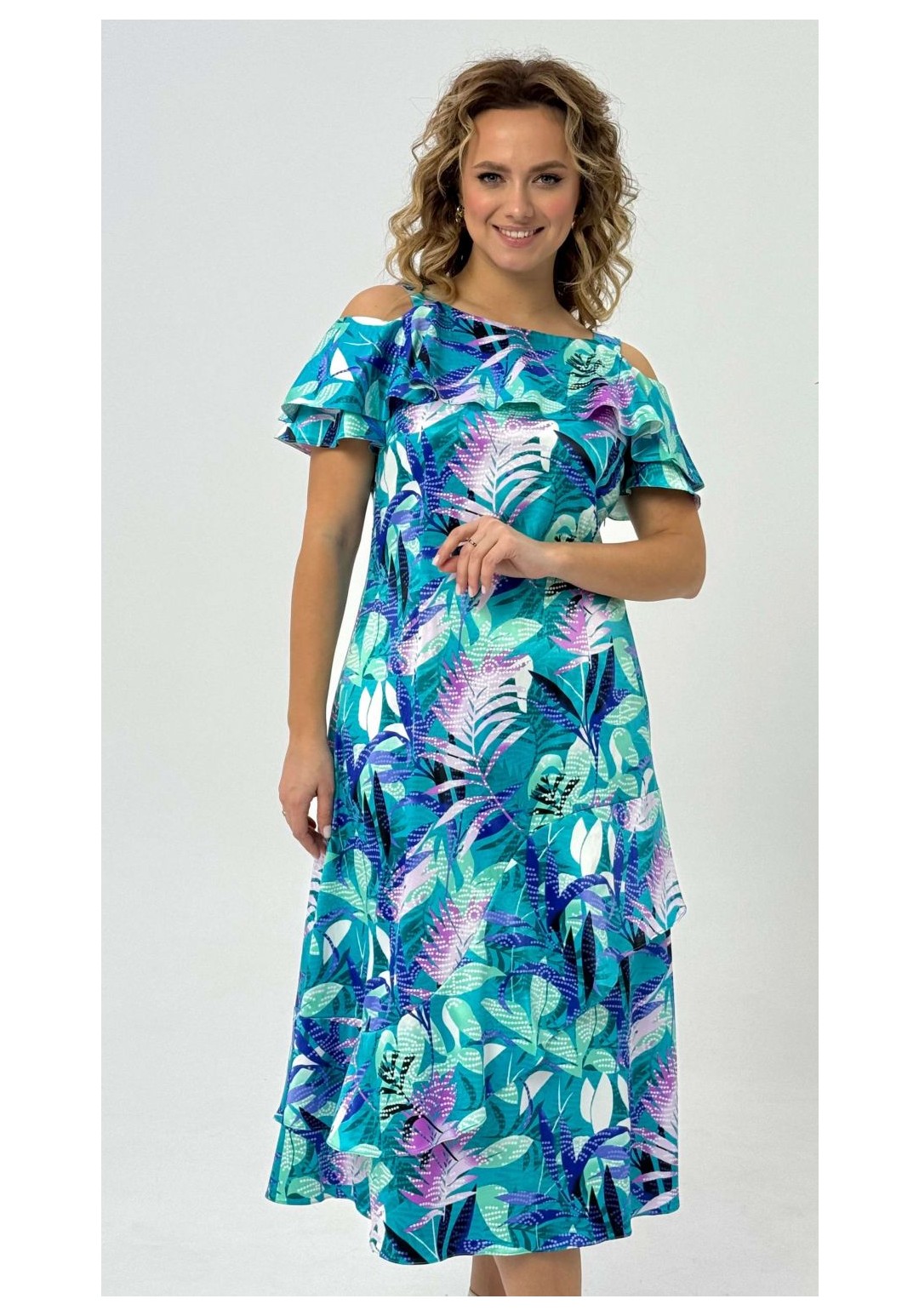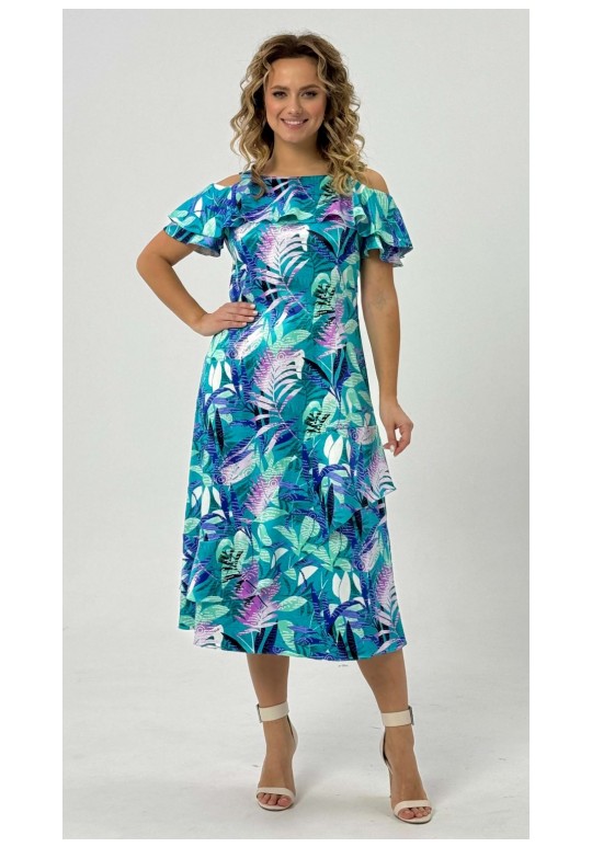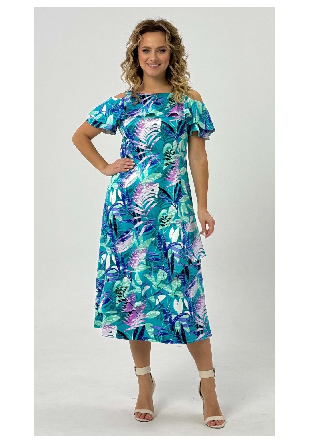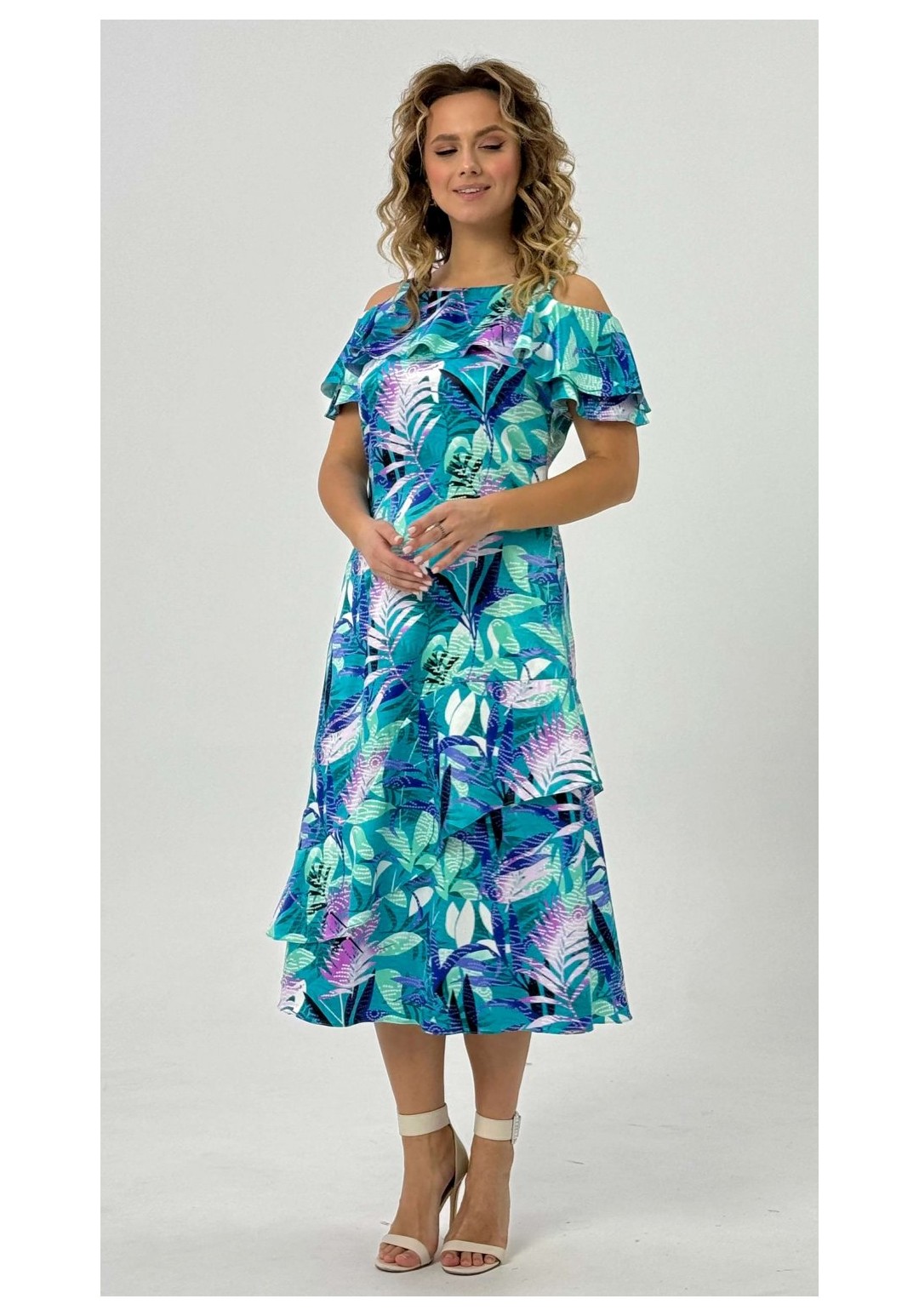 Платье из ткани яркого летнего дизайна подойдет на все случаи жизни: в отпуск, на прогулку, в гости и да же в офисе Вы не будете выглядеть скучно. Открытые плечи и прикрытые воланами руки обеспечат Вам комфорт и уверенность даже жарким летним днем. Полуприлегающий силуэт и расширение к низу выигрышно подчеркнет Вашу фигуру.