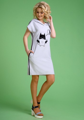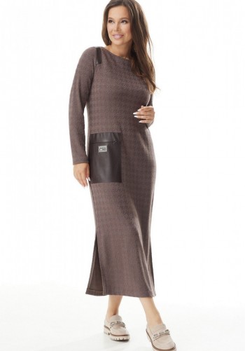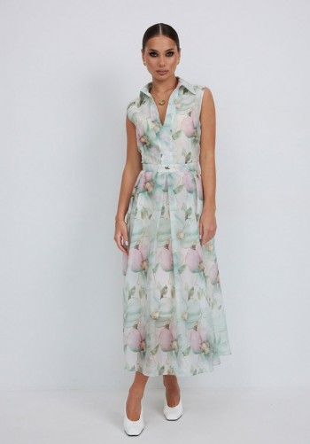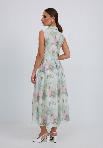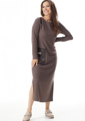 Стильное платье из струящейся ткани, с составом вискоза - 100%, с оригинальным принтом полуприлегающего силуэта длины миди. Отрезной лиф, по линии талии эластичная тесьма. Горловина лодочка, по среднему шву спинки от горловины молния. Рукав втачной длинный, по низу рукава манжета с эластичной тесьмой. В правом рукаве в верхней части фигурный вырез. Низ ассиметричный. Платье на трикотажной подкладке.