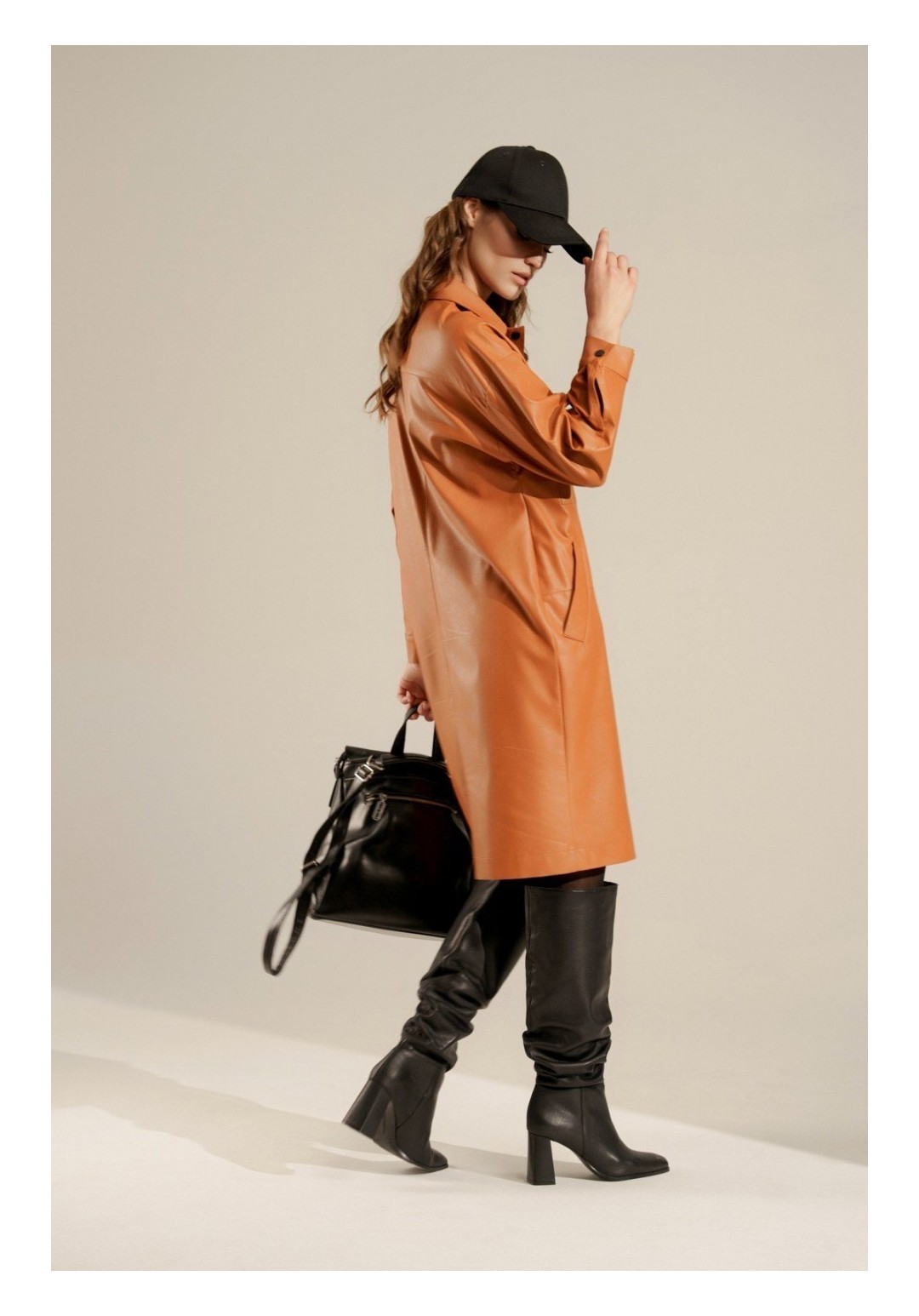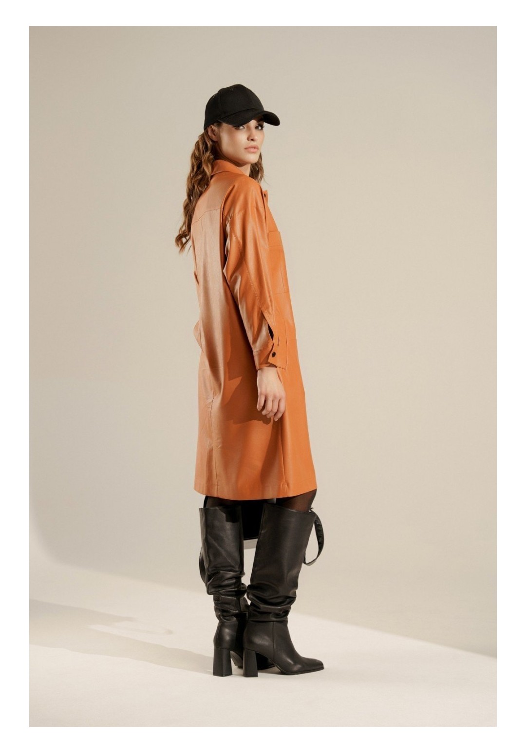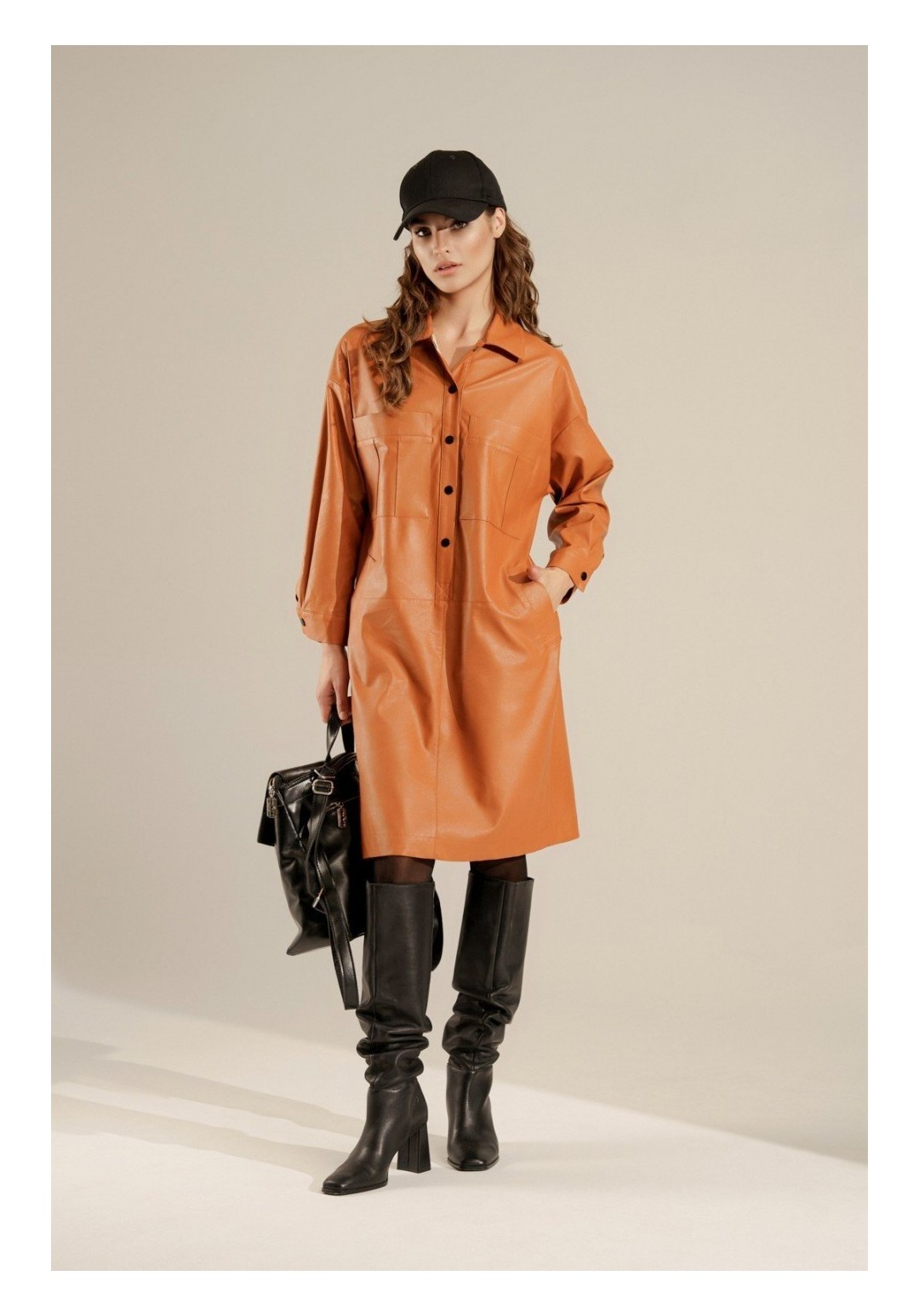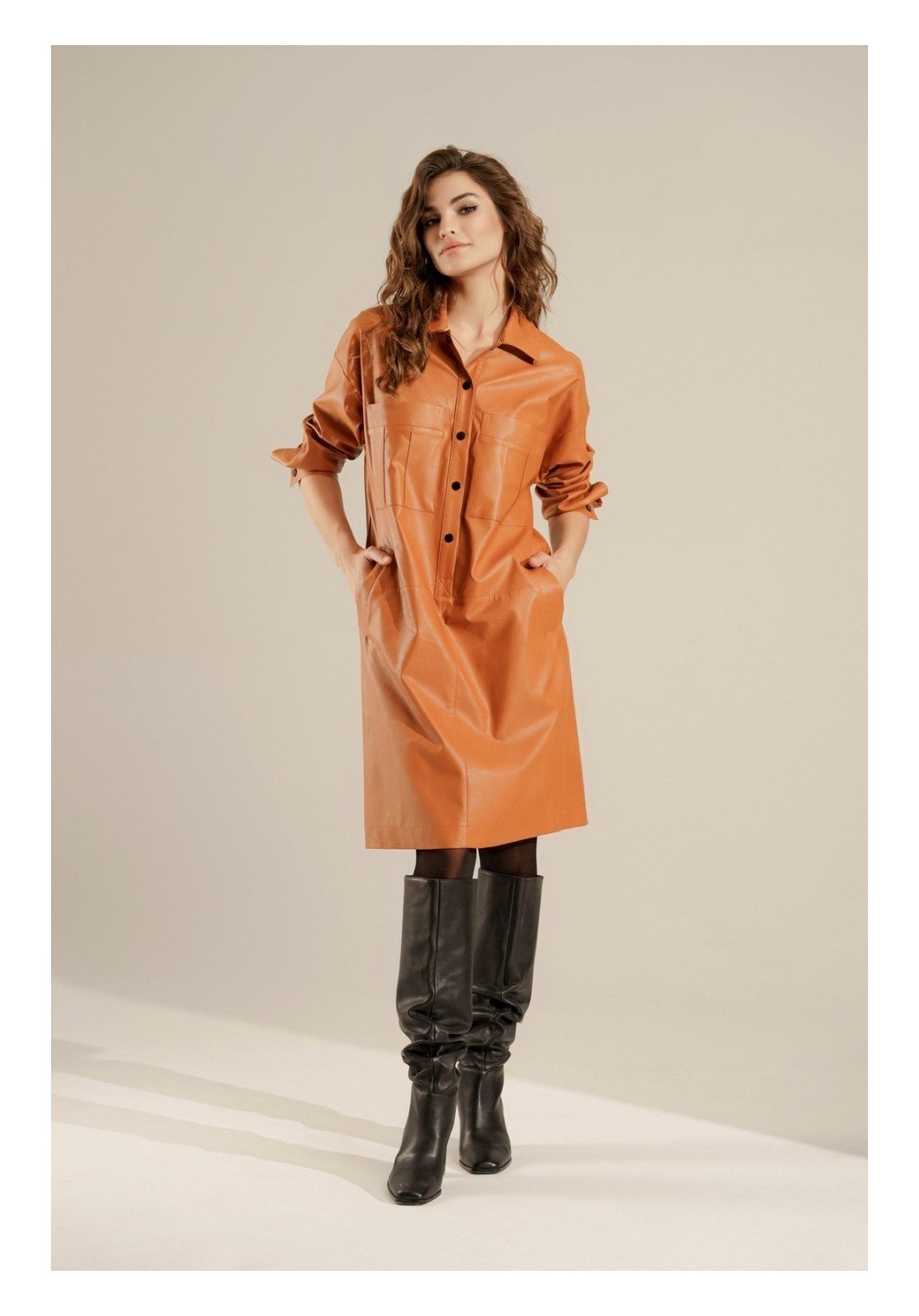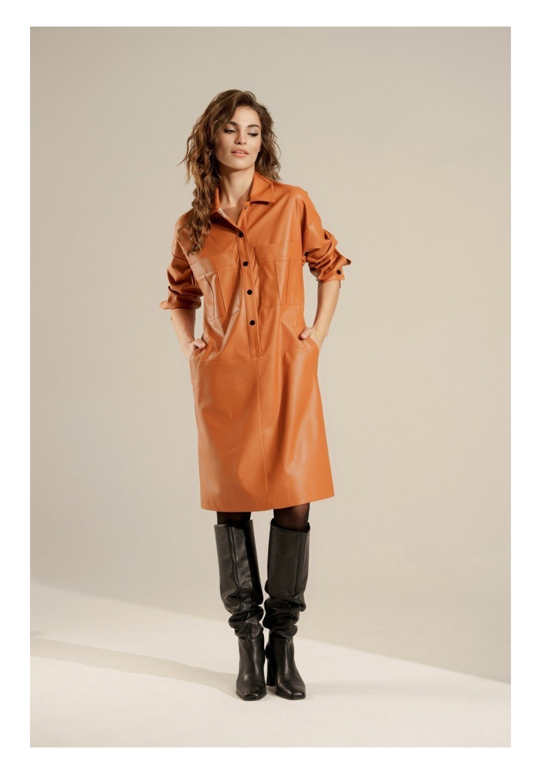 Платье прямого силуэта из эко-кожи длиной до колена. Воротник отложной. По переду застежка на кнопки ниже линии талии, накладные карманы по линии груди и прорезные карманы с листочкой по линии бедер. На спинке кокетка. Рукав отрезной на базе цельнокроеного, по низу разрез и манжет с застежкой на кнопку. Длина по спинке - см, длина рукава от горловины - см.