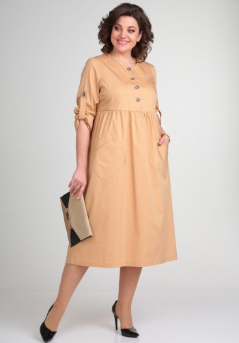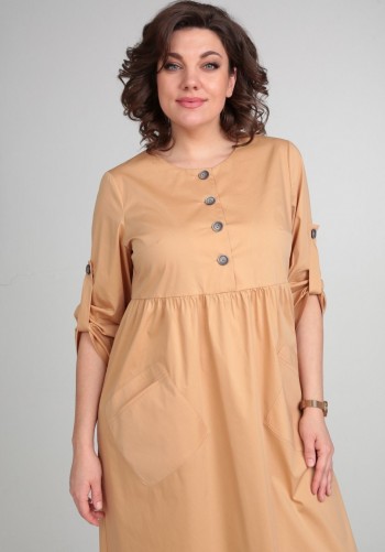 Платье женское длиной до середины икры, слегка расклешенное к низу. Спинка с косым передом в области талии и средним швом до разреза. Перед с косым подрезом в области талии, образующий мягкую складку из лифа и 1 глубокую складку от подреза вниз. Горловина с рубашечным воротником на стойке и драпировкой в виде качели. Рукав втачной с отложными манжетами. Длина по спинке 130 см, длина рукава 26 см.