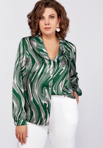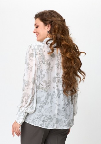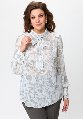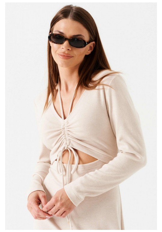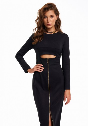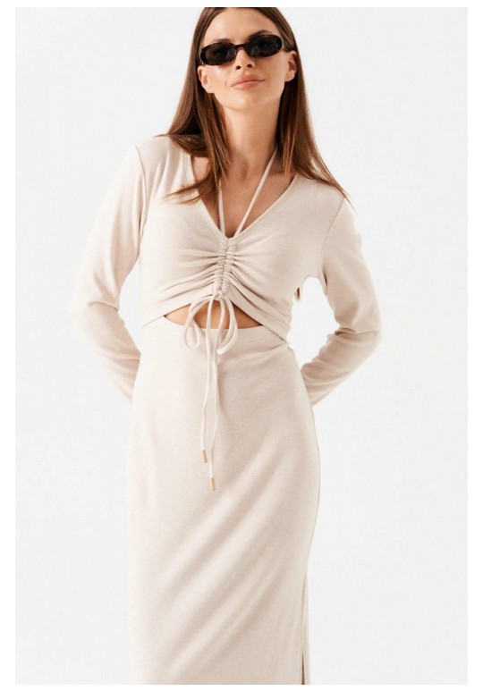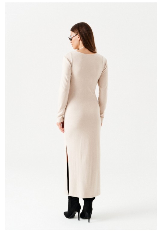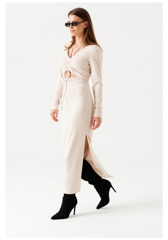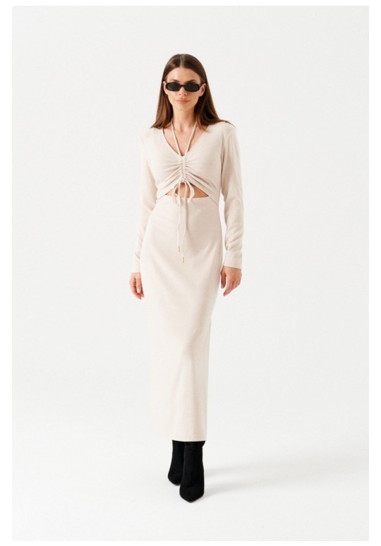 Платье женское из трикотажного полотна, длинное, прилегающего силуэта, с V-образным вырезом горловины. Перед платья состоит из двух частей. В верхней части переда средний шов, в котором обработаны две кулиски. В кулиски вставлена завязка, формирующая сборку на груди. Верхний край нижней части переда фигурной формы. Спинка цельная. Левый боковой шов заканчивается разрезом. Рукав втачной, длинный.