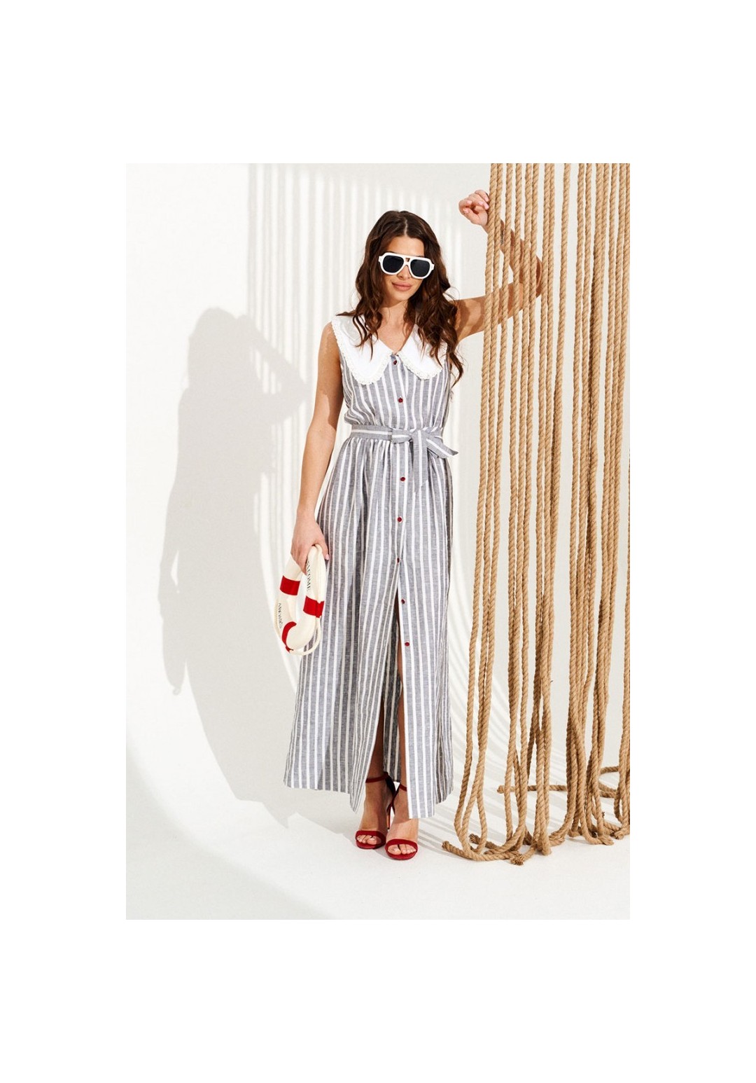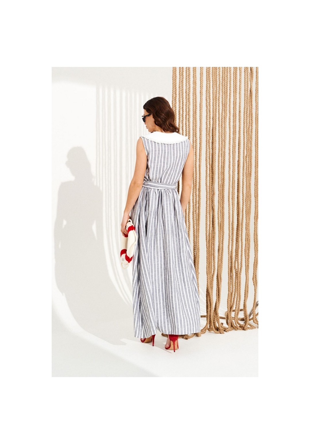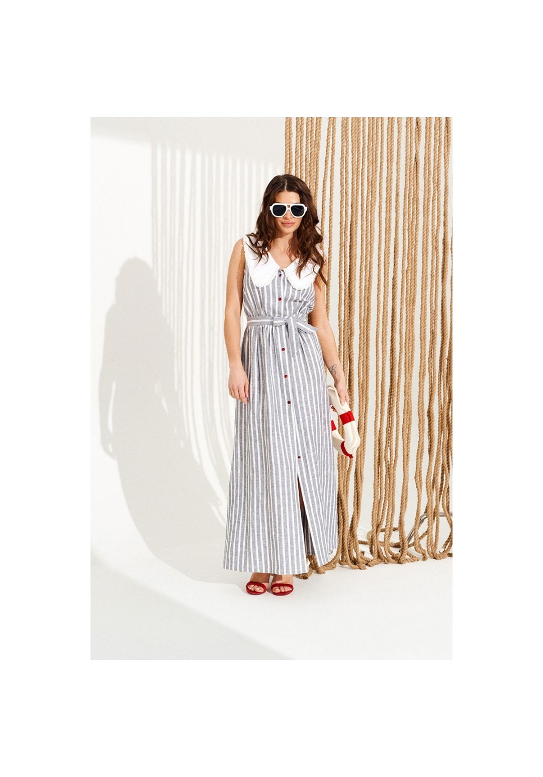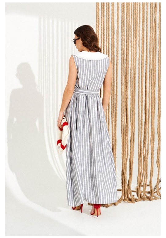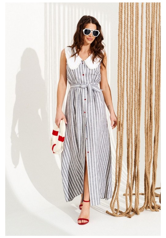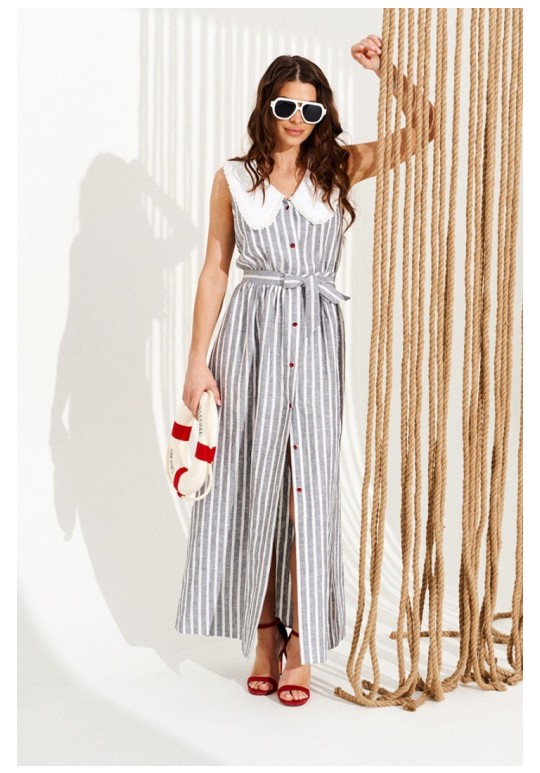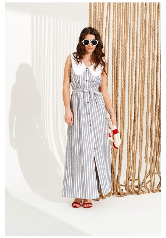 Платье приталенного силуэта, расклешенное книзу, с центральной застежкой на петли и пуговицы, отложным фигурным воротником. Воротник оформлен сборкой из кружева. Перед и спинка с притачным поясом. Для регулировки приталенности в боковые швы пояса вставлены завязки. Верхняя деталь спинки с талиевыми вытачками. Длина изделия на модели вдоль середины спинки — 140,5 см (допустимое отклонение +/- 1 см)