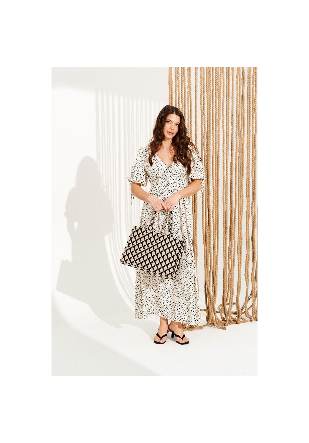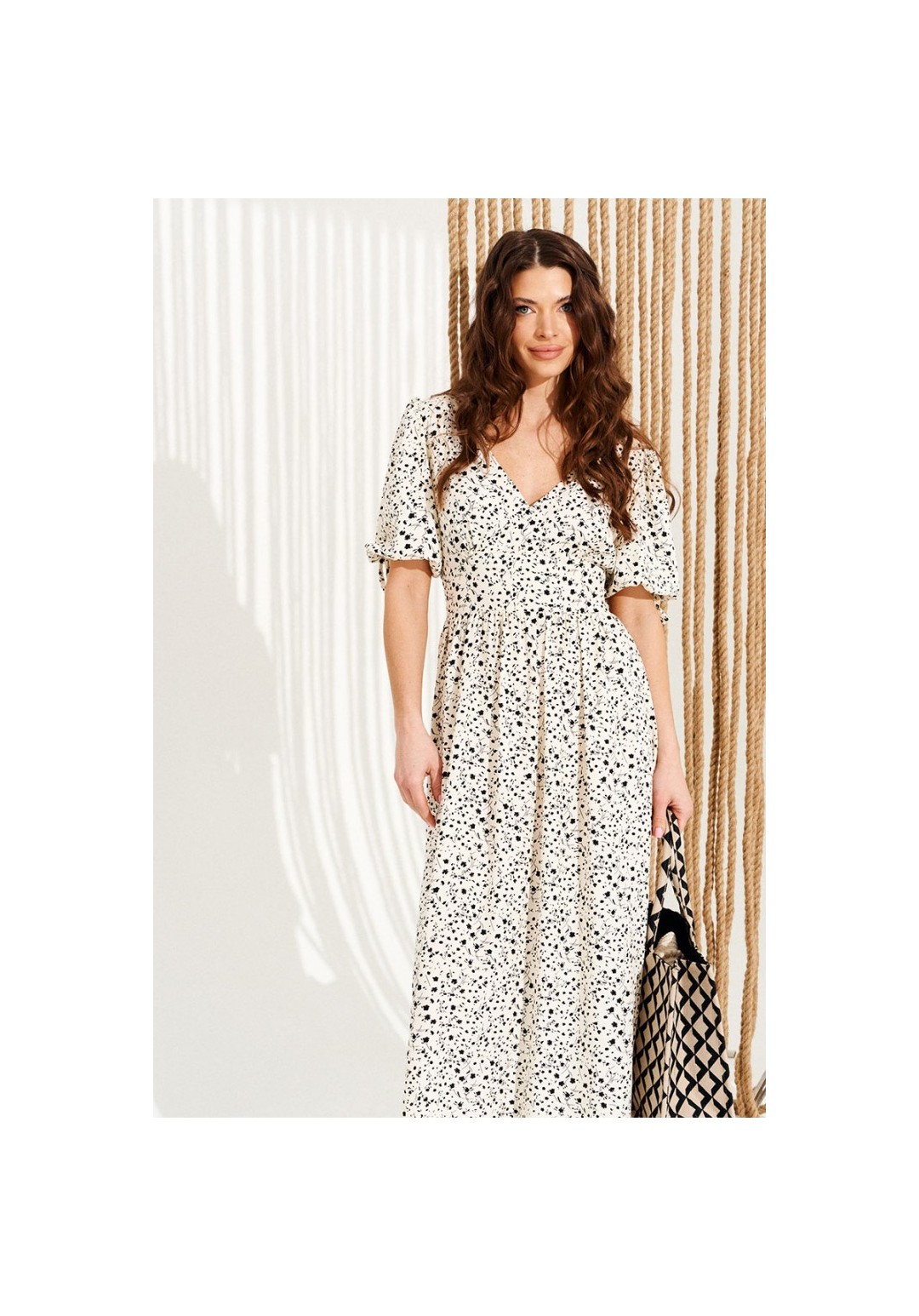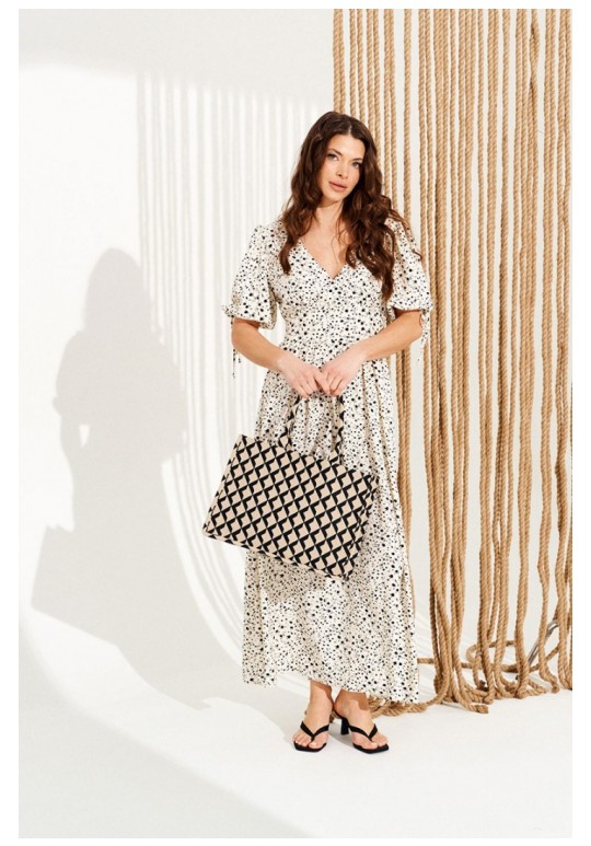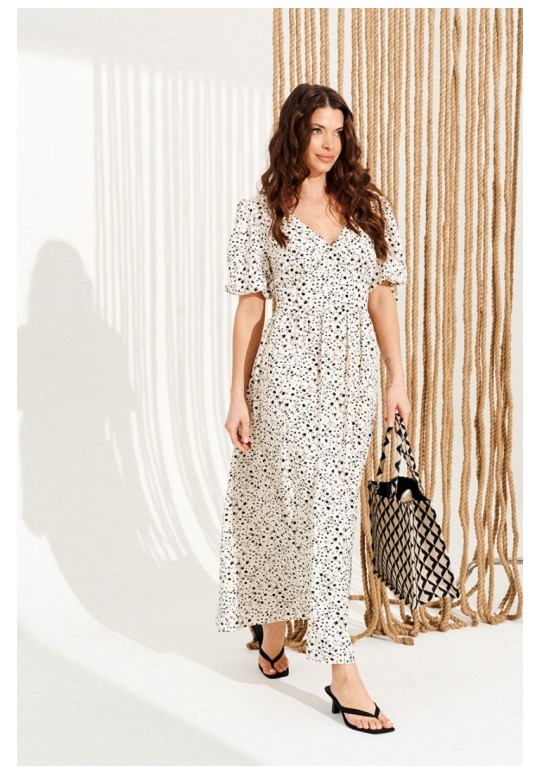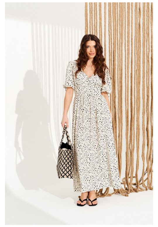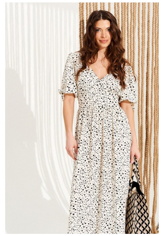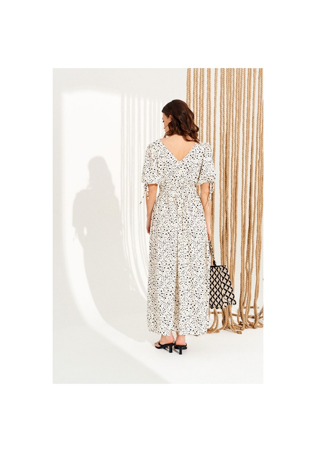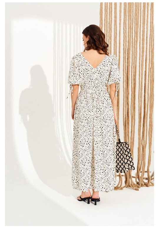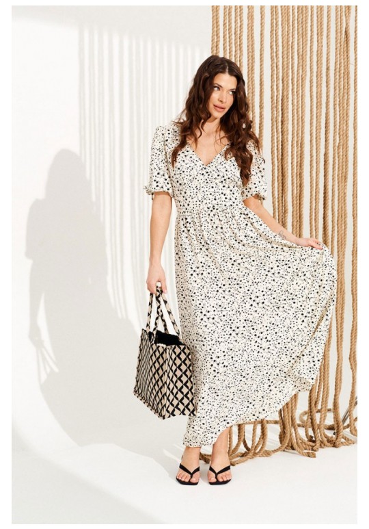 Платье полуприлегающего силуэта, расклешенное книзу, отрезное по линии талии, с V-образным вырезом горловины и застежкой на тесьму-молнию в среднем шве спинки. Перед с отрезным лифом. Спинка со средним швом и отрезным поясом со сборкой на эластичную тесьму. Рукав втачной короткий, со сборкой по верхнему и нижнему срезам. Нижний срез рукава на резинке, дополнен декоративными завязками. Длина изделия на модели от плечевого шва до низа — 134,5 см (допустимое отклонение +/- 1 см)