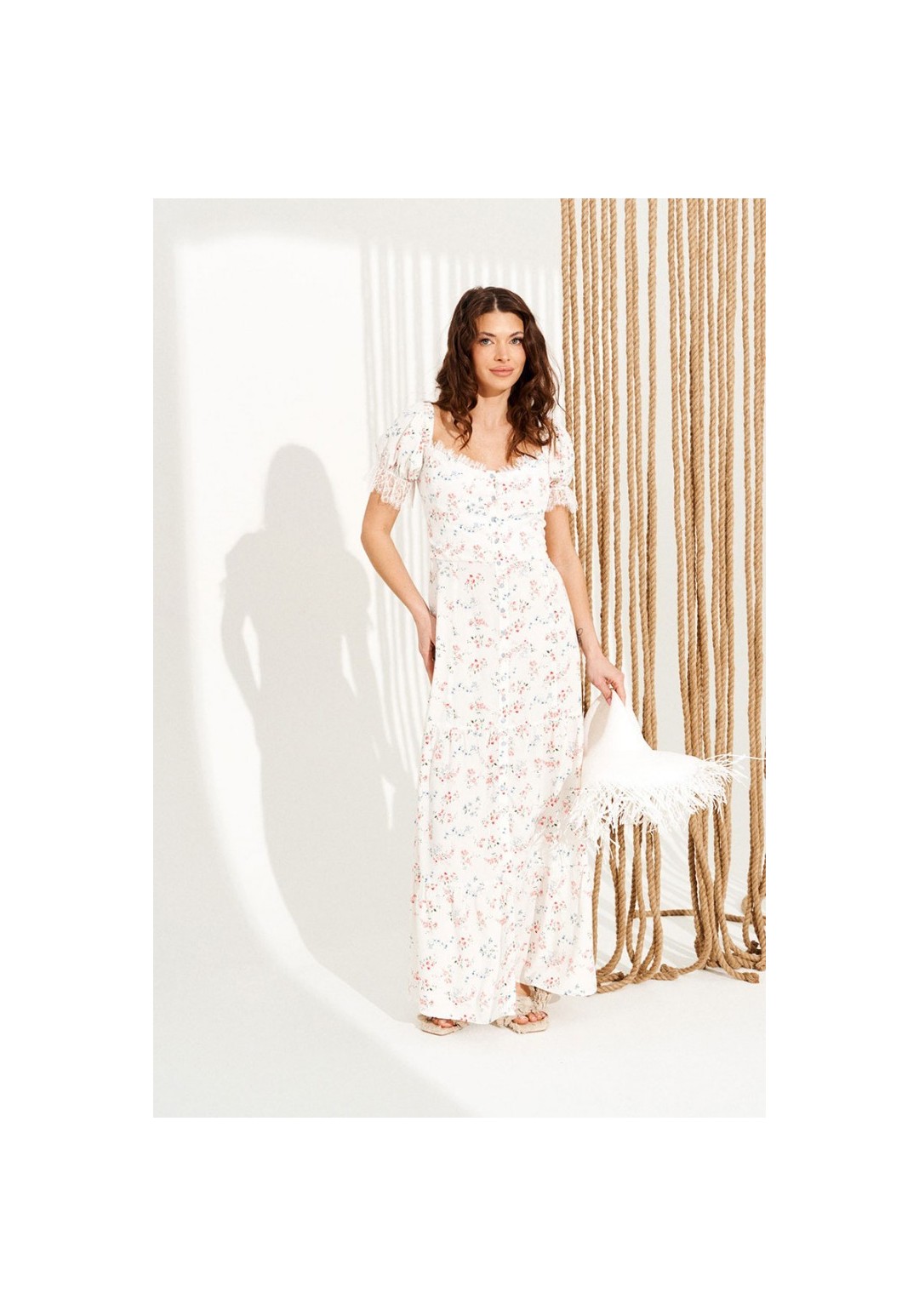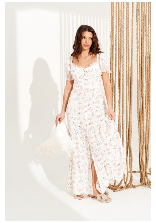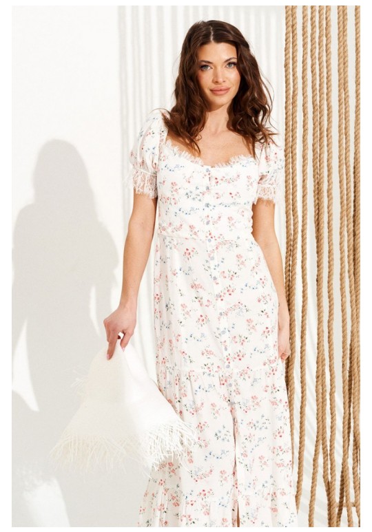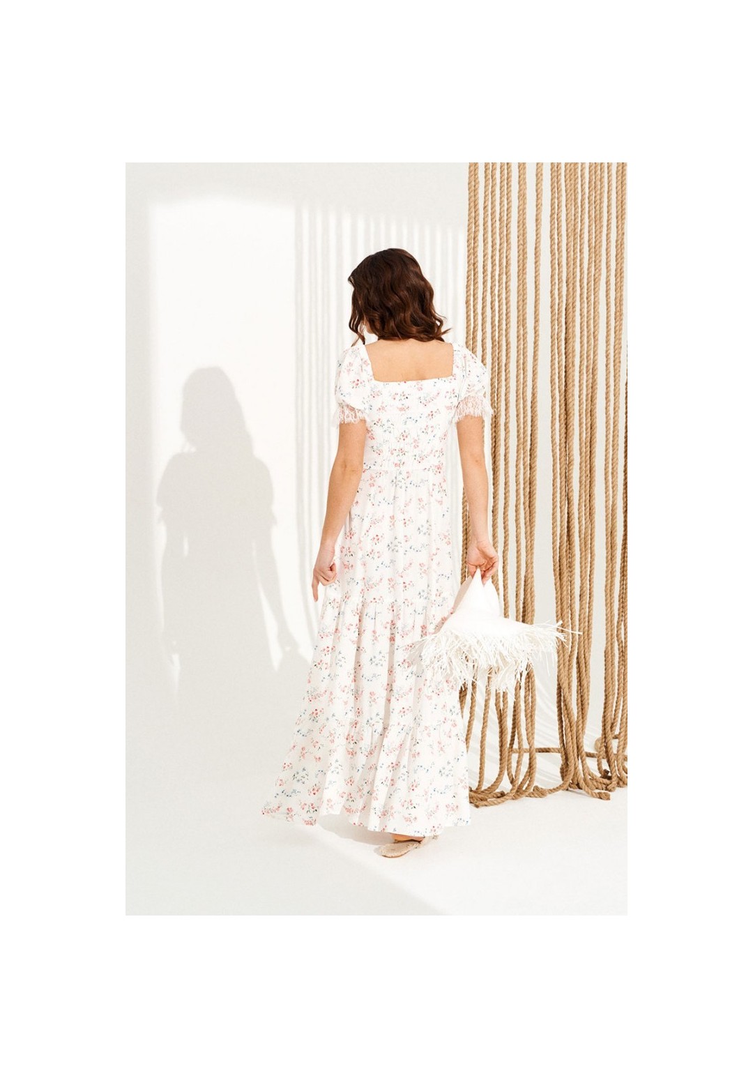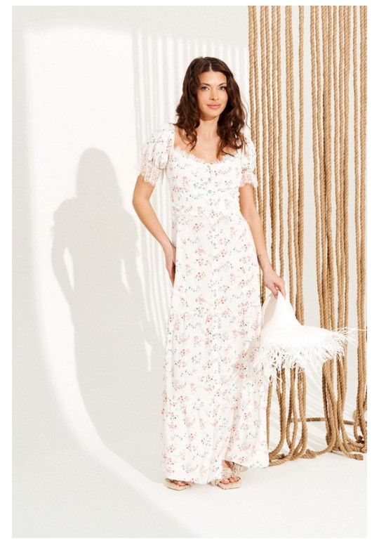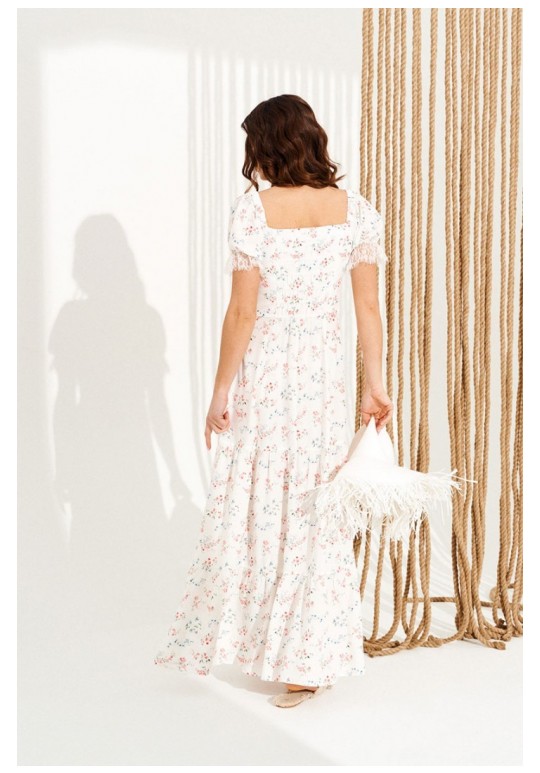 Платье полуприлегающего силуэта, расклешенное книзу, отрезное по линии талии, с центральной застежкой на петли и пуговицы и фигурным вырезом горловины. Верхние детали переда с рельефами и отрезными чашками. Нижние детали переда и спинки с рельефами и двумя рядами притачных воланов со сборкой по верхним срезам. Верхняя деталь спинки с рельефами. Центральные части спинки прострочены эластичной тесьмой. Рукав втачной, короткий. Окат и низ рукава обработаны эластичной тесьмой. Низ рукава и горловина переда оформлены кружевом. Длина изделия на модели вдоль середины спинки — 126,5 см (допустимое отклонение +/- 1 см)