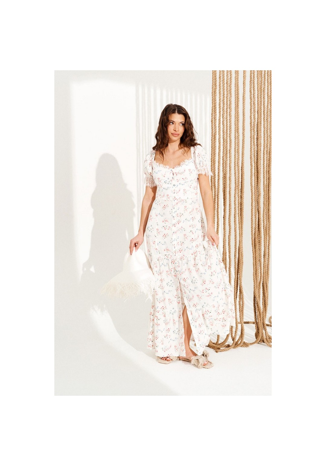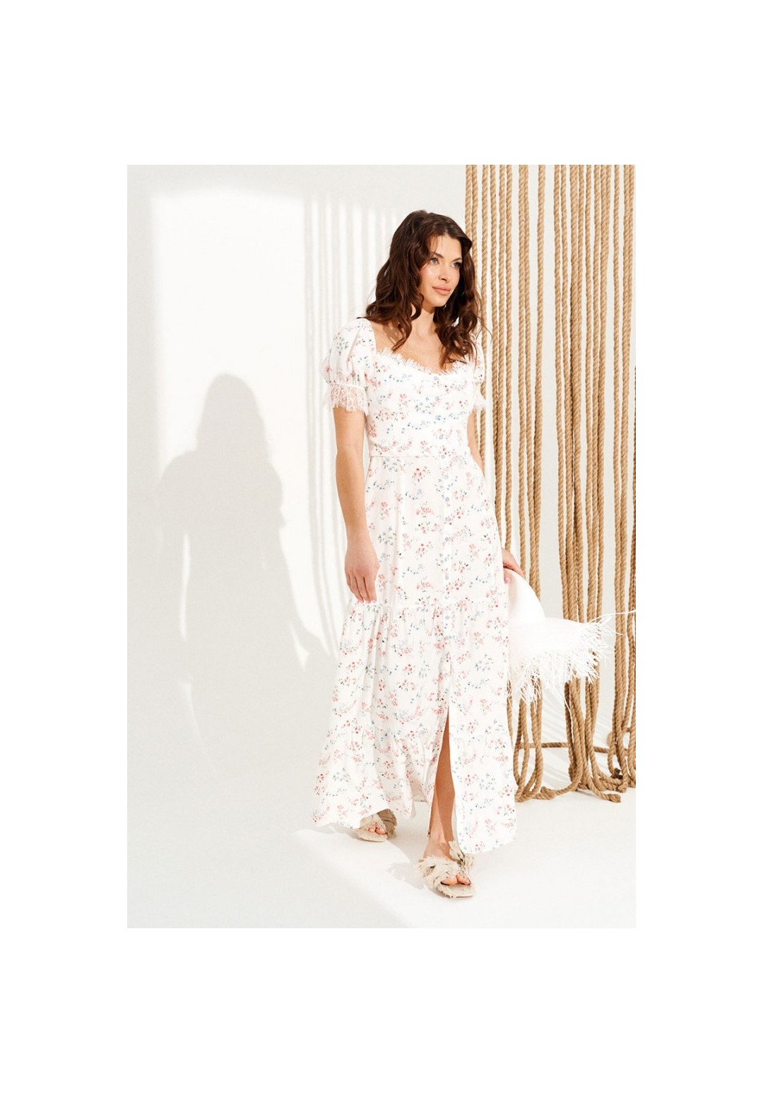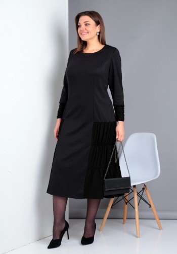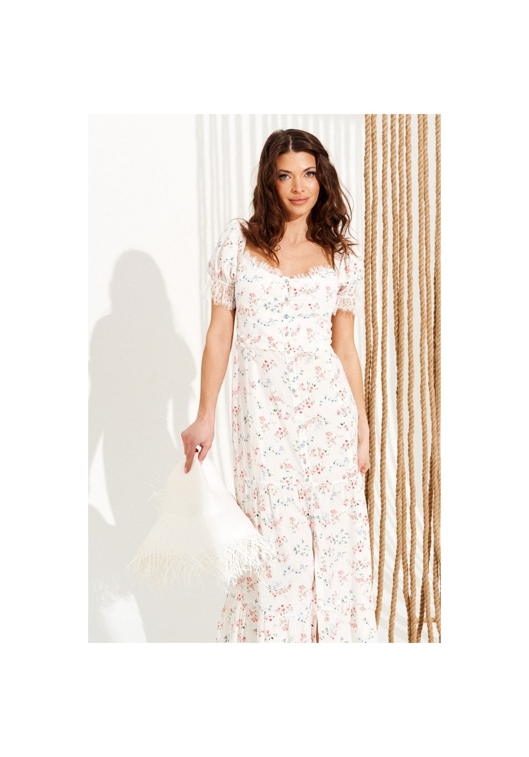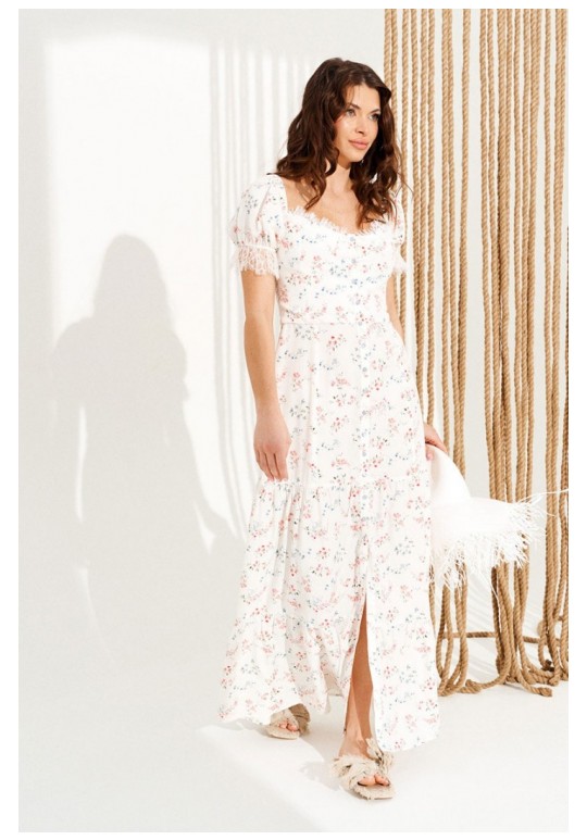 Платье полуприлегающего силуэта, расклешенное книзу, отрезное по линии талии, с центральной застежкой на петли и пуговицы и фигурным вырезом горловины. Верхние детали переда с рельефами и отрезными чашками. Нижние детали переда и спинки с рельефами и двумя рядами притачных воланов со сборкой по верхним срезам. Верхняя деталь спинки с рельефами. Центральные части спинки прострочены эластичной тесьмой. Рукав втачной, короткий. Окат и низ рукава обработаны эластичной тесьмой. Низ рукава и горловина переда оформлены кружевом. Длина изделия на модели вдоль середины спинки — 126,5 см (допустимое отклонение +/- 1 см)