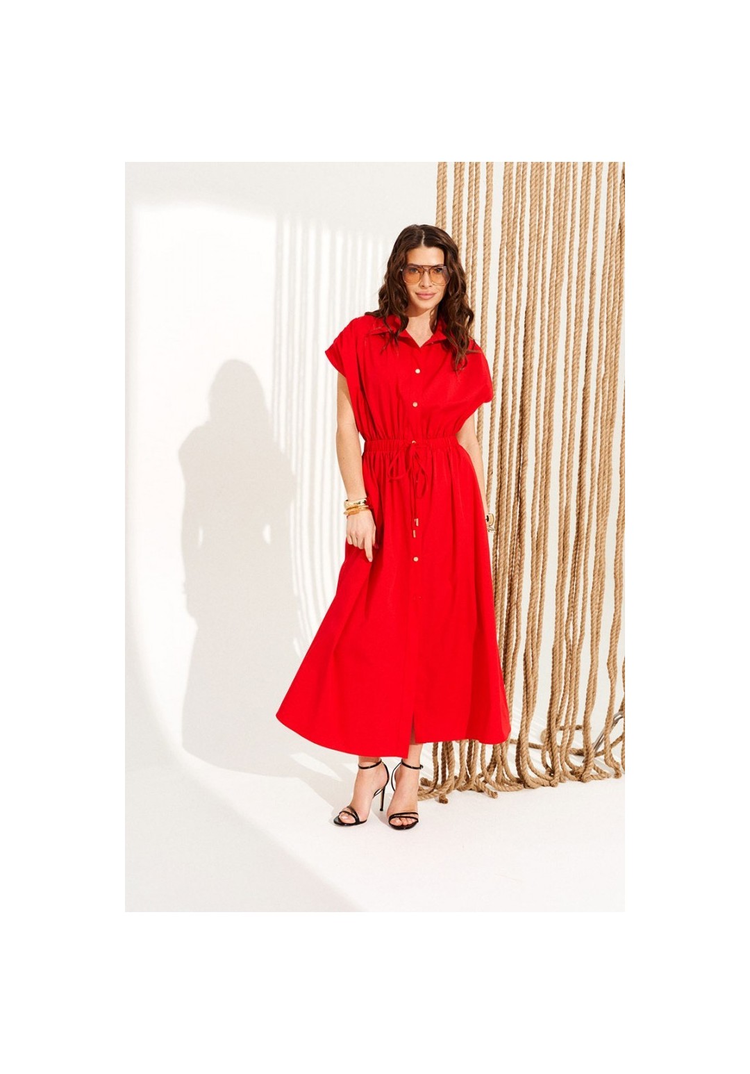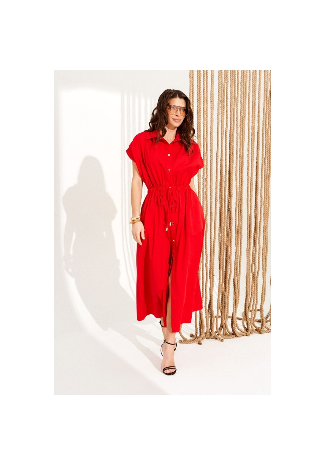 Платье умеренного объема, приталенного силуэта, с центральной застежкой на петли и пуговицы и спущенной линией плеча. Воротник стояче-отложной с отрезной стойкой. Пояс отрезной, на резинке, со шнуром-завязкой и наконечниками. Верхние детали переда со сборкой по плечевому шву. Нижние детали переда с боковыми прорезными карманами с застежкой на тесьму-молнию. Длина изделия на модели вдоль середины спинки — 129,5 см (допустимое отклонение +/- 1 см)