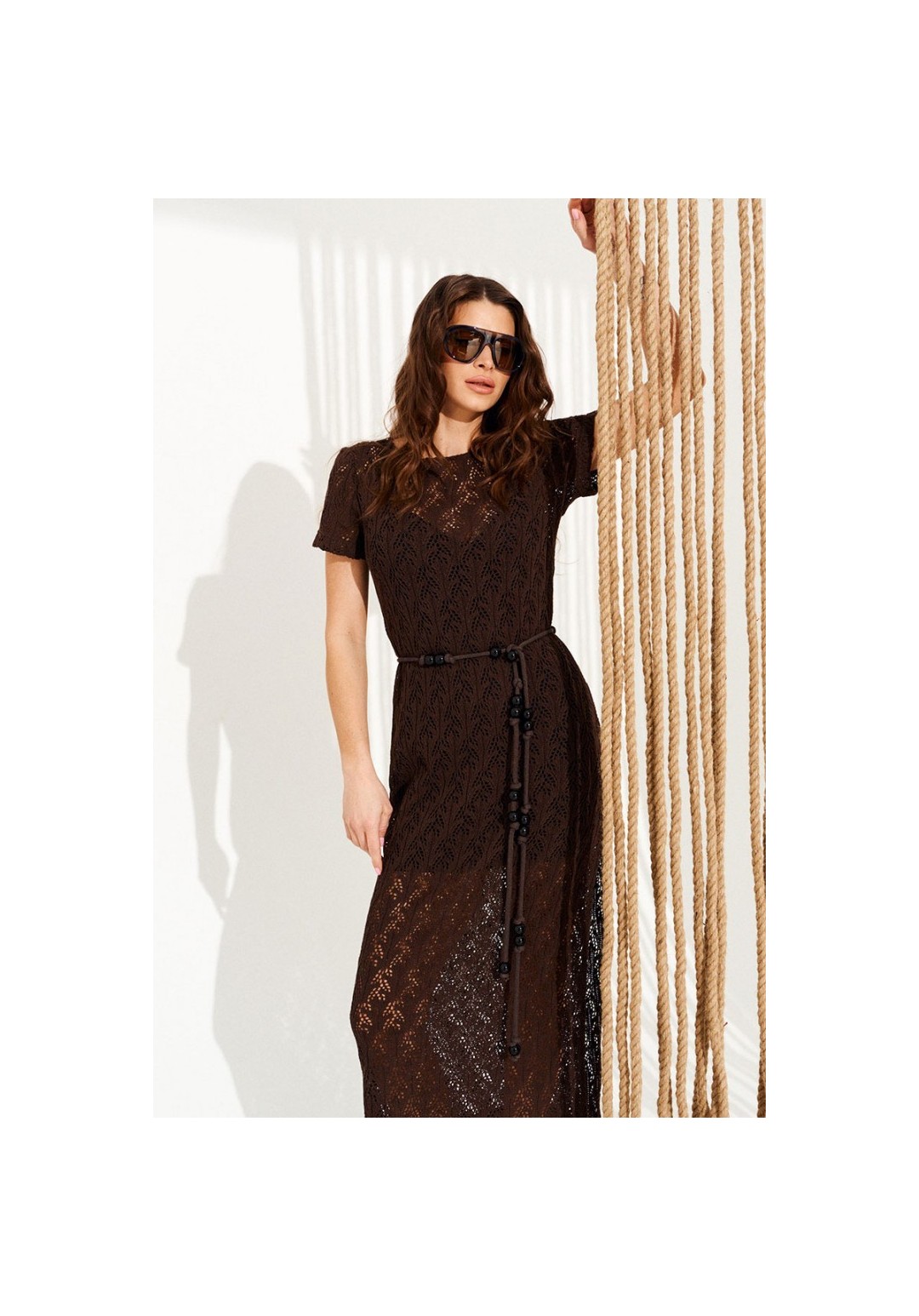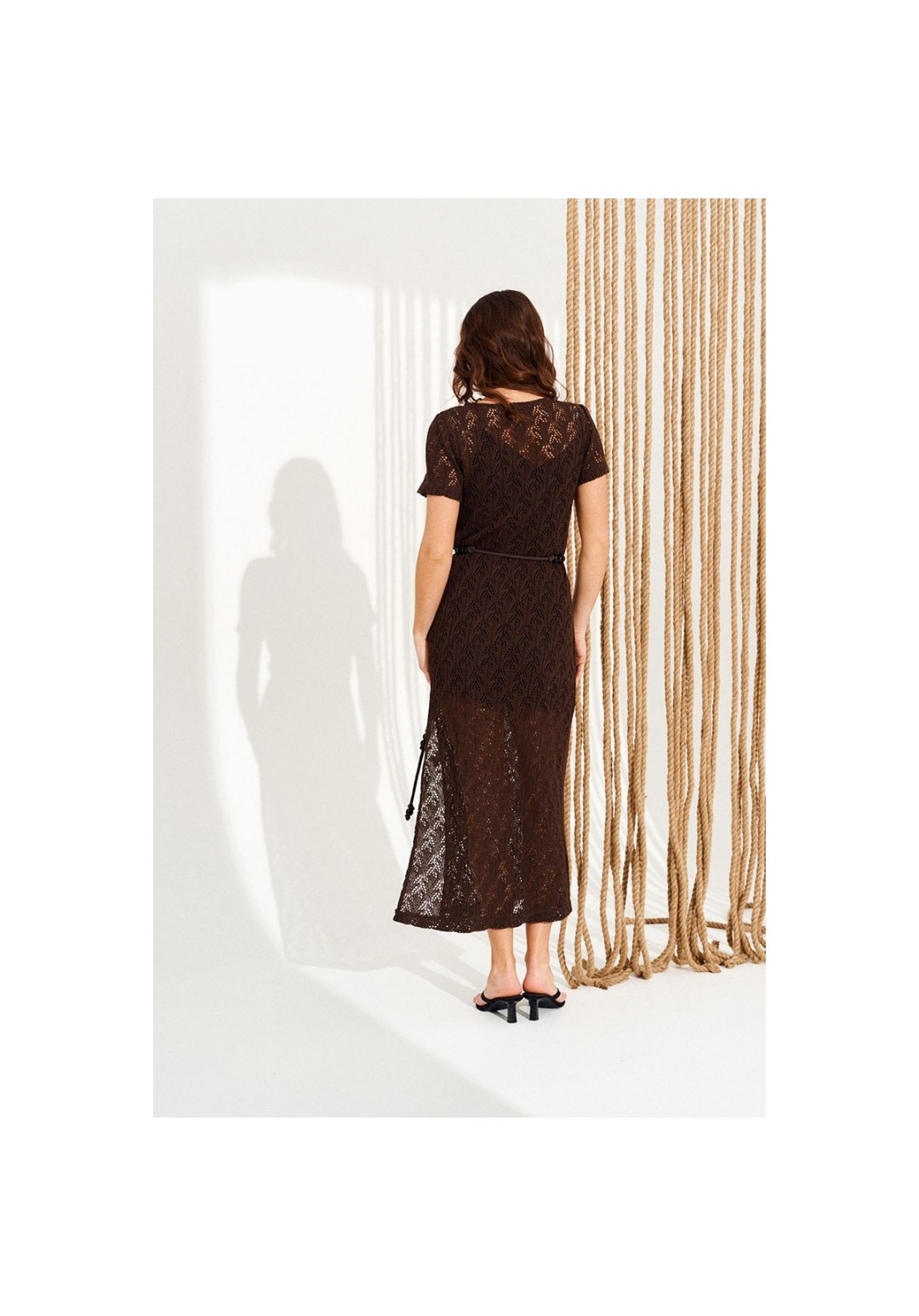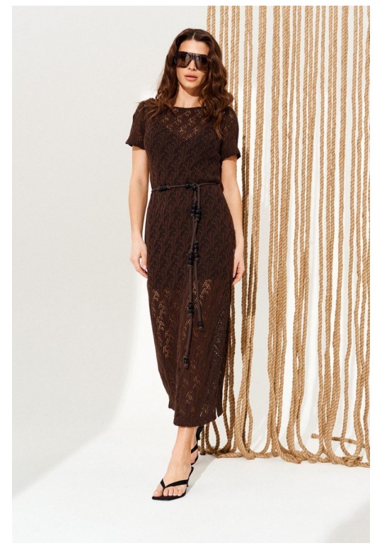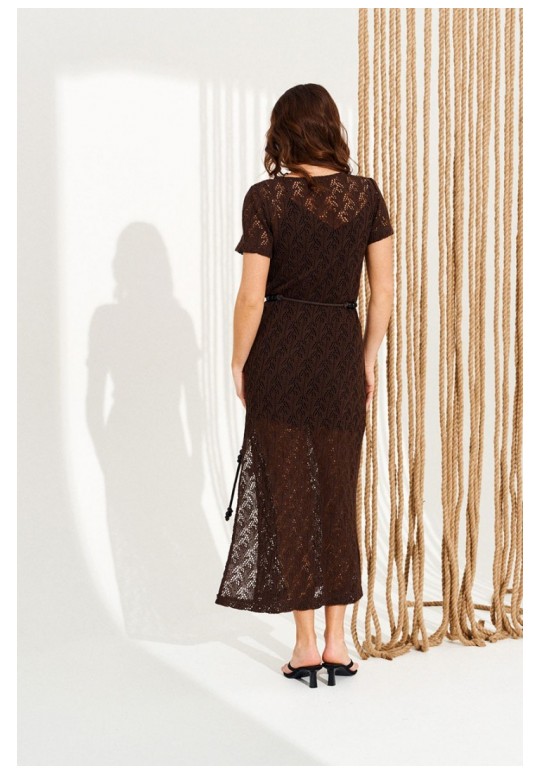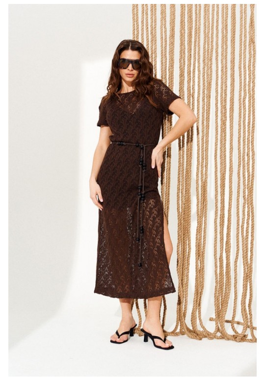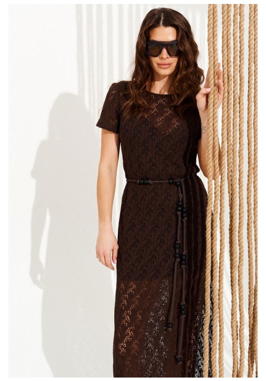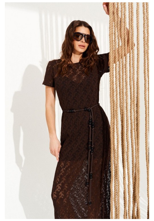 Платье из трикотажного полотна, умеренного объема, полуприлегающего силуэта, с круглым вырезом горловины. Вырез горловины обработан притачной обтачкой. Перед и спинка цельные. Левый боковой шов заканчивается разрезом. Рукав втачной, короткий. В комплекте декоративный пояс с бусинами. Нижнее платье умеренного объема, полуприлегающего силуэта, на регулируемых бретелях, с V-образным вырезом горловины. Перед с нагрудными вытачками. Длина изделия на модели вдоль середины спинки — 132 см (допустимое отклонение +/- 1 см)