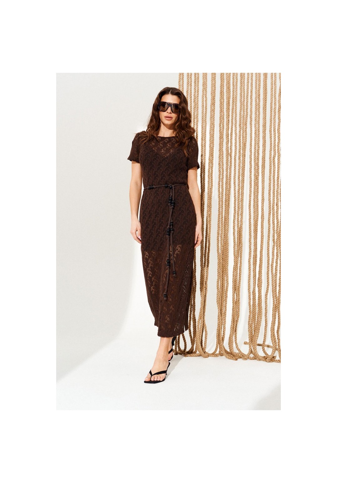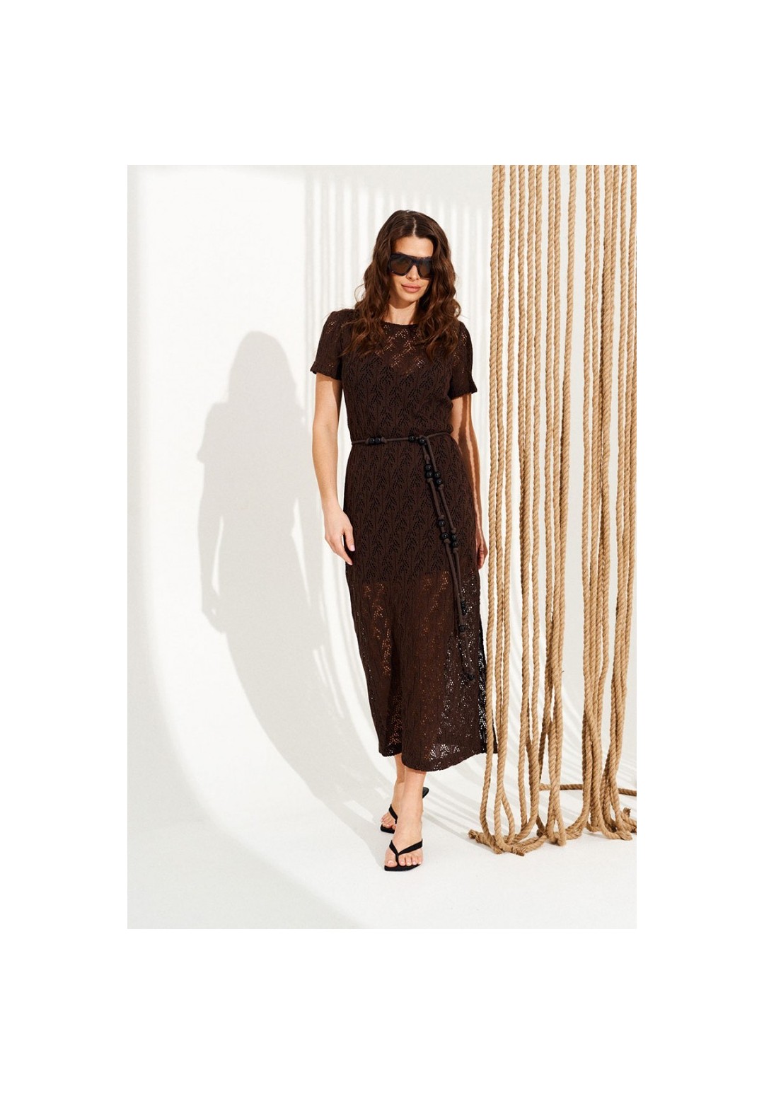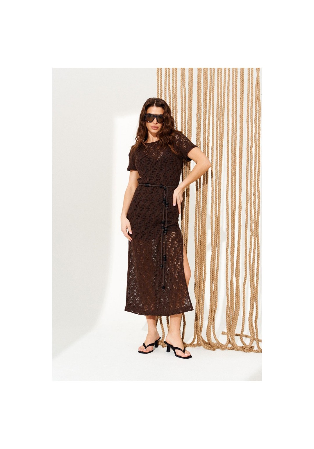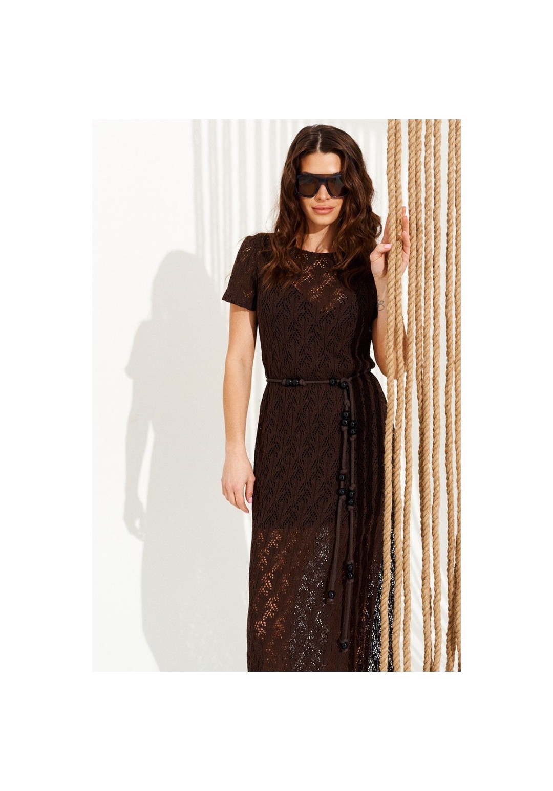 Платье из трикотажного полотна, умеренного объема, полуприлегающего силуэта, с круглым вырезом горловины. Вырез горловины обработан притачной обтачкой. Перед и спинка цельные. Левый боковой шов заканчивается разрезом. Рукав втачной, короткий. В комплекте декоративный пояс с бусинами. Нижнее платье умеренного объема, полуприлегающего силуэта, на регулируемых бретелях, с V-образным вырезом горловины. Перед с нагрудными вытачками. Длина изделия на модели вдоль середины спинки — 132 см (допустимое отклонение +/- 1 см)