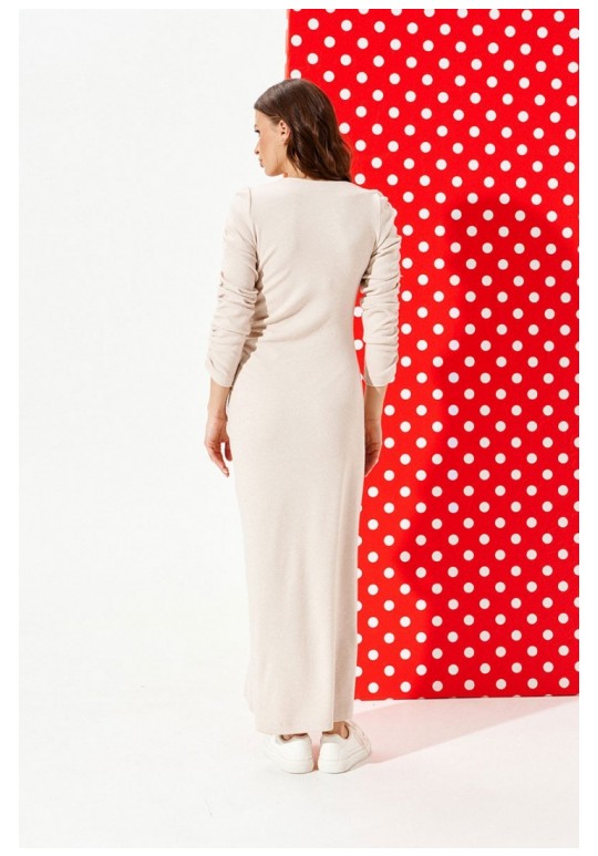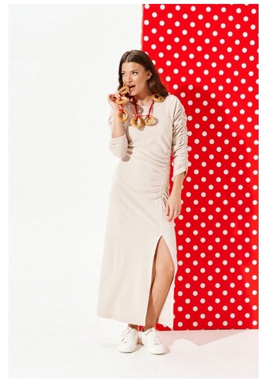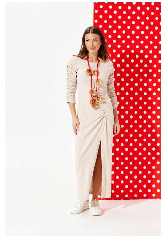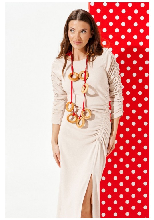 Платье из трикотажного полотна прилегающего силуэта с круглым вырезом горловины. Вырез горловины обработан обтачками и отделочной строчкой. Перед с нагрудными вытачками, рельефом со сборкой на резинку и разрезом. Спинка цельная. Рукав втачной, двухшовный, со сборкой на резинку.