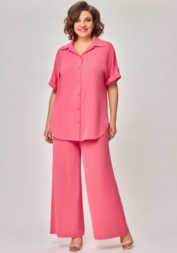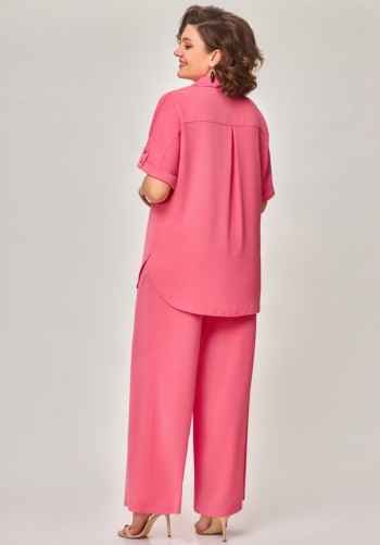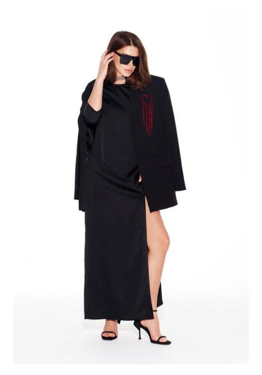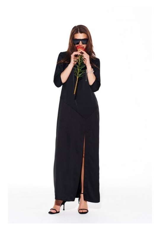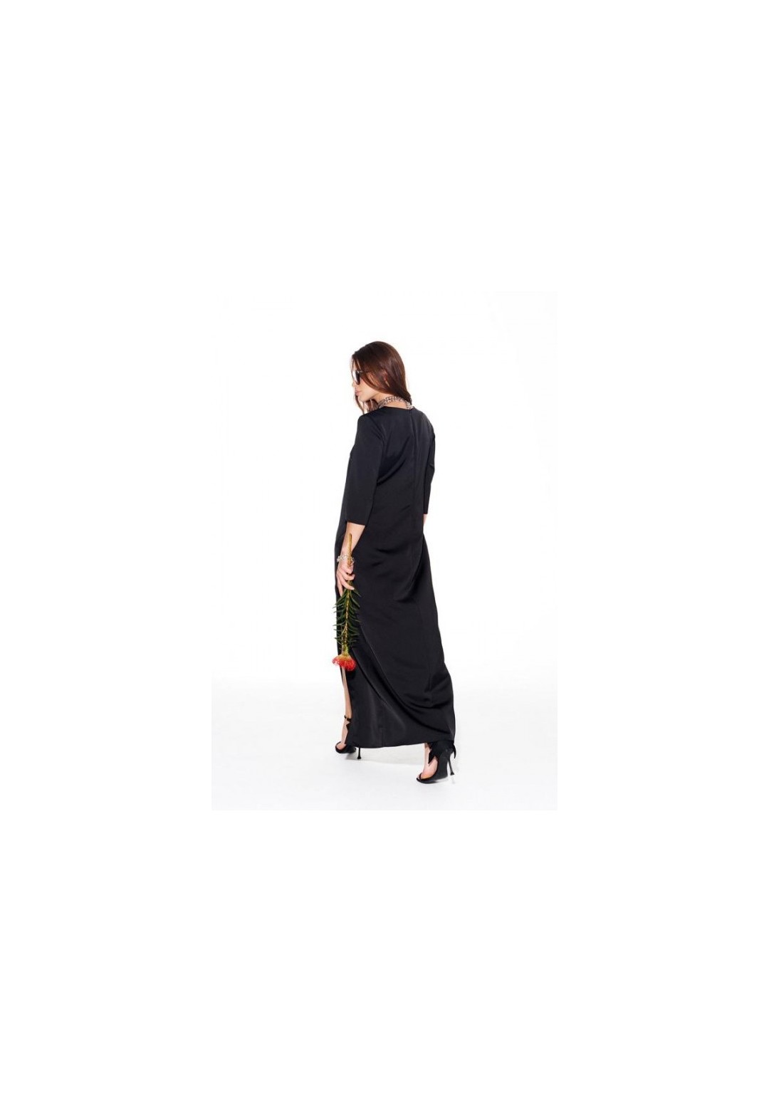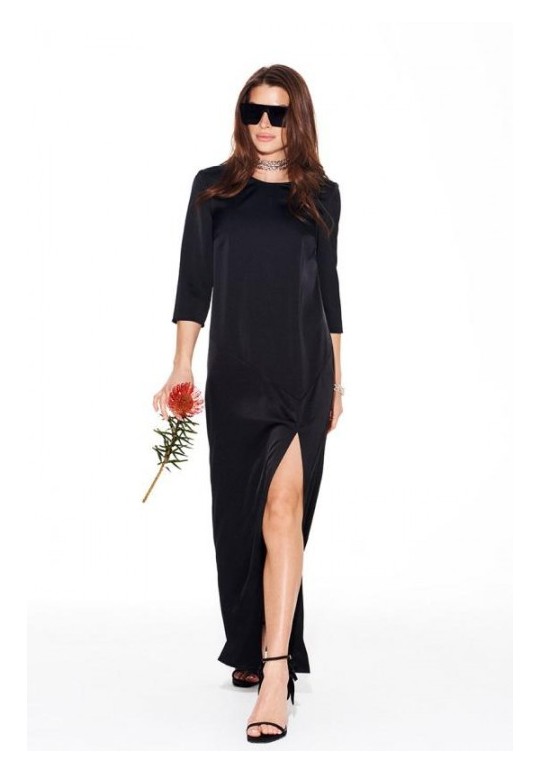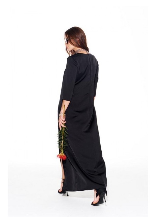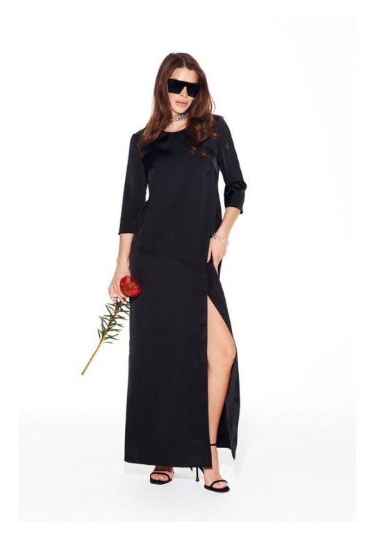 Платье из струящейся ткани с блеском, умеренного объема, прямого силуэта, с круглым вырезом горловины. Перед с нагрудными вытачками и фигурным подрезом. Нижняя часть переда с разрезом. Спинка со средним швом и застежкой на потайную тесьму-молнию. Рукав 3/4, втачной, одношовный.