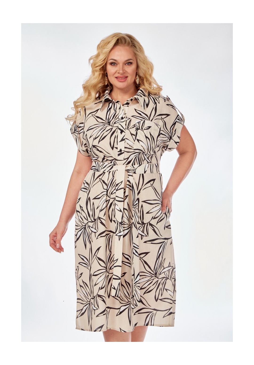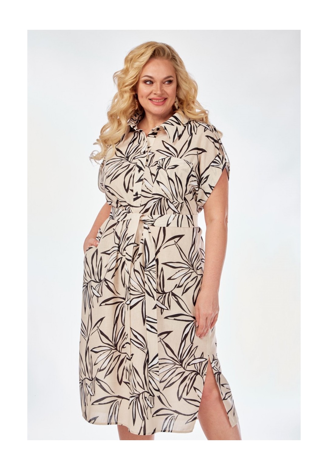 Элегантное и женственное платье рубашечного типа. Выполнено из легкой принтованной ткани, что придаст вашему образу оригинальность. Платье со спущенной линией плеча. По переду выполнена планка с застежкой на петли и пуговицы по длине лифа. В боковых швах карманы. Воротник рубашечный. Рукав цельнокроенный подхвачен патой на пуговице. По низу платья разрезы в боковых швах. В комплекте прилагается съемный пояс из основной ткани.