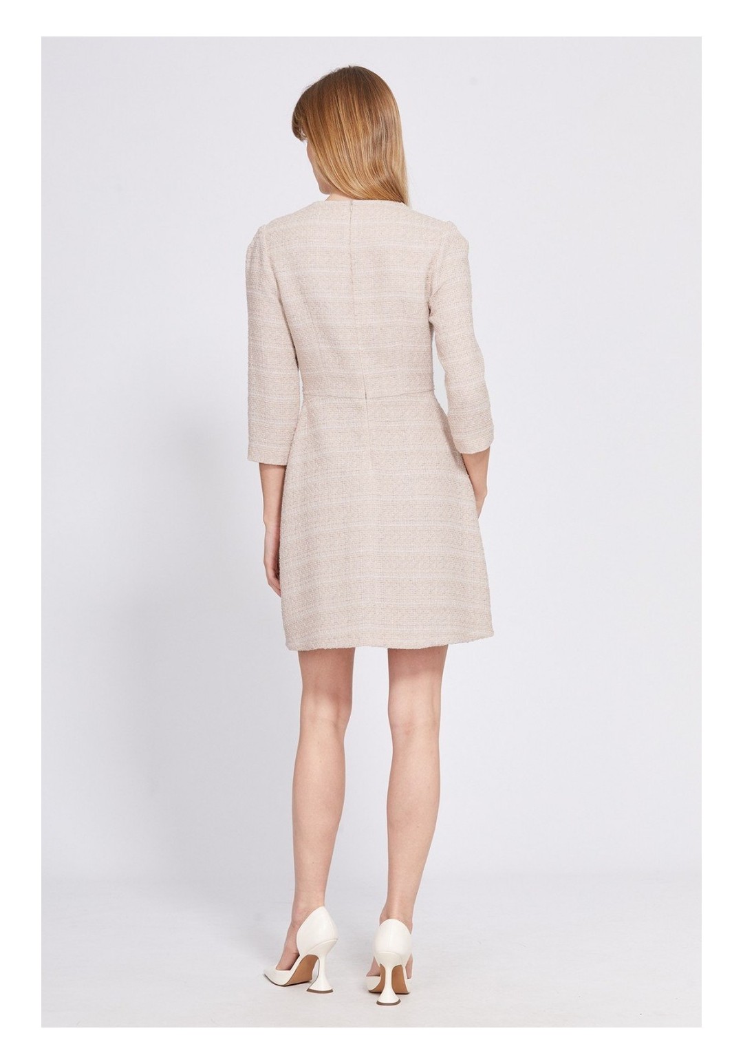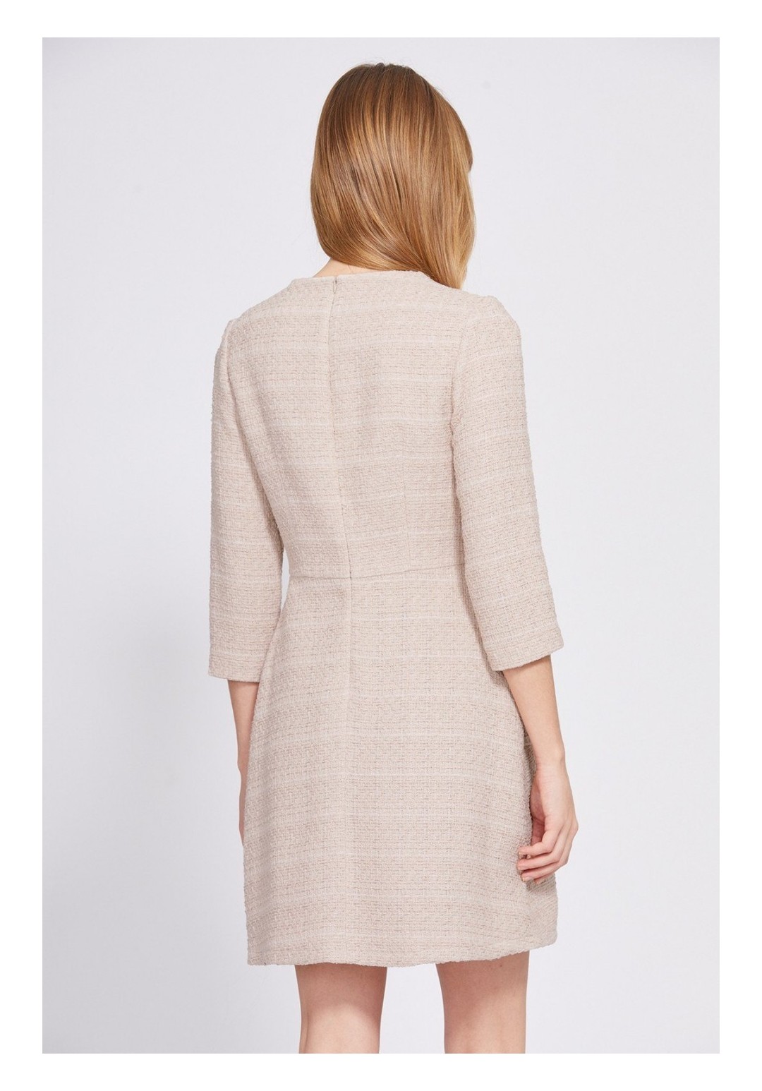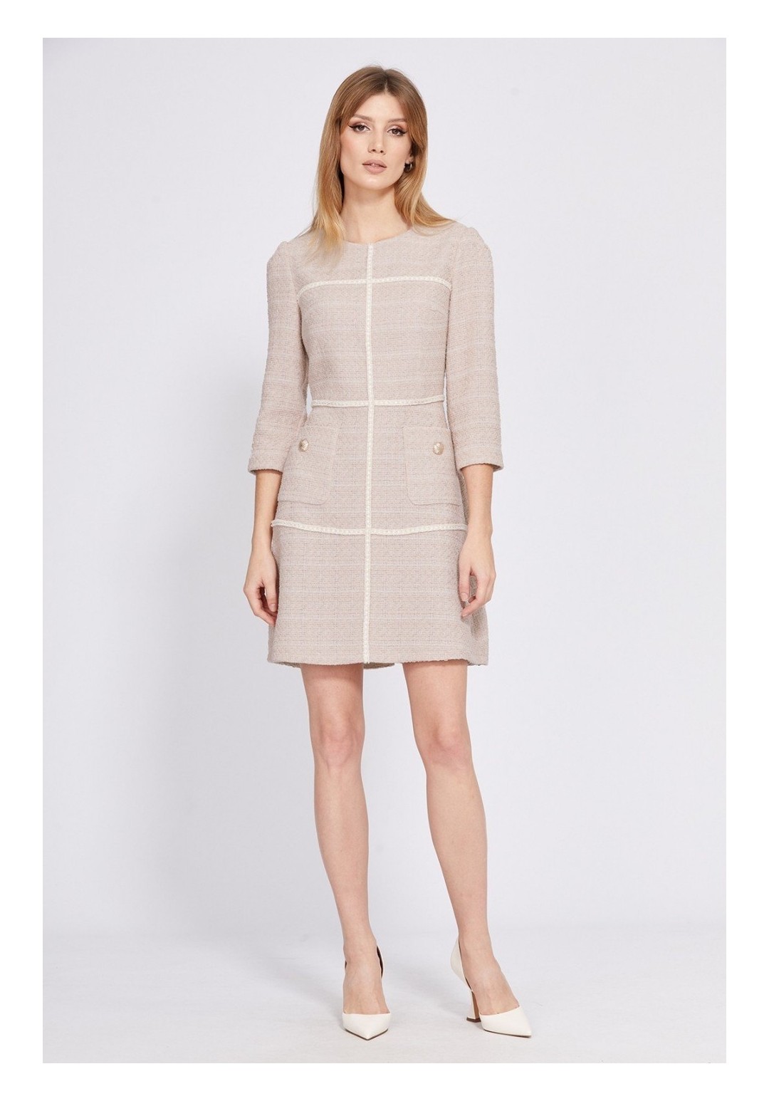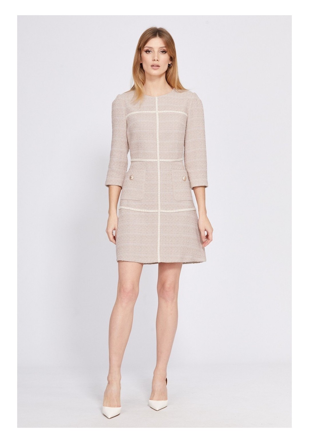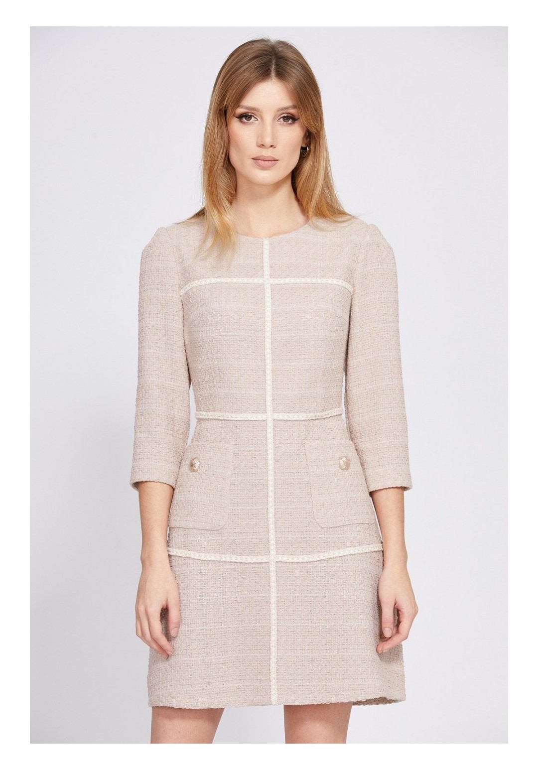 Платье выполнено из твида. Платье Х-образного силуэта, отрезное по линии талии, длиной выше линии колена. Застежка на потайную молнию в среднем шве спинки. Горловина округлой формы. Рукав втачного покроя, одношовный, длиной 3/4. Юбка расширена к низу. По переду два кармана с пуговицами. Заднее полотнище со средним швом. Платье на отлетной по низу подкладке. Платье декорировано тесьмой. Длина платья: р.42-46 - 88 см. Длина рукава: р.42-46 - 47 см. Гарантийный срок не установлен. Гост 25294 - 2003