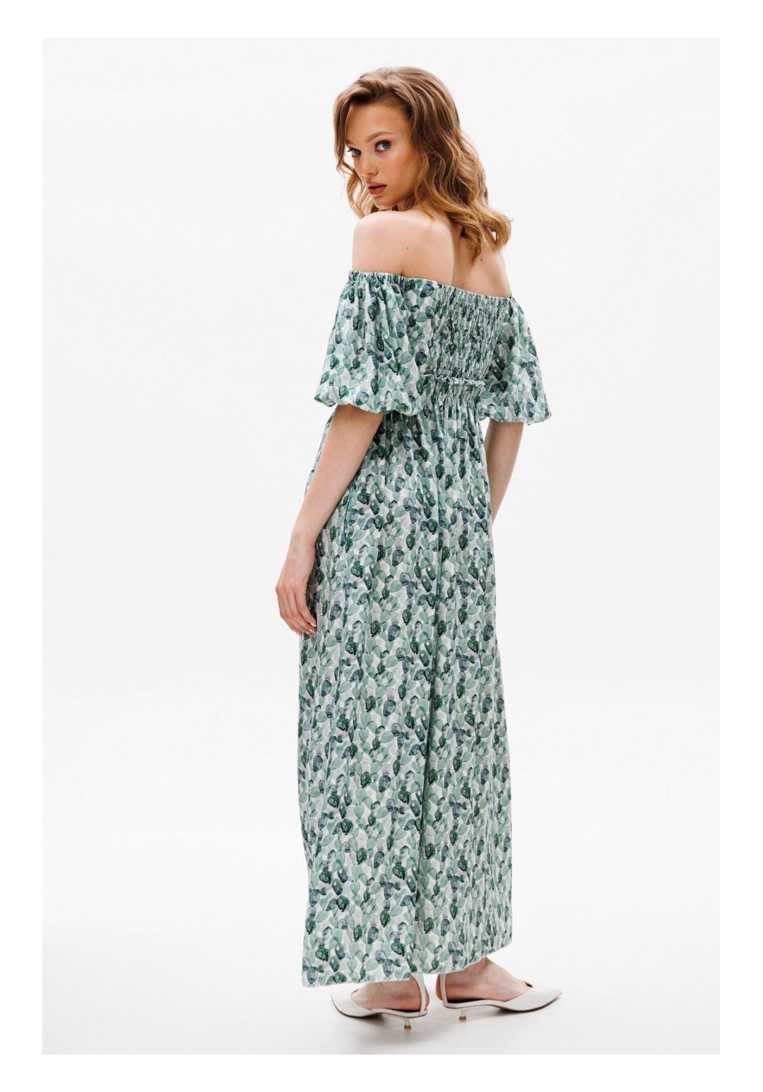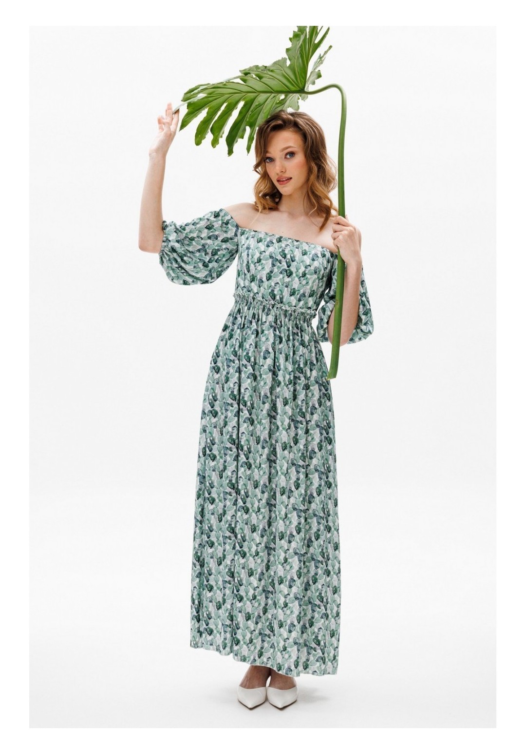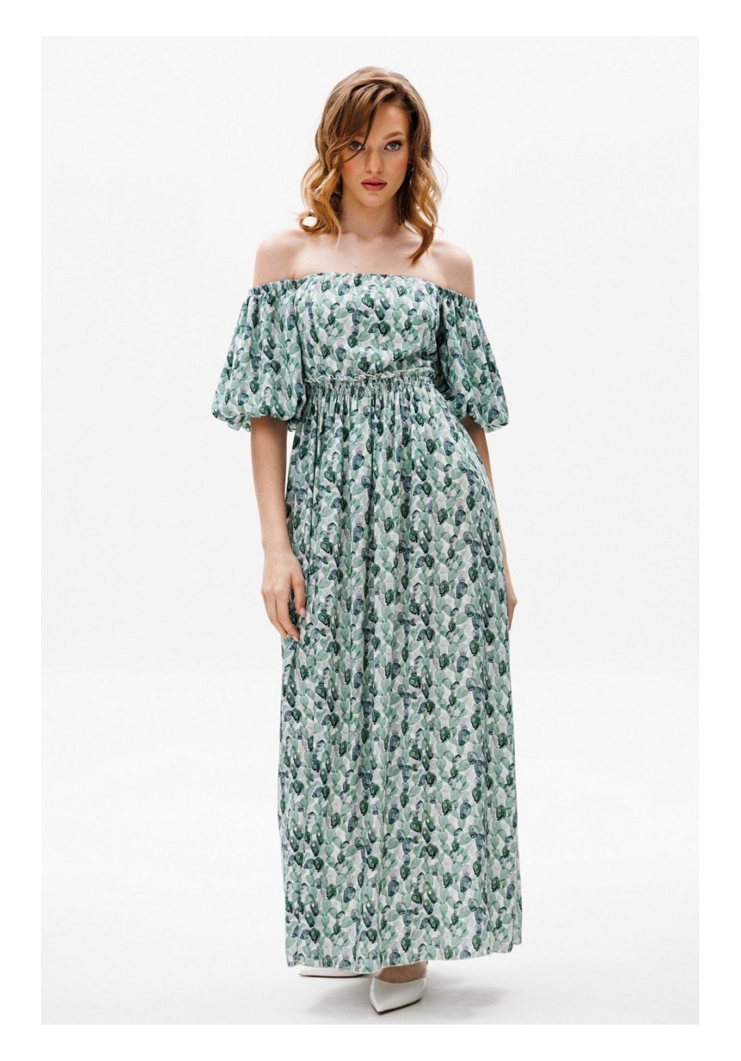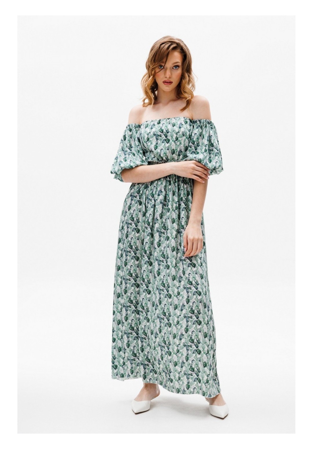 Платье выполнено из плательной ткани. Платье Х-образного силуэта. Центральная часть спинки собрана на венгерку. Рукав длиной до линии локтя, одношовный, расширенный. Верх и низ рукава обработаны эластичной тесьмой. Юбка расширена к низу. В боковых швах обработаны карманы. Юбка настрочена на лиф. Лиф платья на подкладке. Длина платья: 122 сДлина рукава: 36 с Гарантийный срок не установлен ГОСТ 25294-2003