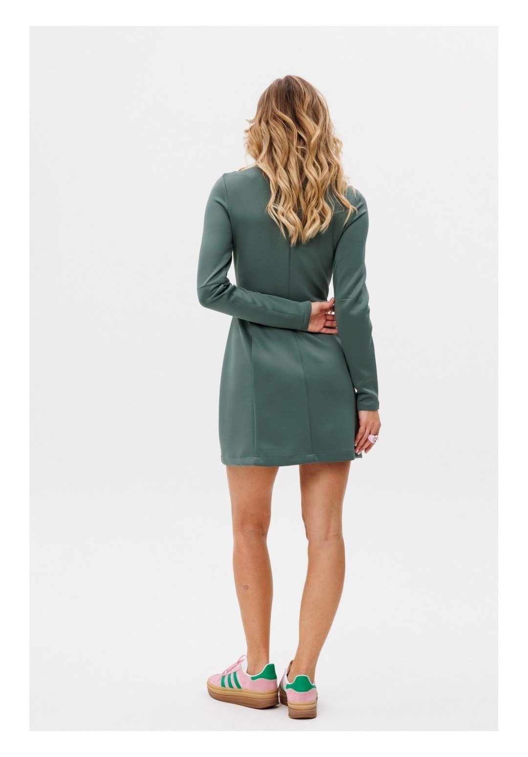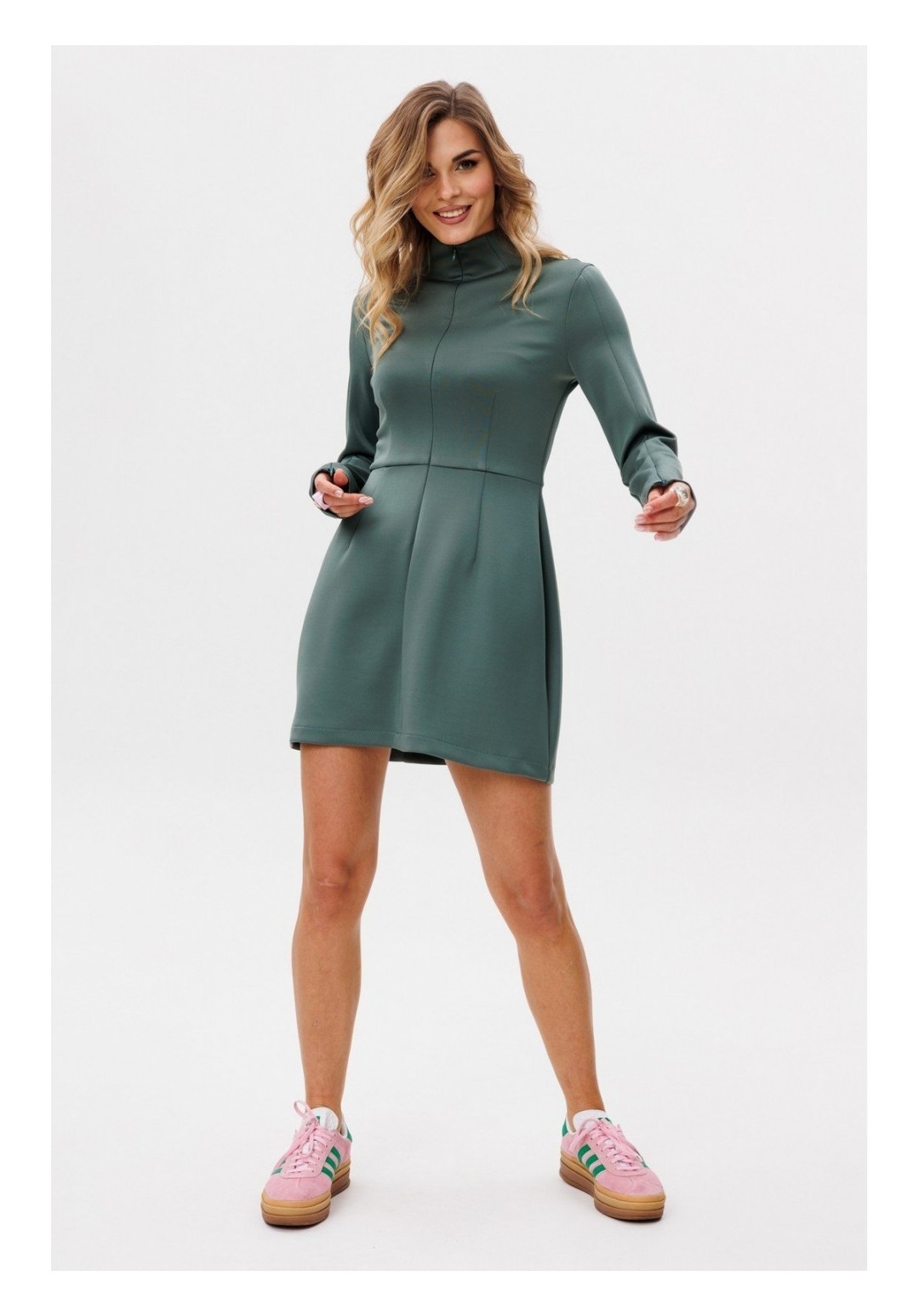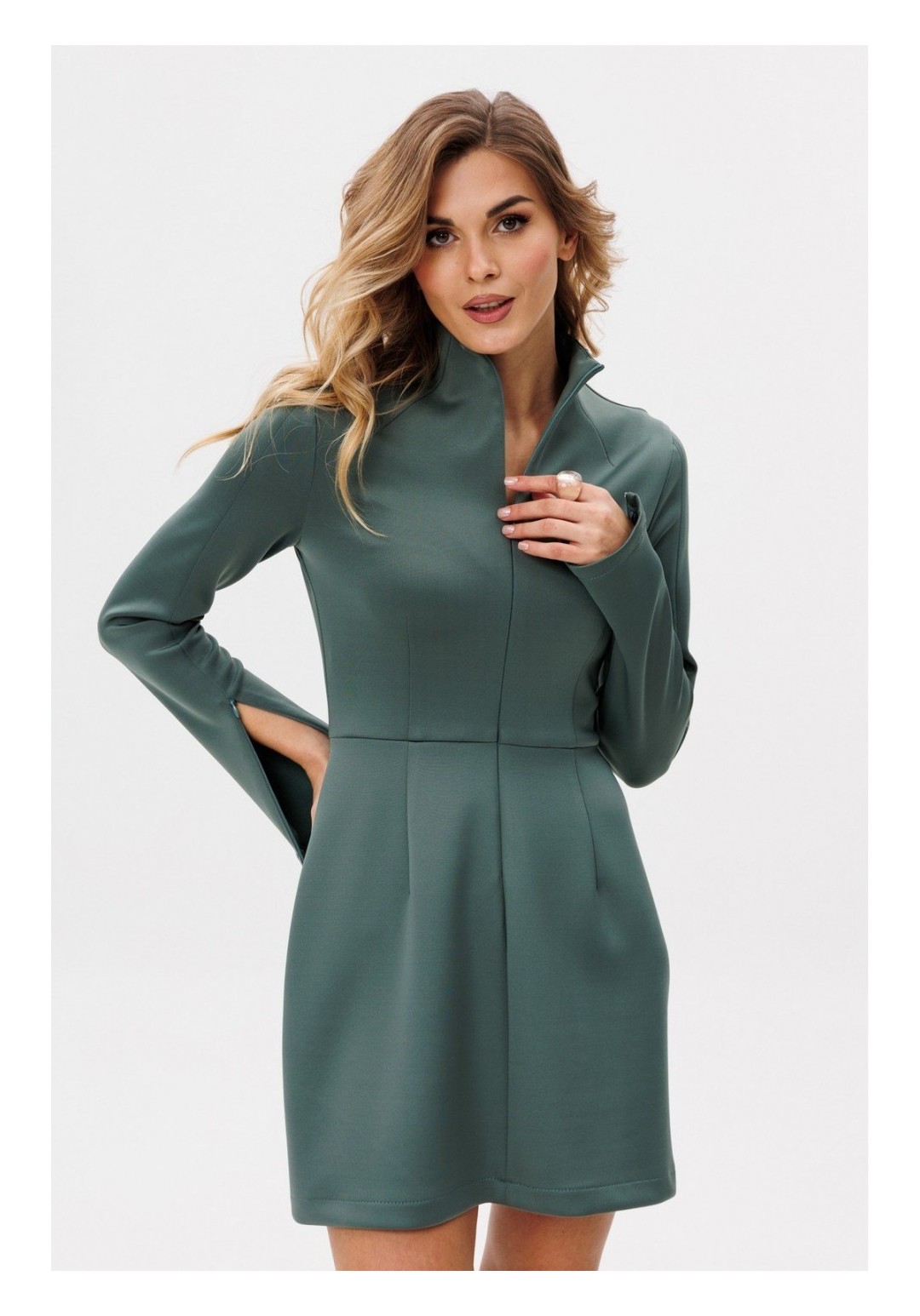 Изысканное женское платье зеленого цвета, выполненное из качественного трикотажного полотна. Платье приталенного силуэта, отрезное по линии талии, идеально подчеркивает фигуру. Длина модели чуть выше колена создает элегантный и современный образ. У платья цельнокроеная стойка и лаконичный средний шов с потайной молнией спереди, что добавляет изделию аккуратности. Рукава длинные, втачные с локтевой вытачкой и декоративной потайной молнией в переднем шве, обеспечивая оригинальную деталь в дизайне. Это платье является отличным выбором для стильных и утонченных образов. Длина платья: 86 см. Длина рукава: 66 см