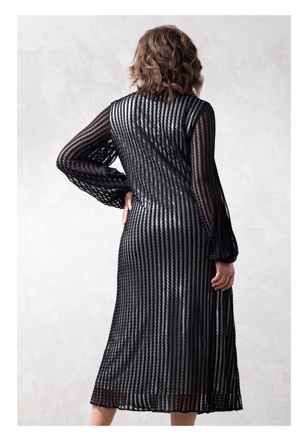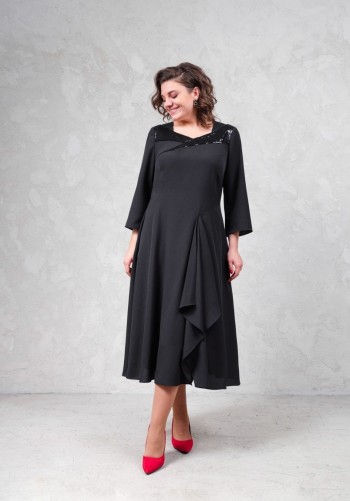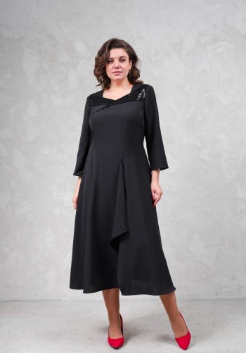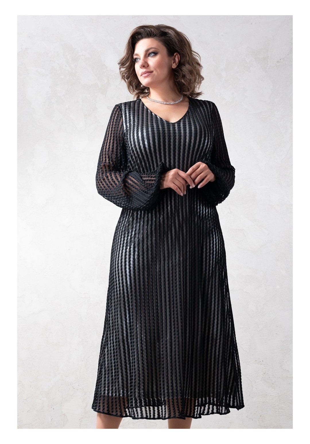 Вечернее кружевное платье свободного кроя. Основная ткань - мягкая трикотажная сетка с кружевом, хорошо тянется. Нижний слой платья трикотаж средней плотности с матовым блеском. Длина изделия по спинке 125 см, длина рукава 70 см(с учетом напуска). Рукав свободный, низ на резинке.