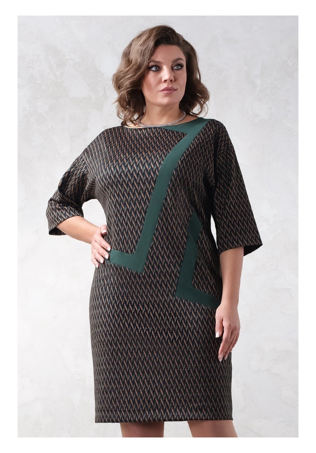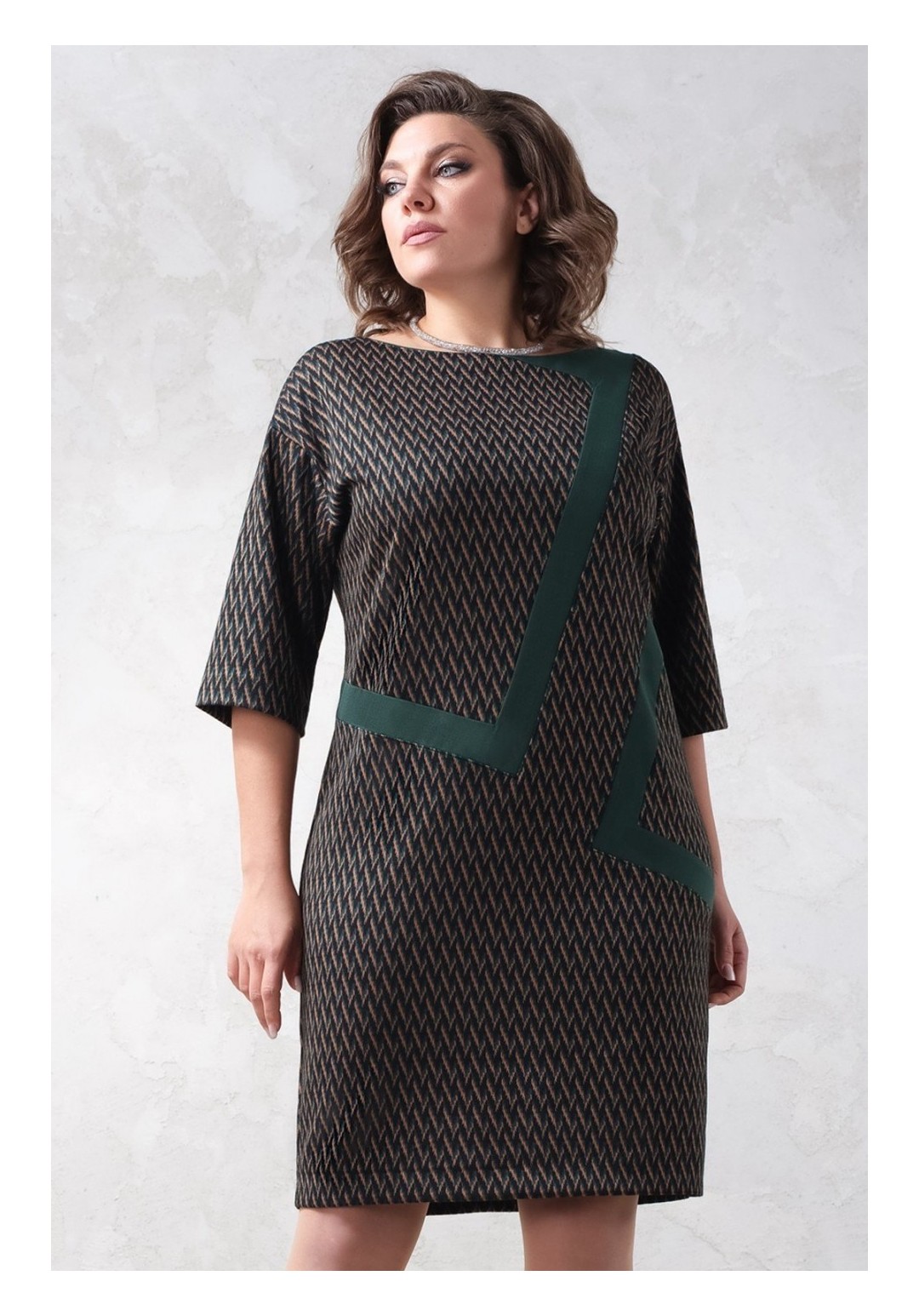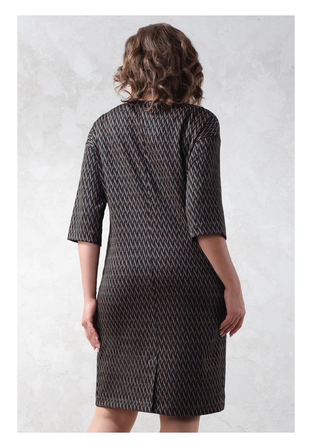 Трикотажное платье полуприлегающего силуэта. Трикотаж плотный, но эластичный. Рукав втачной на спущенной пройме. Длина рукава 3/4. В среднем шве спинки шлица. Длина 102 см.