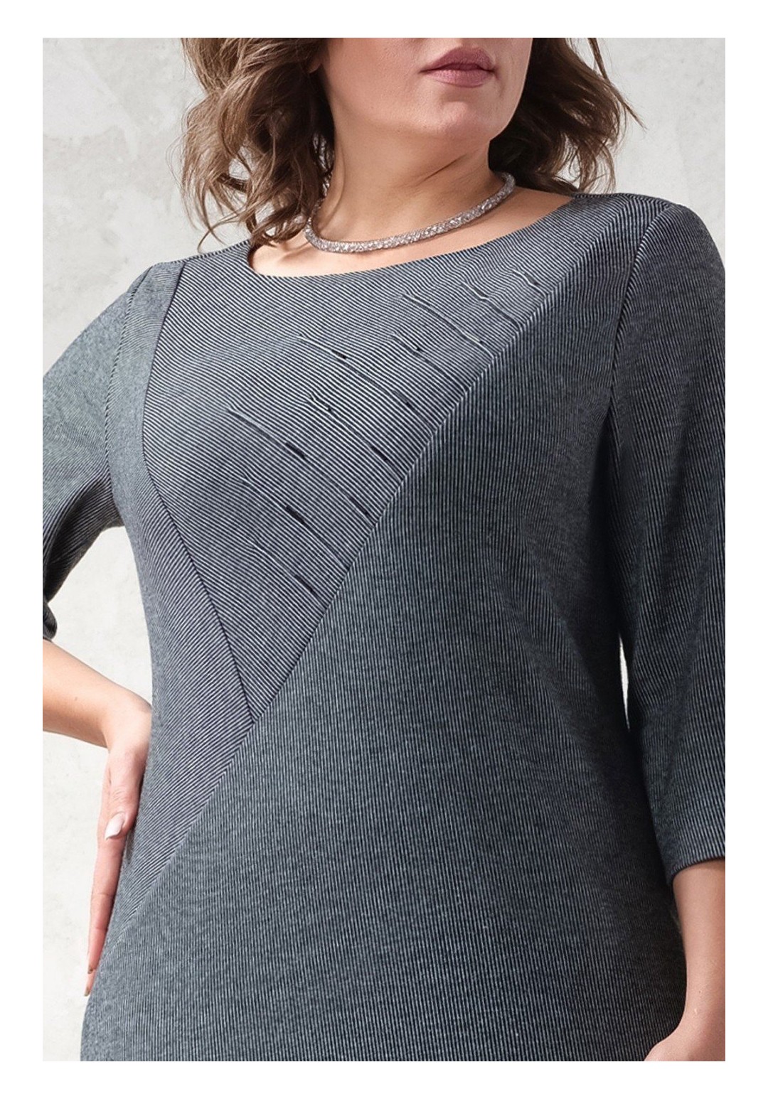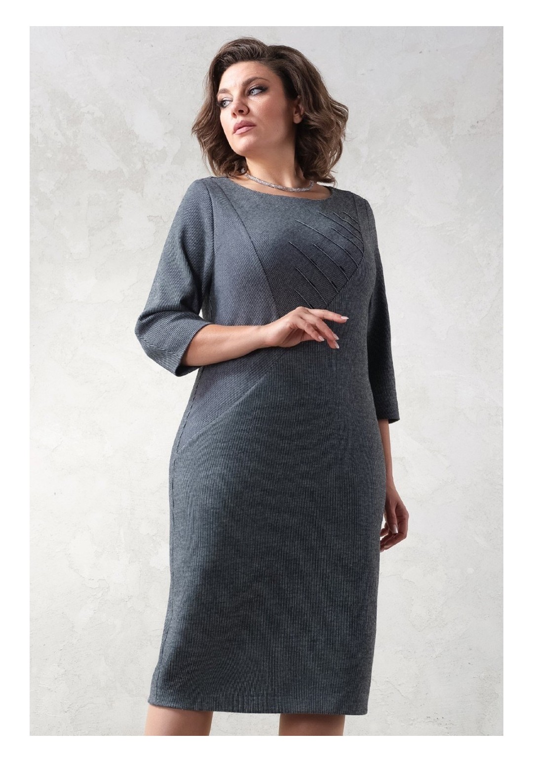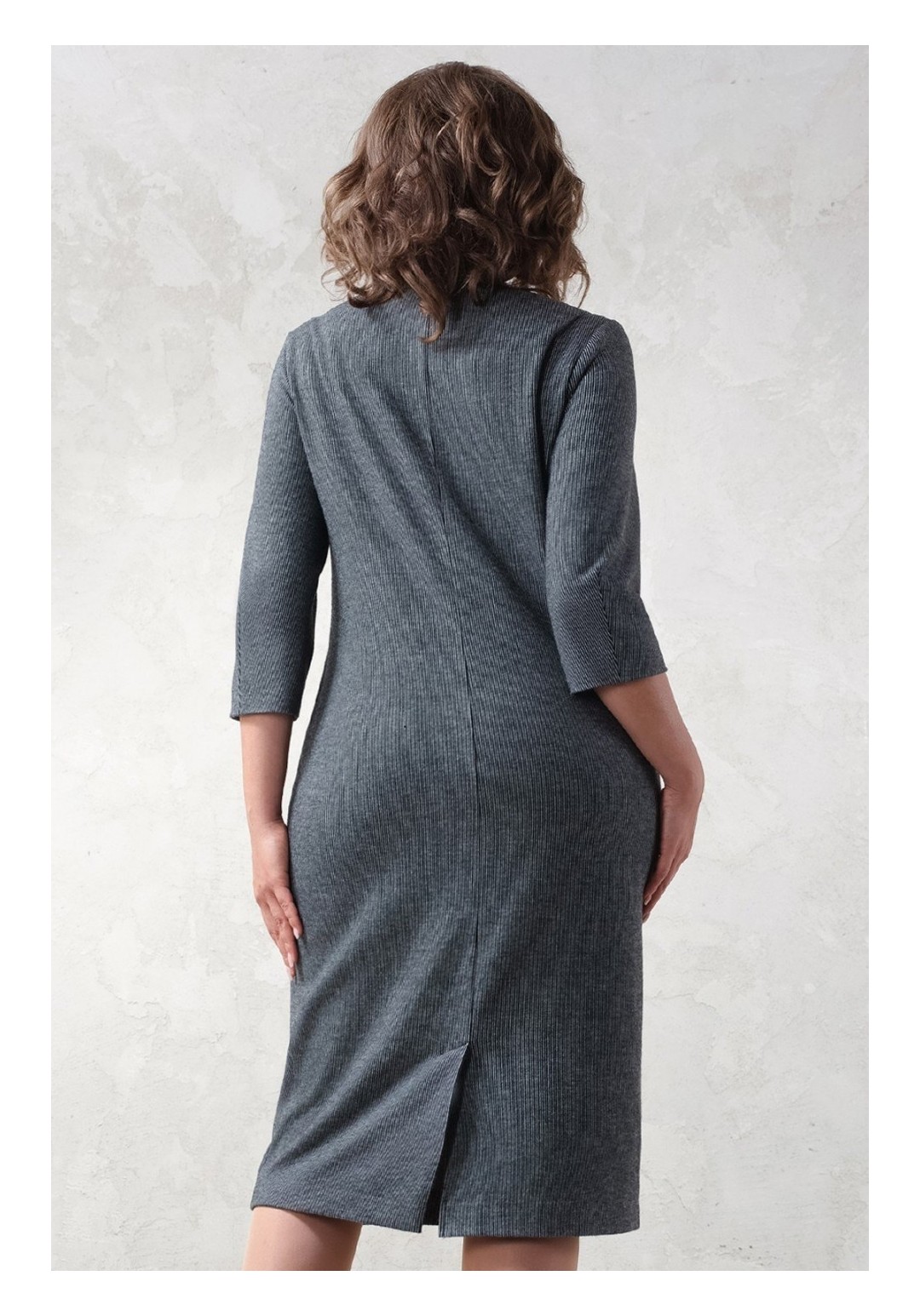 Теплое, нарядное, трикотажное платье полуприлегающего силуэта. Трикотаж плотный, но мягкий, приятный на ощупь, хорошо тянется. В среднем шве спинки шлица. Длина по спинке 108 см, длина рукава 46 см.