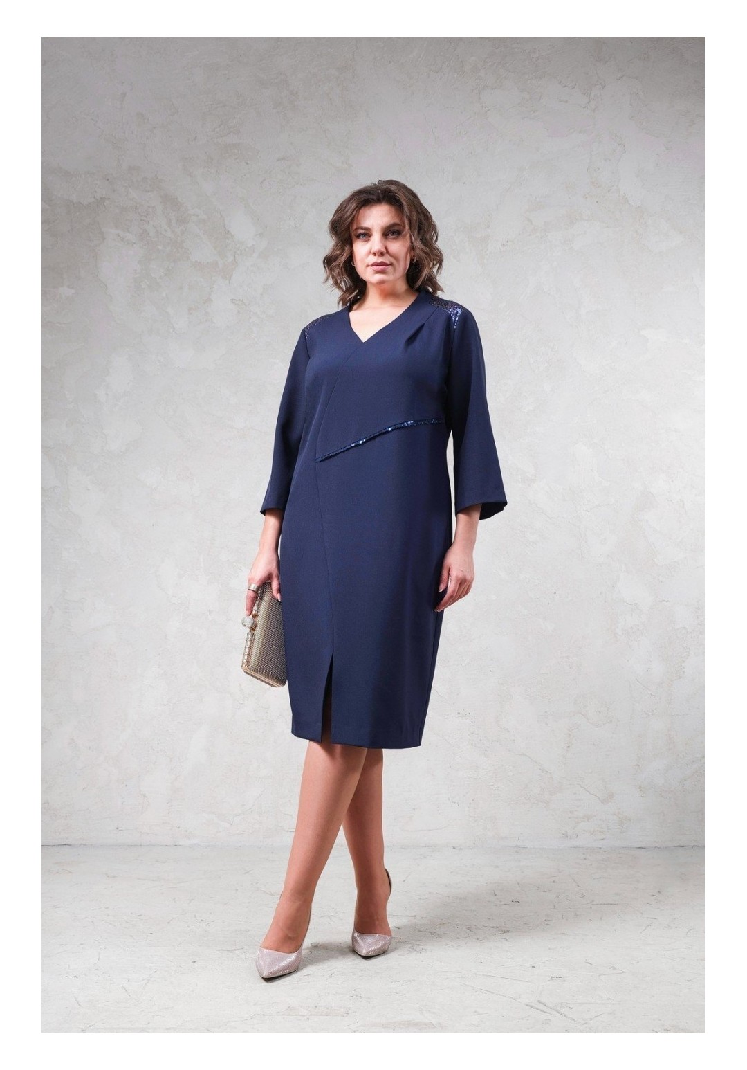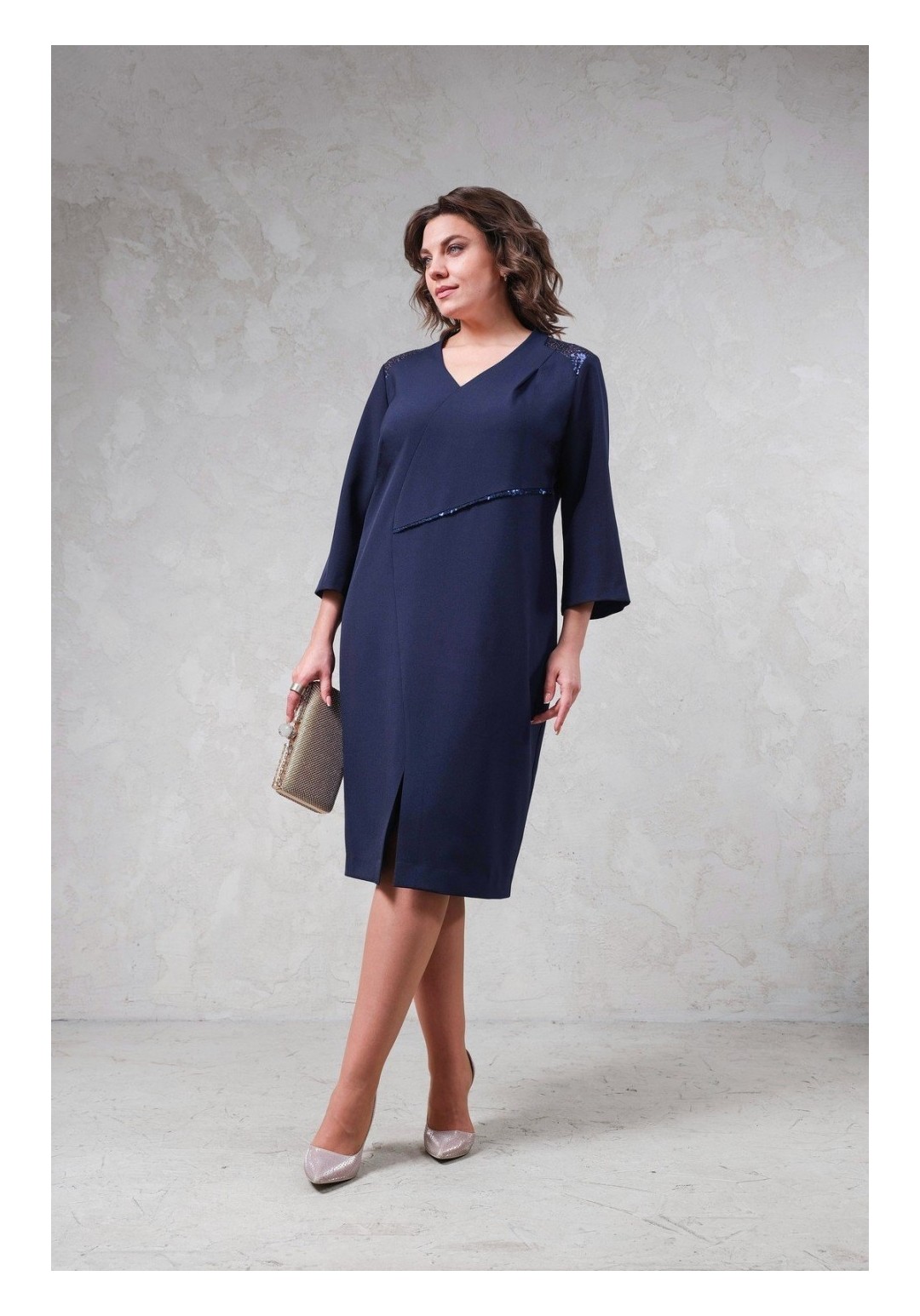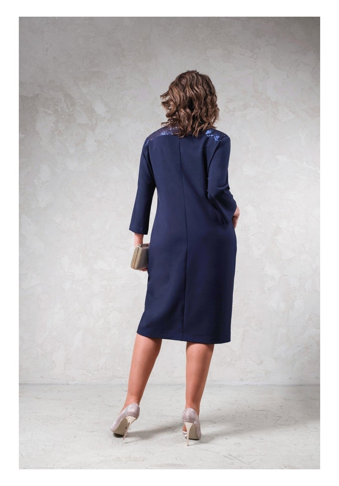 Элегантное женское платье изысканного темно-синего цвета. Модель наполнена изяществом благодаря полуприлегающему силуэту и длине изделия 110 см. Дизайн платья включает в себя V-образный вырез, который подчеркивает линию шеи, а декоративный подрез по линии талии украшен эффектной вставкой из пайеток, добавляя блеска и праздничности. Рукав 3/4, втачной и расширенный к низу, элегантно дополняет образ. Сзади привлекает внимание декоративная кокетка из пайеток, которая гармонично переходит на полочку, придавая наряду особый стиль и изысканность. Наличие центрального разреза спереди добавляет утонченности и подвижности. Это платье станет идеальным выбором для вечерних мероприятий и торжественных событий, подчеркивая ваше чувство стиля и изящество.