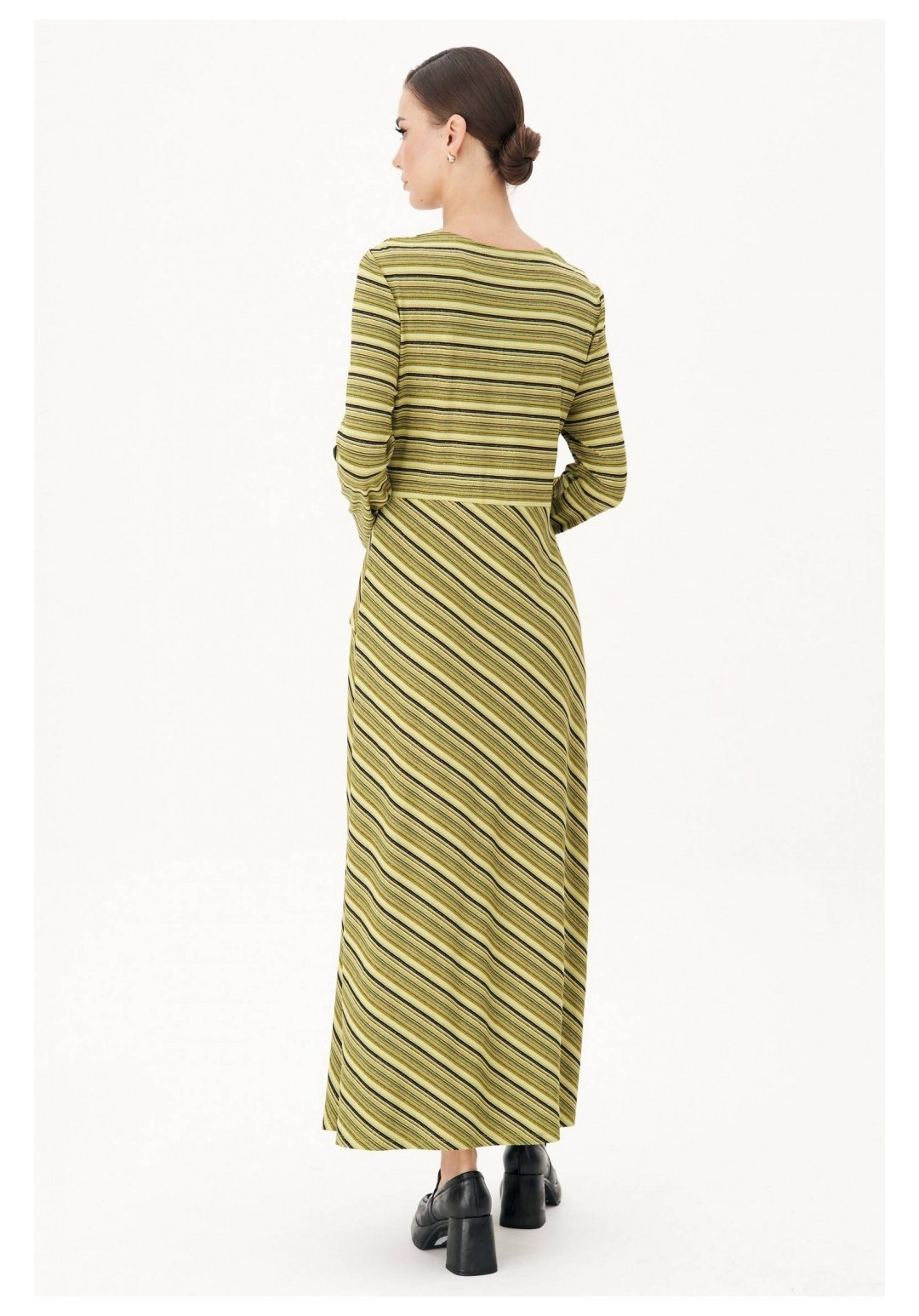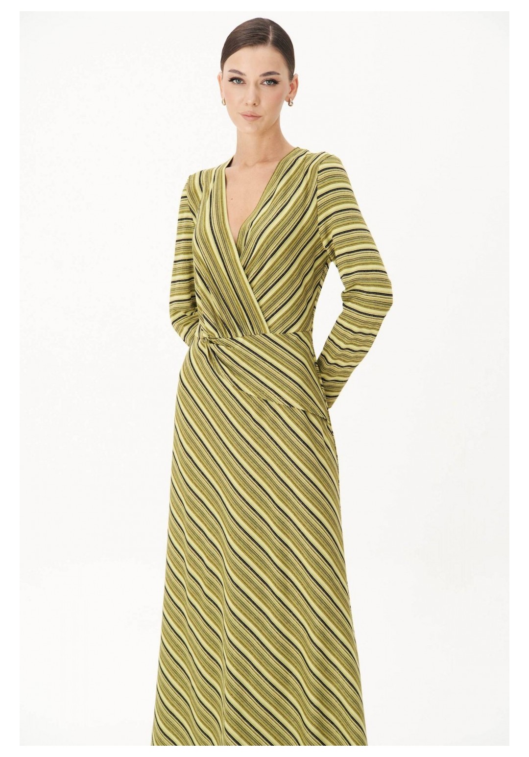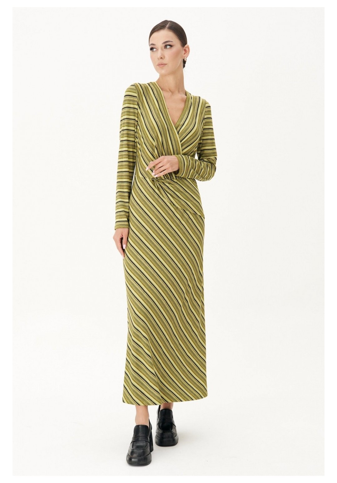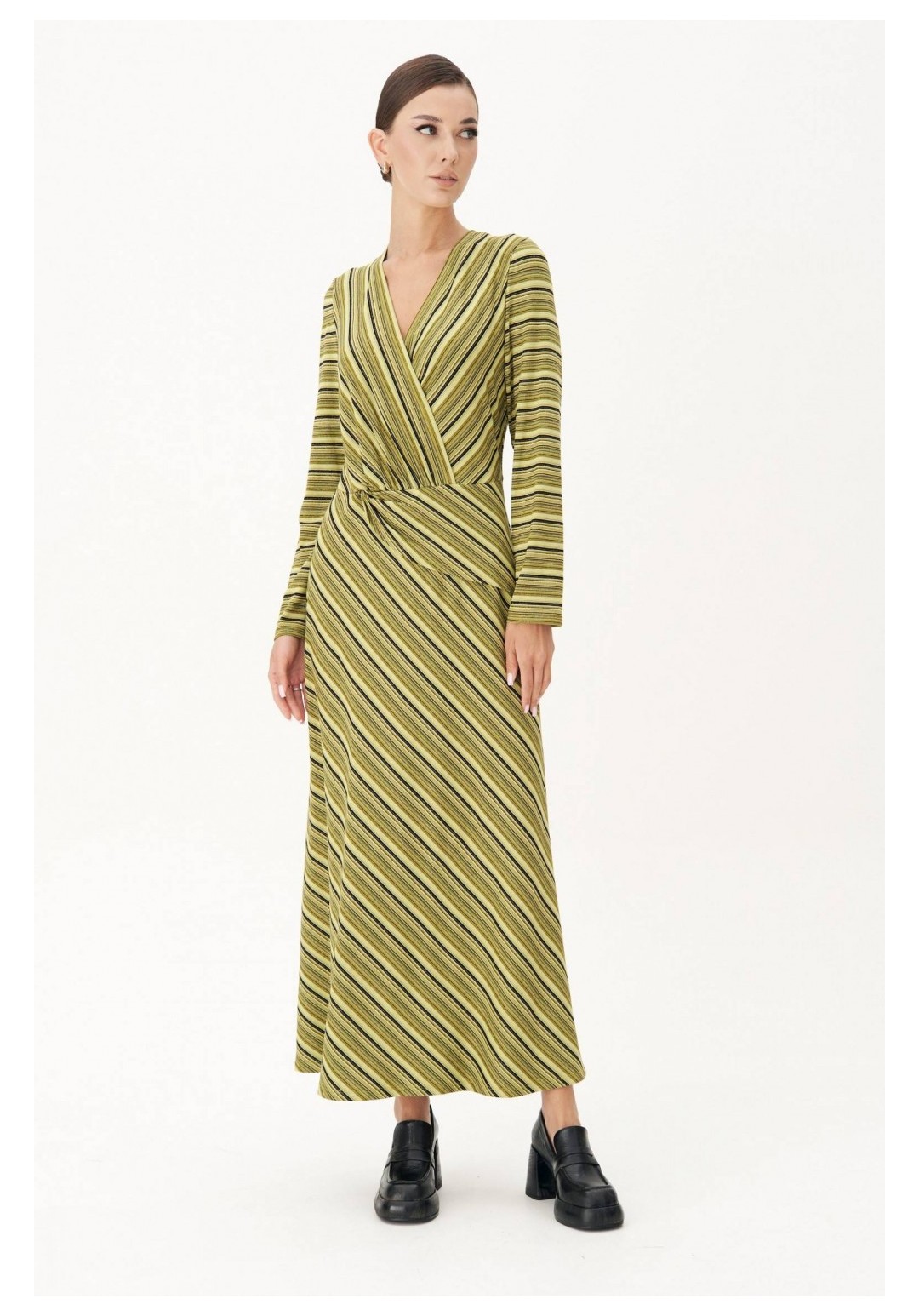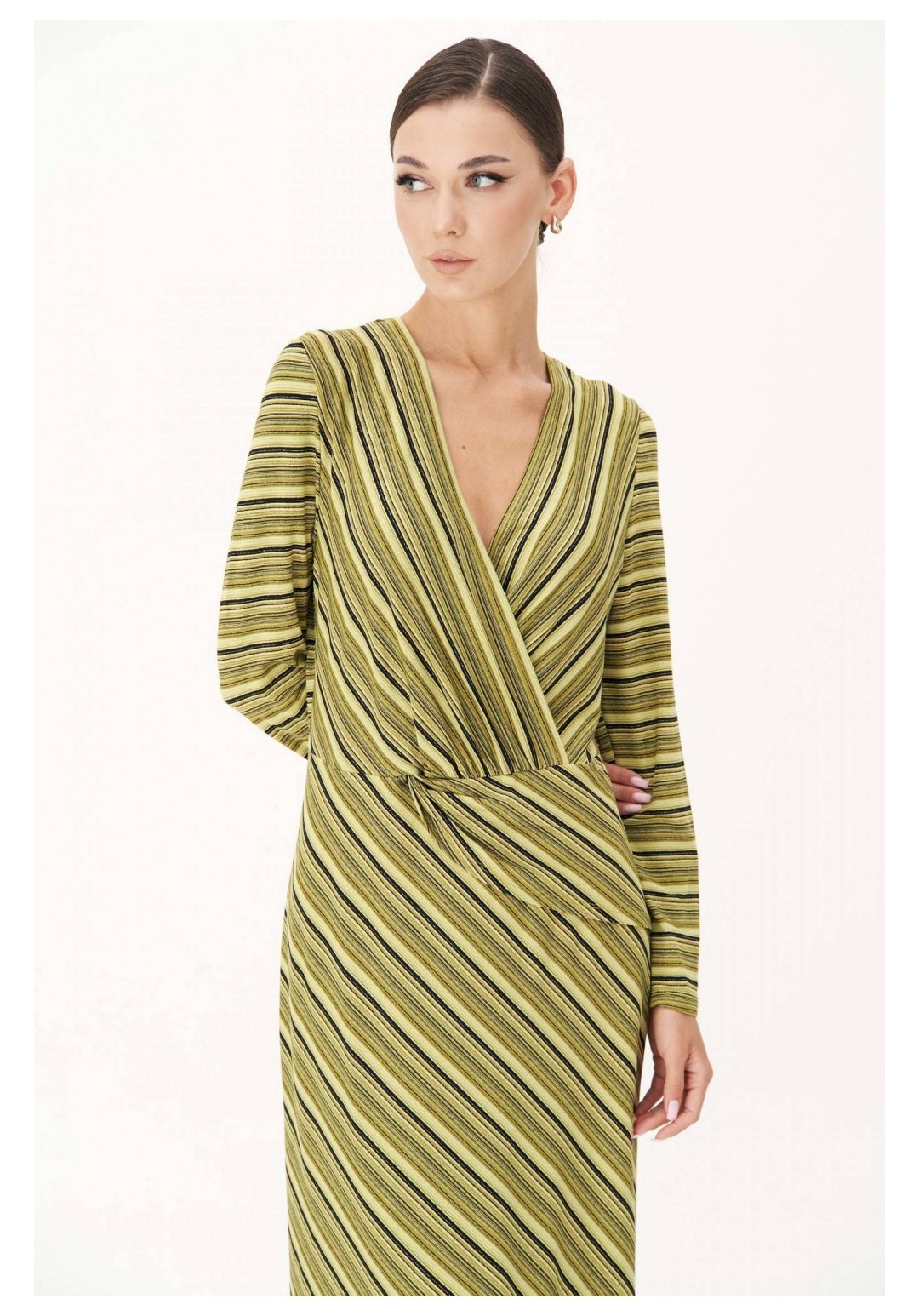 Модное платье - настоящее спасение для нерешительных. Не надо думать, что с чем сочетать, просто надевай его и выгляди не просто привлекательно, но и актуально. Мега удобное трикотажное платье в актуальную полоску. Полуприлегающий силуэт, втачной покрой. Полочка с отрезным лифом, сложным запахом и отделочной деталью. Спинка с отрезным лифом. Юбка в диагональном направлении, что придаёт модели дополнительную пластичность. Длина платья около 128 см. Длина рукава около 62 см.