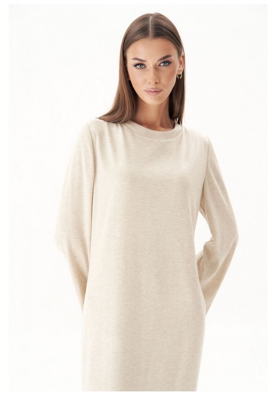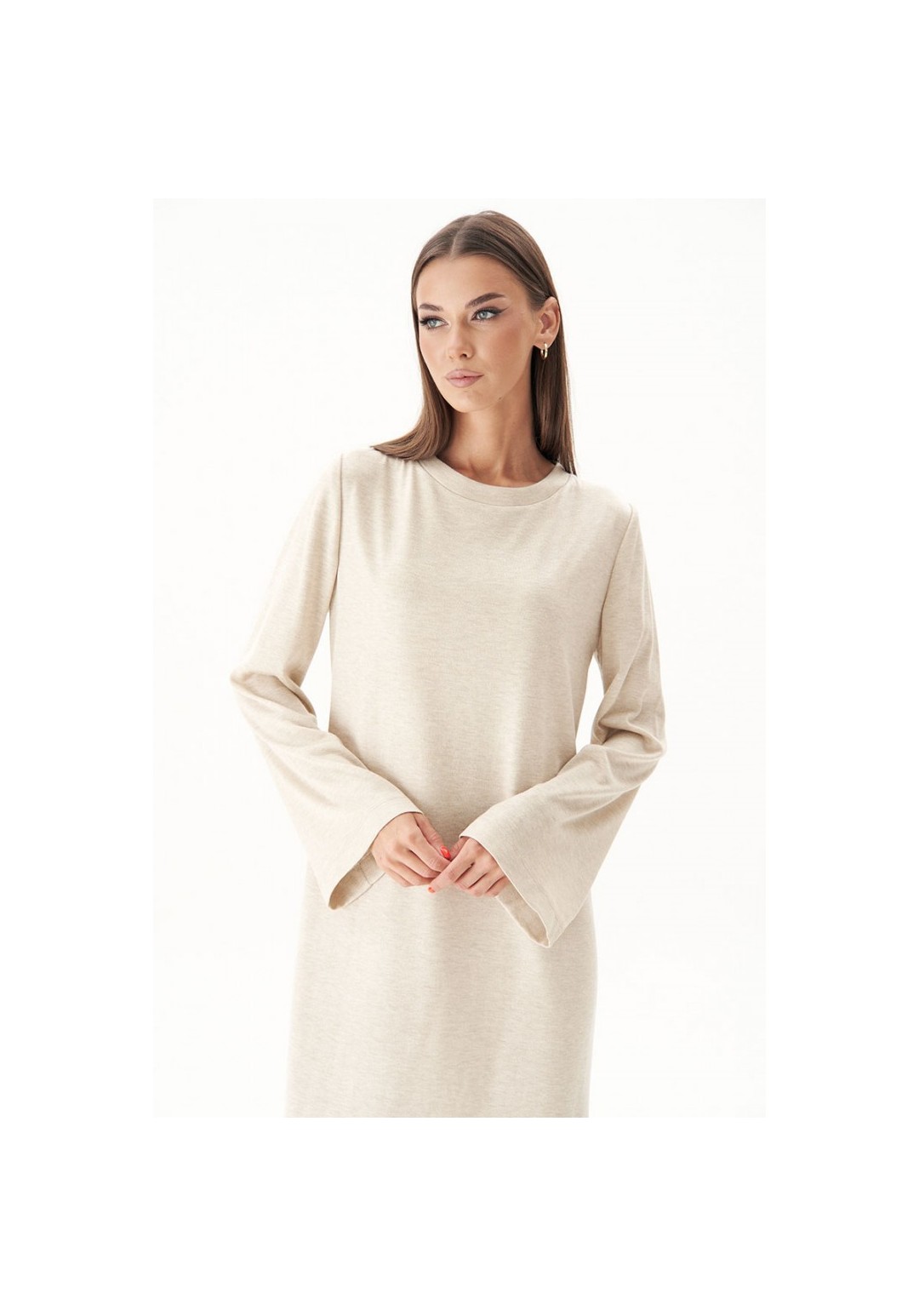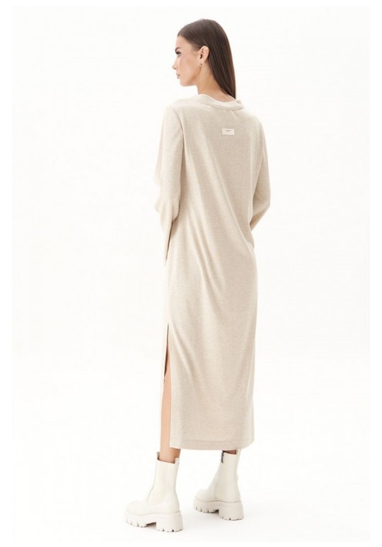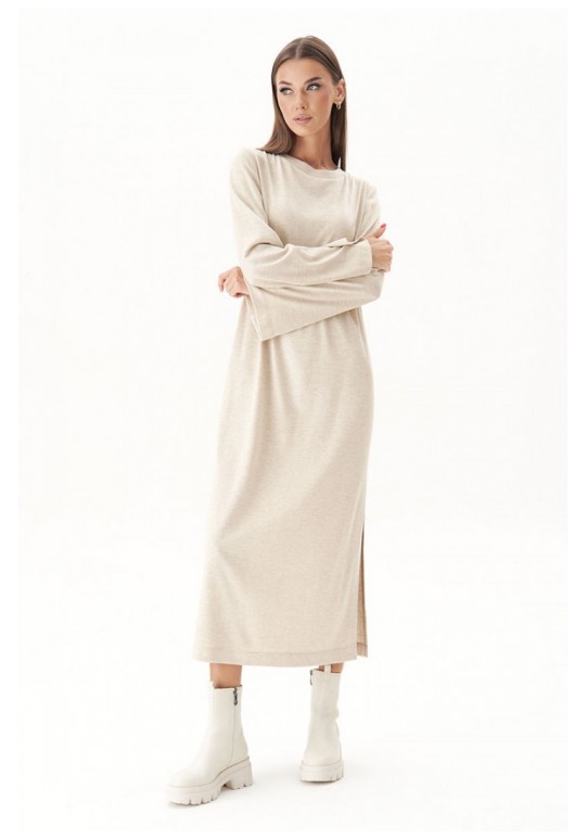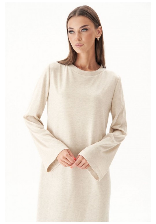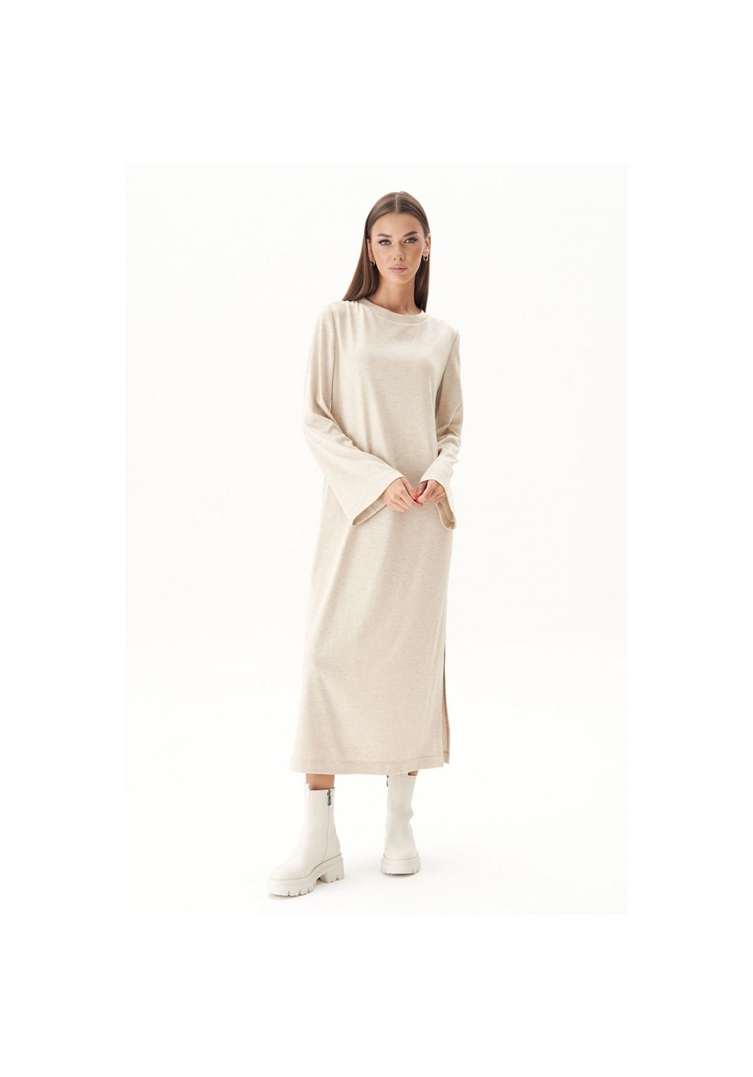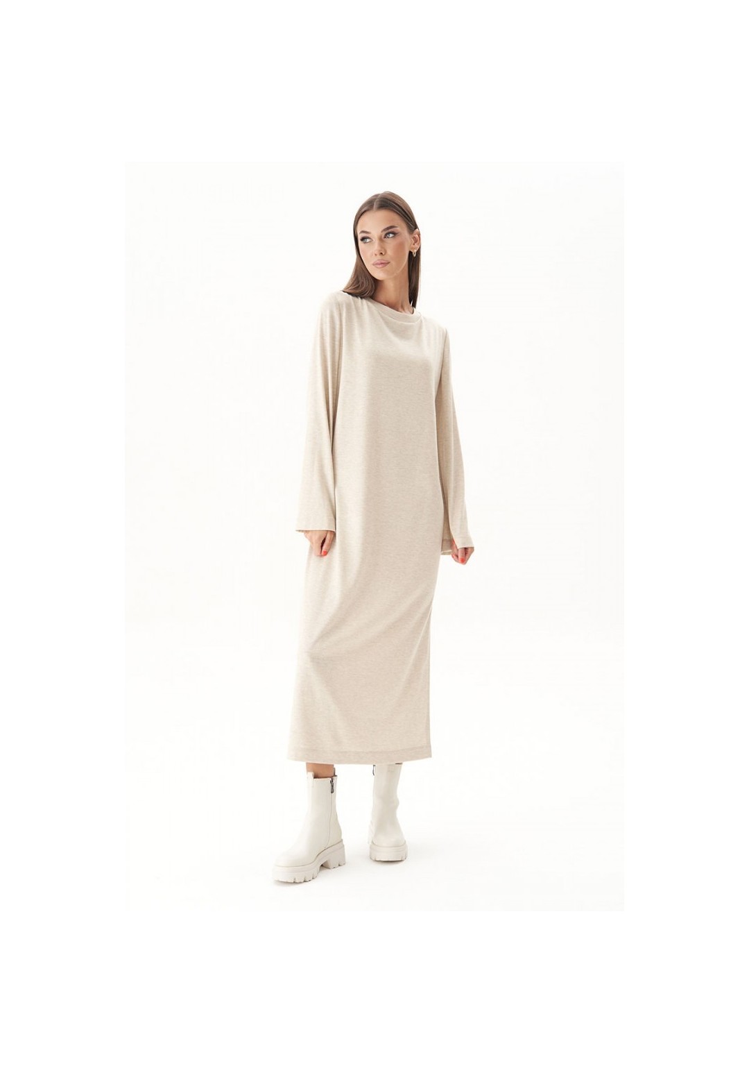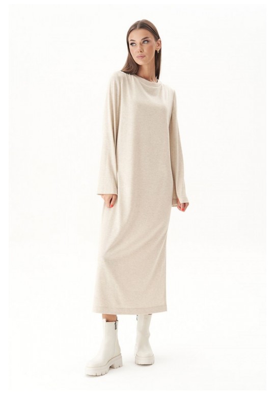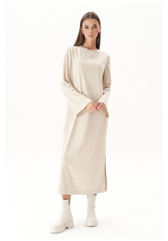 Тренд осенне-зимнего сезона - трикотажное платья свободного кроя. Никаких строгих силуэтов и ни в коем случае никаких разрезов; допускается только один вариант - высокий разрез сбоку. Свободный, упрямлённый силуэт, втачной покрой, рукав расширенный к низу, круглая горловина с обтачкой и эффектный разрез, плюс невероятный состав полотна с шерстью. Длина платья около 128 см. Длина рукава около 64 см.