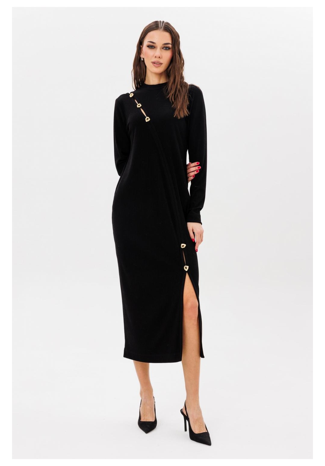 Платье, в котором вы будете на высоте! Полуприлегающий силуэт, втачной покрой, воротник стойка, фигурный ассиметричный рельеф по полочке переходящий в разрез по низу. Рельеф с частично открытыми каплями, подчеркнутый дизайнерскими пуговицами. Все это делает наше платье нарядным и одновременно повседневным!