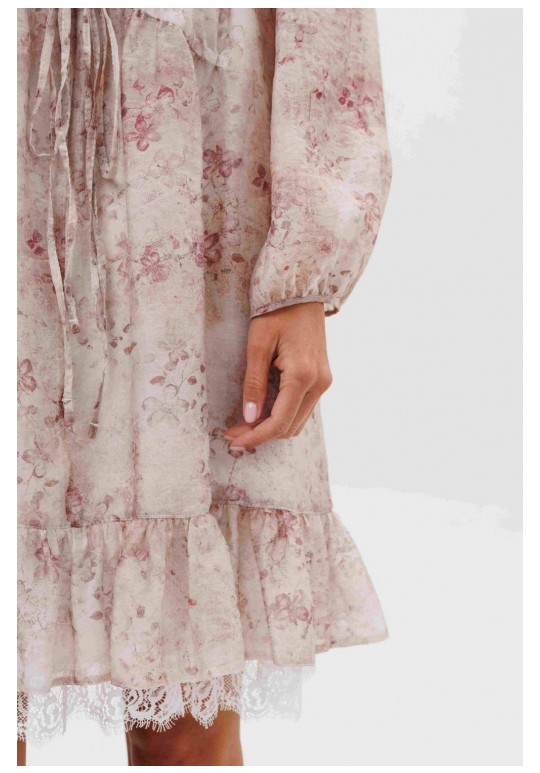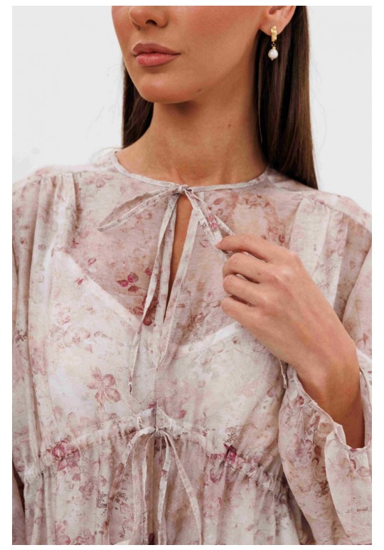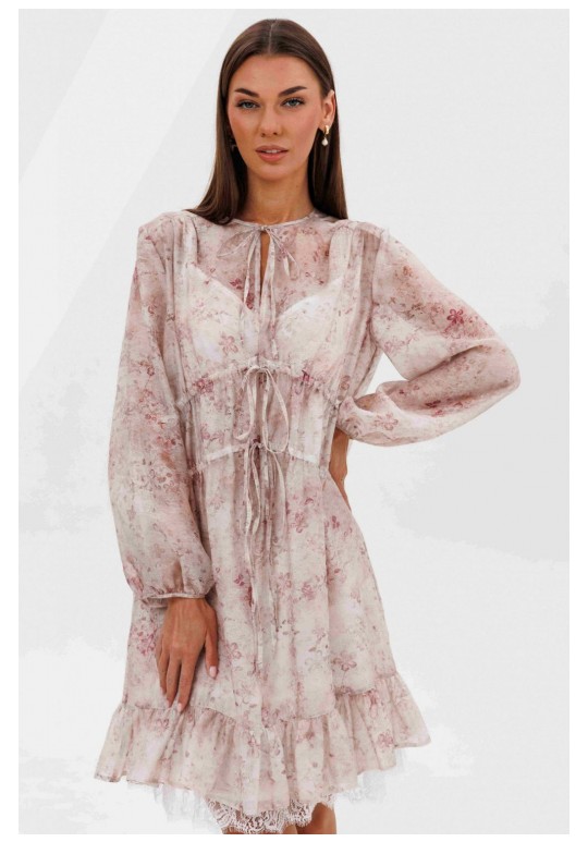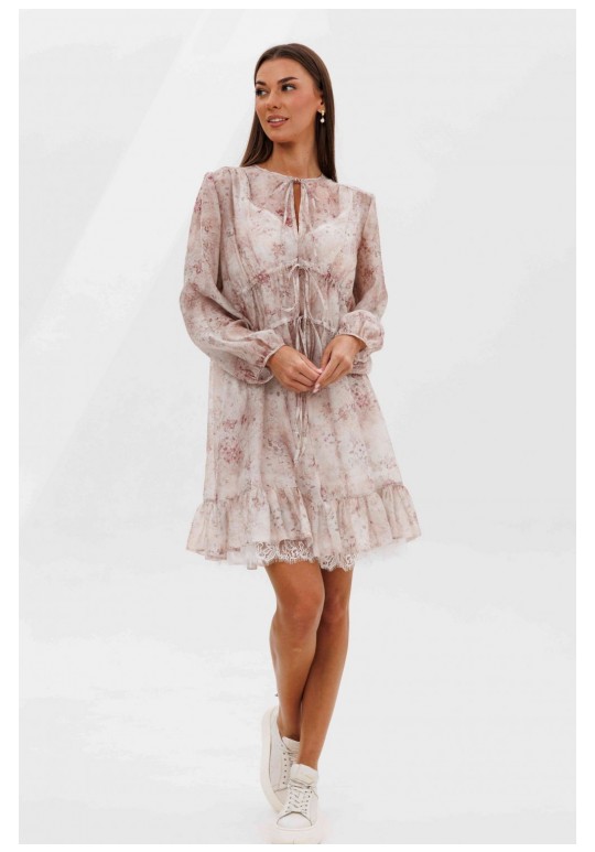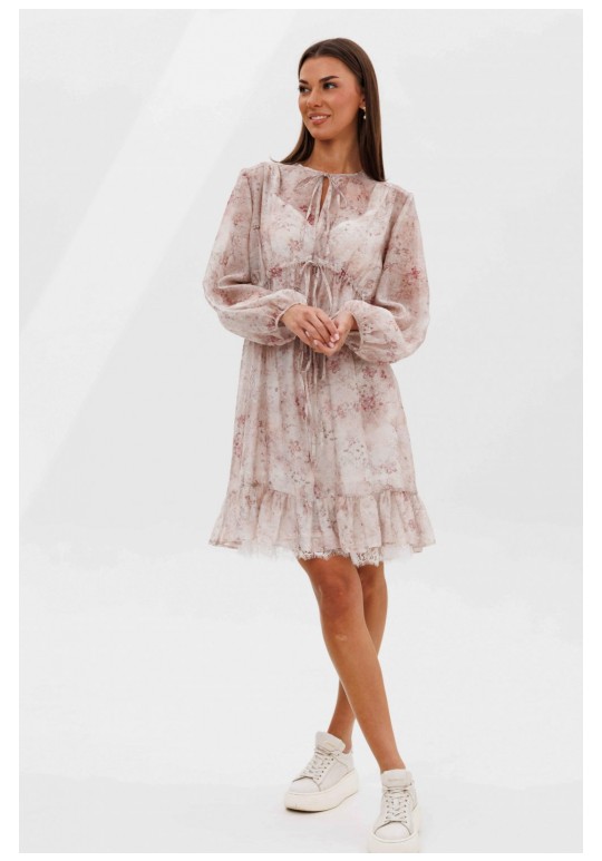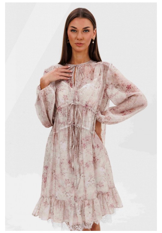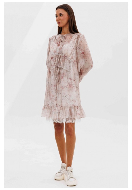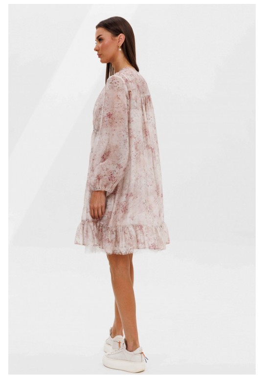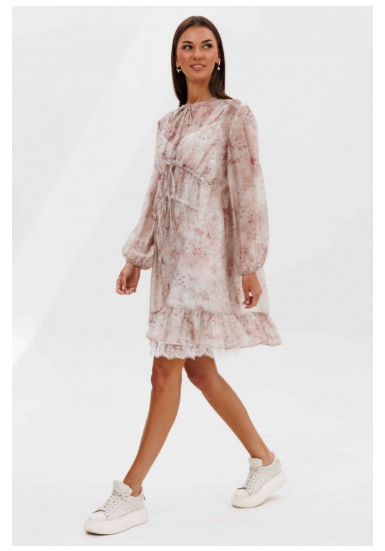 Кто сказал, что прозрачность должна быть скандальной? Легкость, воздушность и наивность-новая игра с прозрачными тканями, создающая настоящую модную алхимию. Легкий налет провокаций, никакой вульгарности, только утонченная игра с восприятием. Свободный А-силуэт, втачной покрой. Полочка с ценральным швом и диагональными кулисами с завязками. Рукав со сборкой по линии низа. Спинка с отрезной кокеткой. Нижняя часть спинки со сборкой по центру. По низу платья притачной волан со сборкой. Подкладка платья из х/б батиста, на регулируемых бретелях, с притачным воланом с кружевом. Длина рукава около 60 см. Длина платья около 90 см.