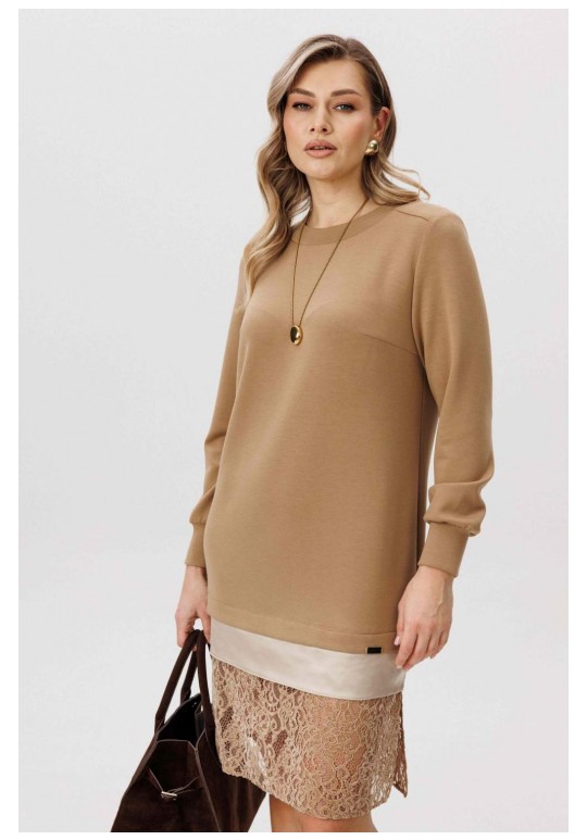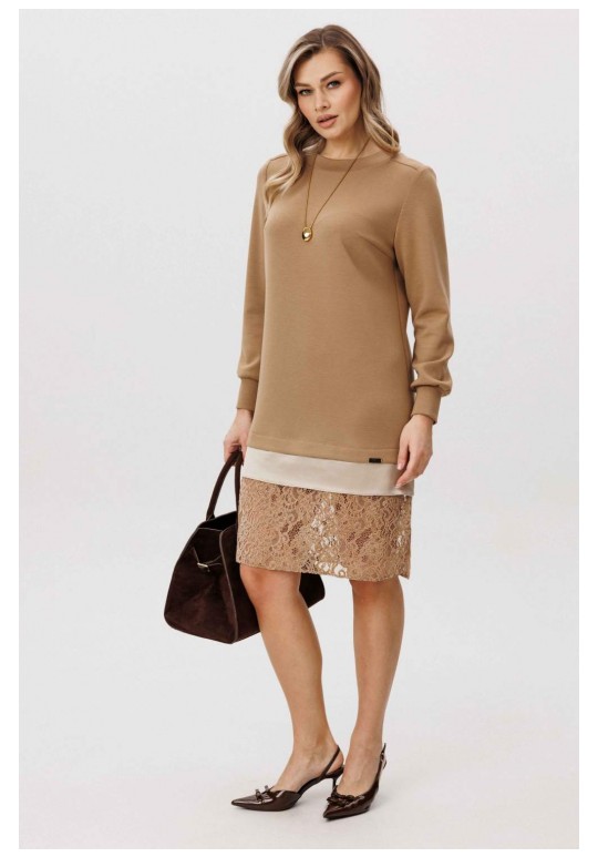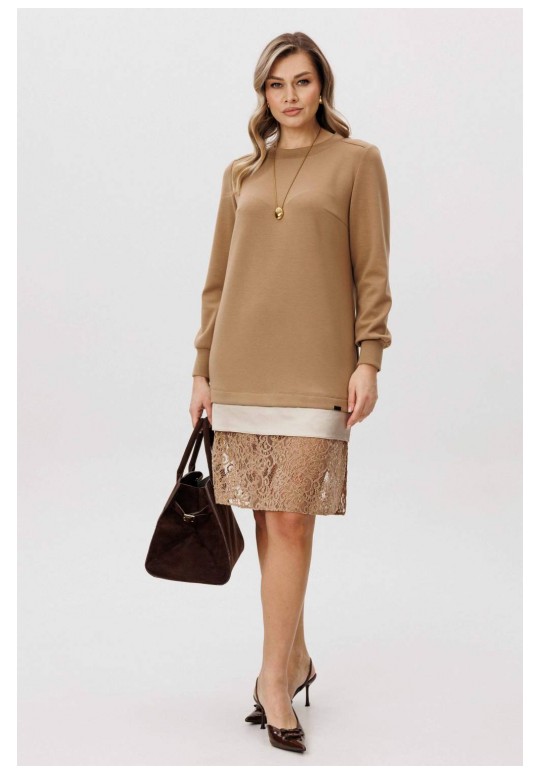 Элегантное платье, сочетающее комфорт и утончённый женственный акцент. Модель выполнена в лаконичном силуэте с длинным рукавом и мягкой линией плеч, что обеспечивает удобную посадку и универсальность в носке. Чистый верх подчёркивает минимализм дизайна и делает образ аккуратным и собранным. Нижняя часть платья дополнена декоративной вставкой из кружева, которая добавляет образу изящества и визуальной лёгкости. Контраст фактур создаёт эффект многослойности и делает модель выразительной без излишней декоративности. Платье отлично подойдёт для повседневных и офисных образов, а также для встреч и выходов в город, легко сочетаясь с классической обувью и аксессуарами.