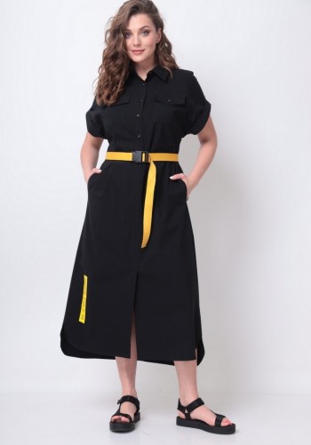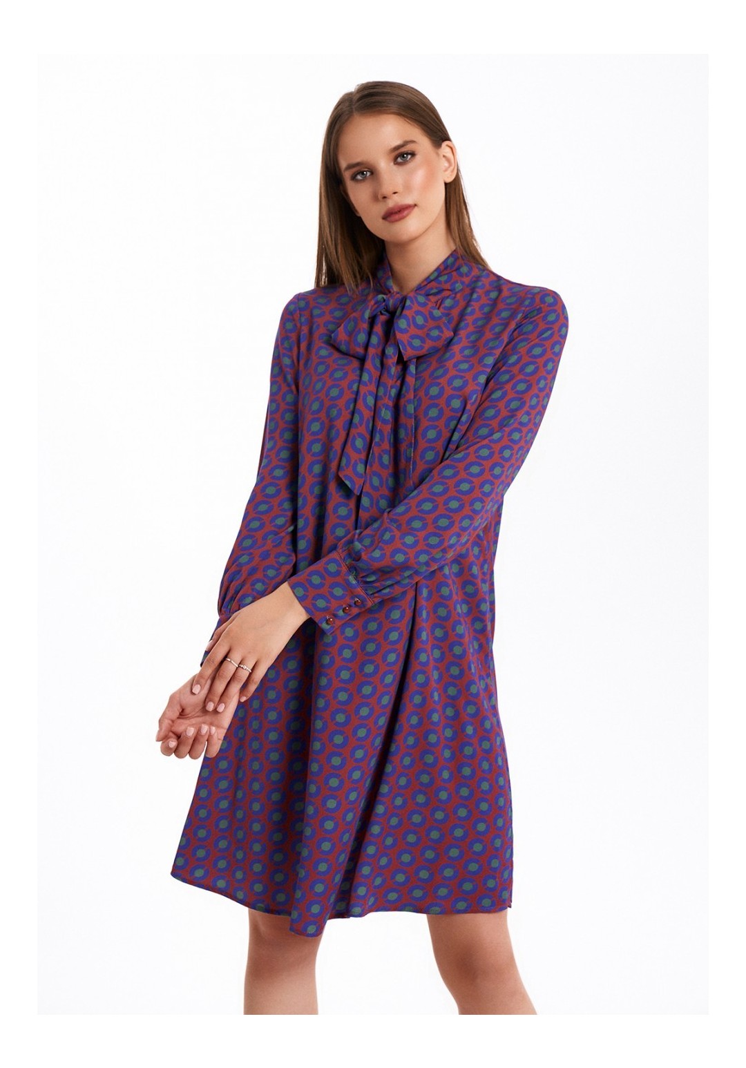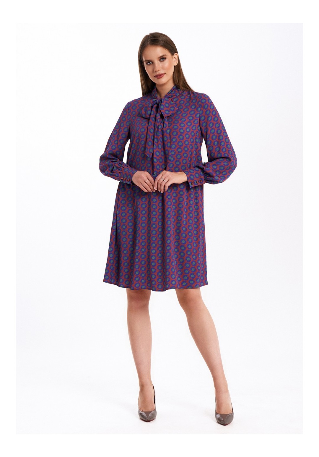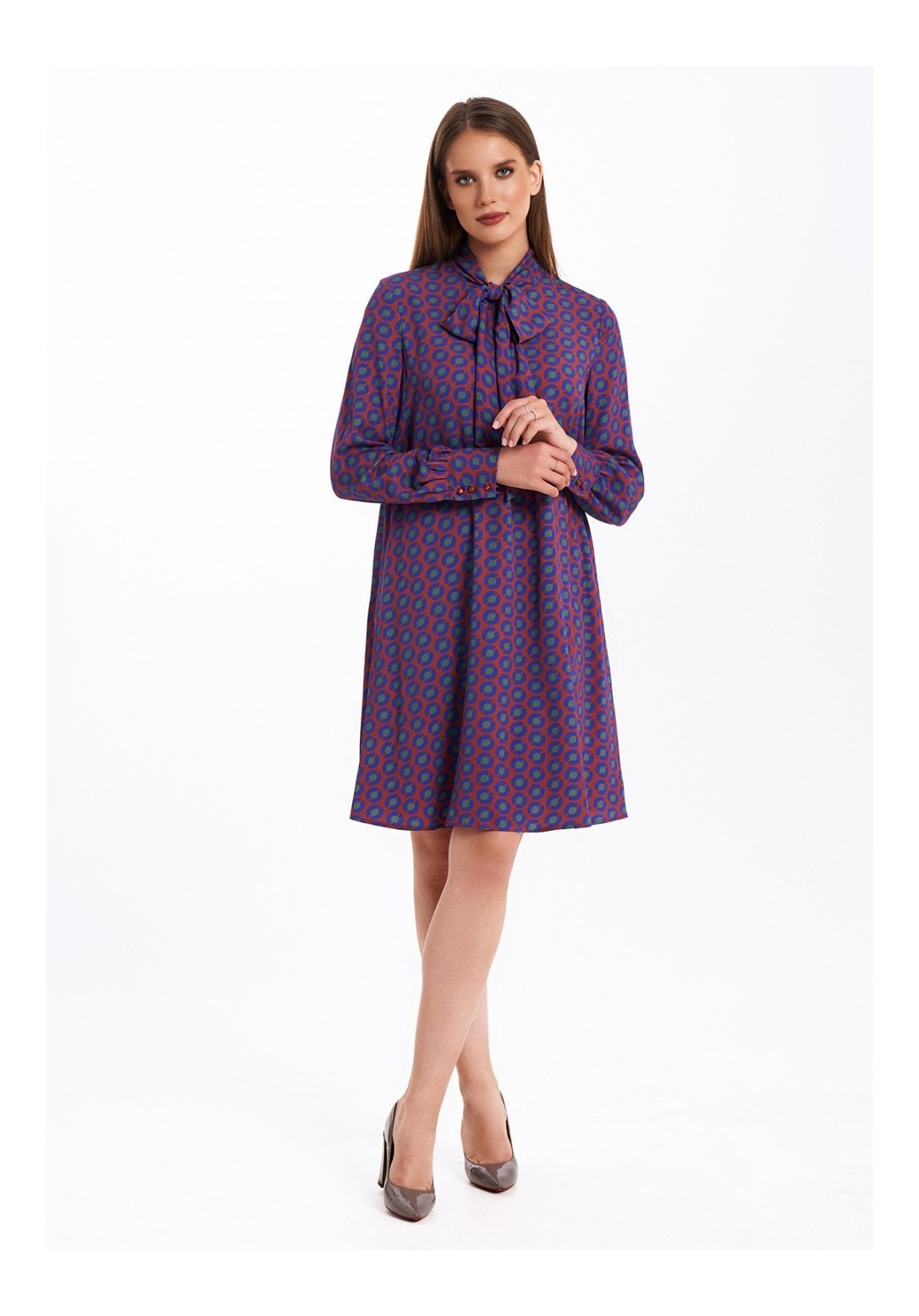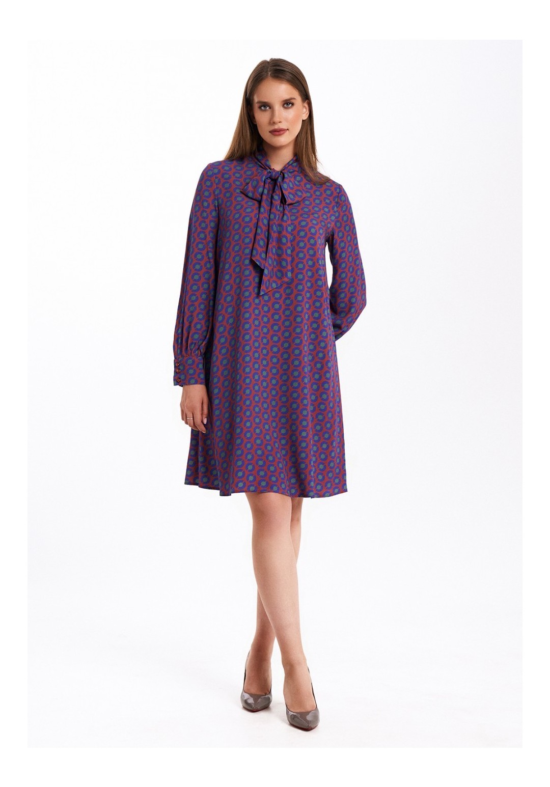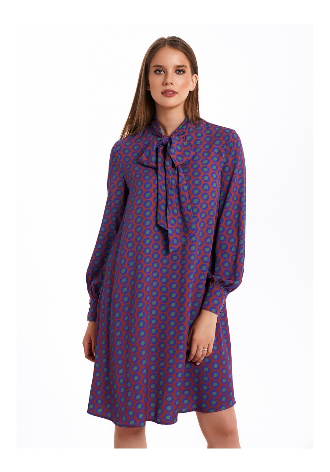 Платье свободного силуэта, расширенное к низу, выполнено из вискозного полотна с воротником-стойкой, переходящим в бант. Рукава в изделии втачные одношовные со сборкой по низу с отрезной манжетой на 3 петли и пуговицы. Платье на подкладке.