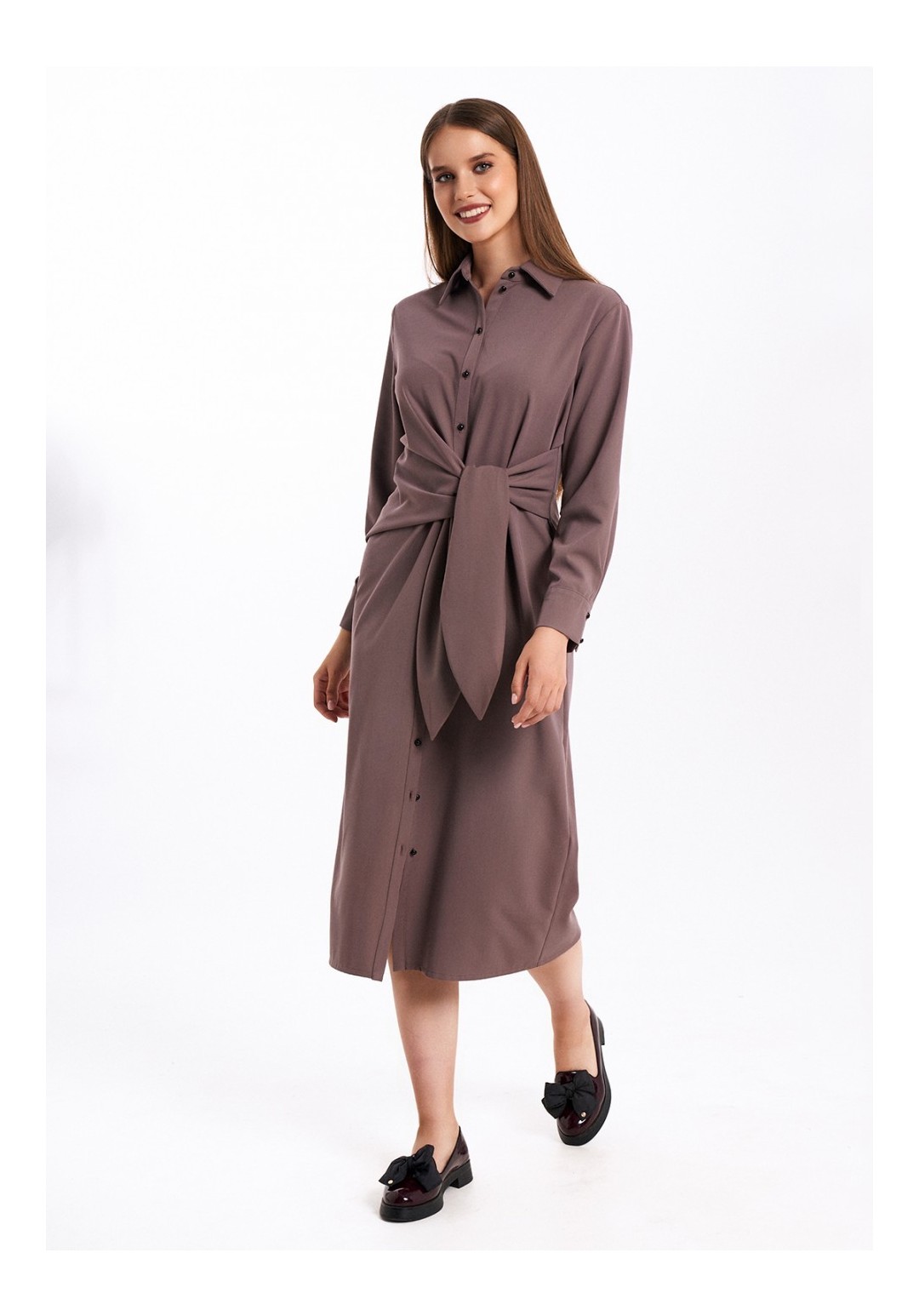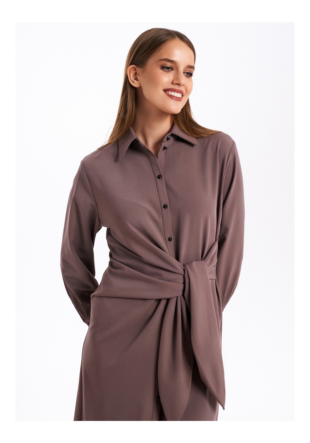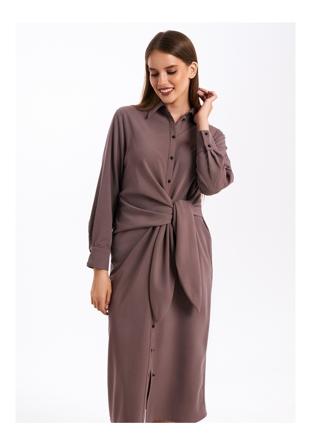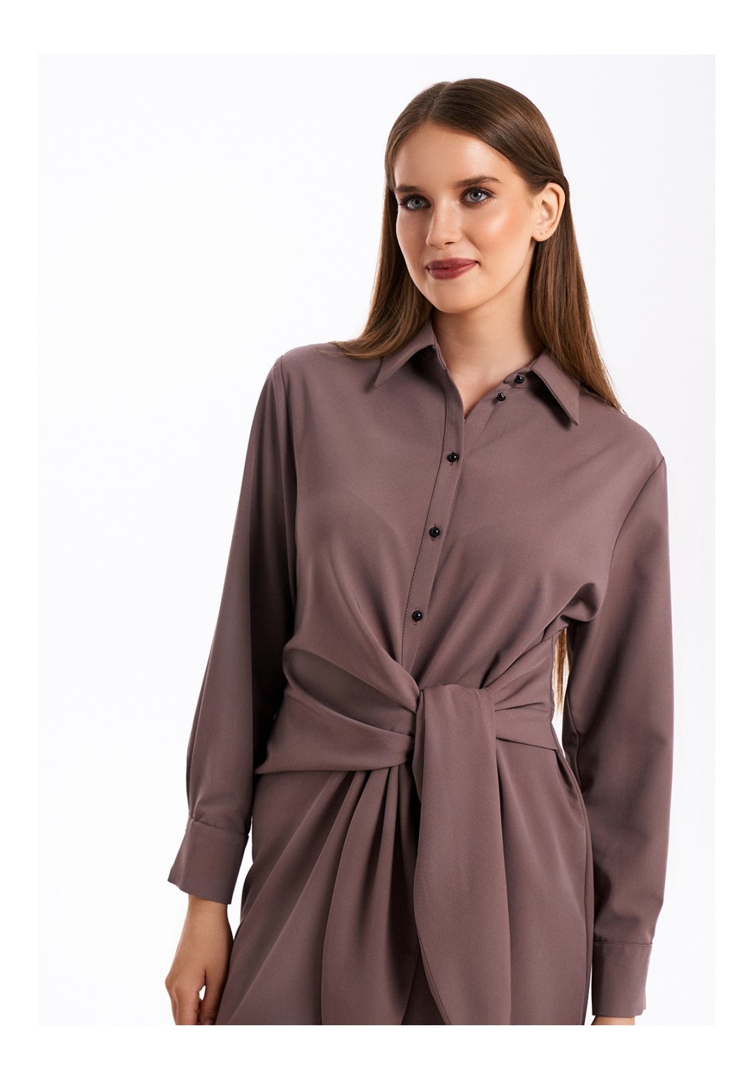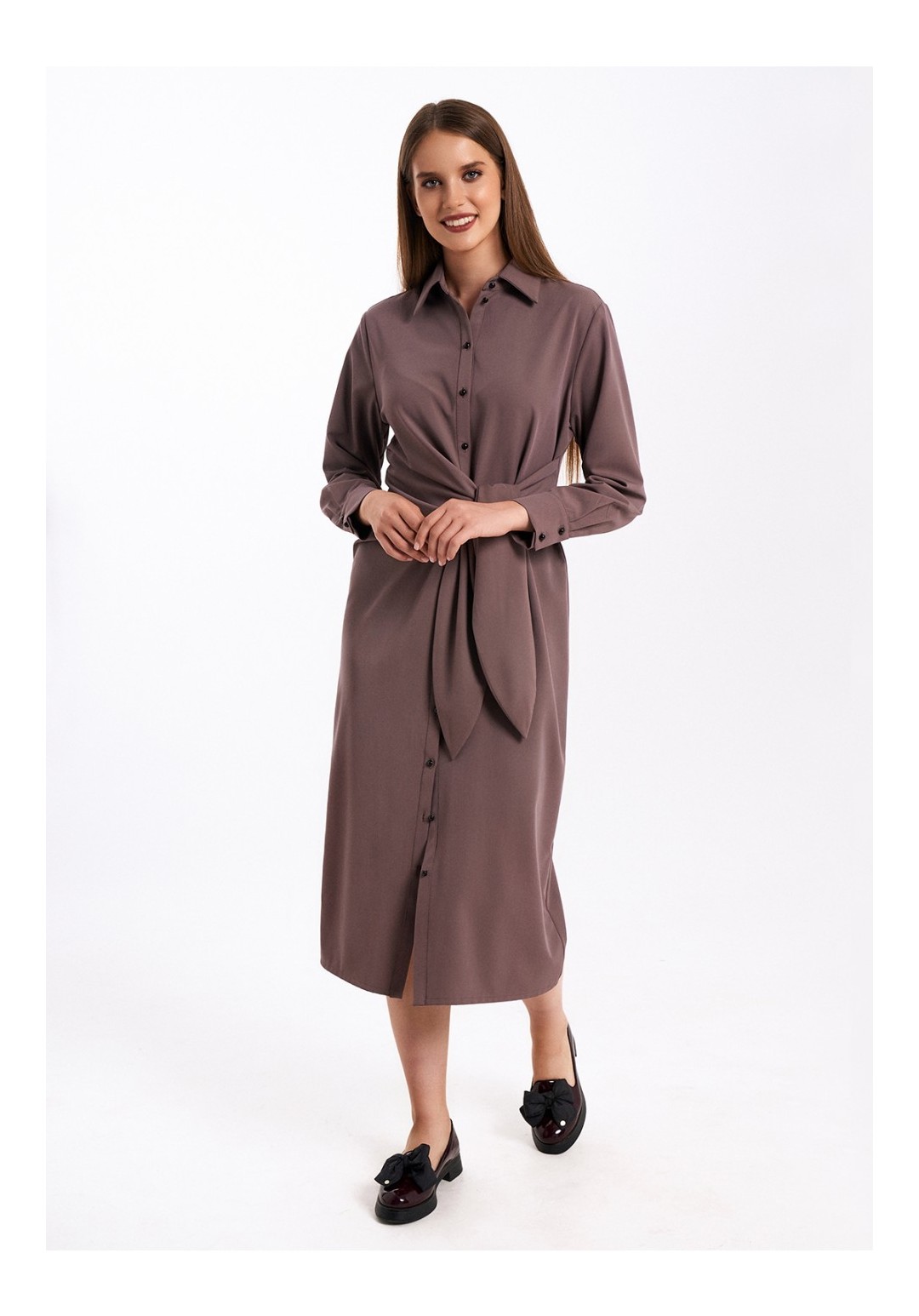 Платье женское прямого силуэта, умеренного объема. Перед ассиметричен. На правой части переда на уровне талии оформлен цельнокроеный пояс. На левой части переда на уровне талии расположена притачная деталь пояса. Спинка разрезная по линии талии, а также имеет 4 талиевые вытачки. Линия плеча чуть спущена. Рукав втачной, длинный. По нижнему срезу рукава притачная манжета с застежкой на петлю и пуговицу. Воротник стояче-отложной рубашечный. Платье длиной ниже линии колена с застежкой на петли и пуговицы. Длина изделия - 122,5 см, длина рукава - 59,5 см.