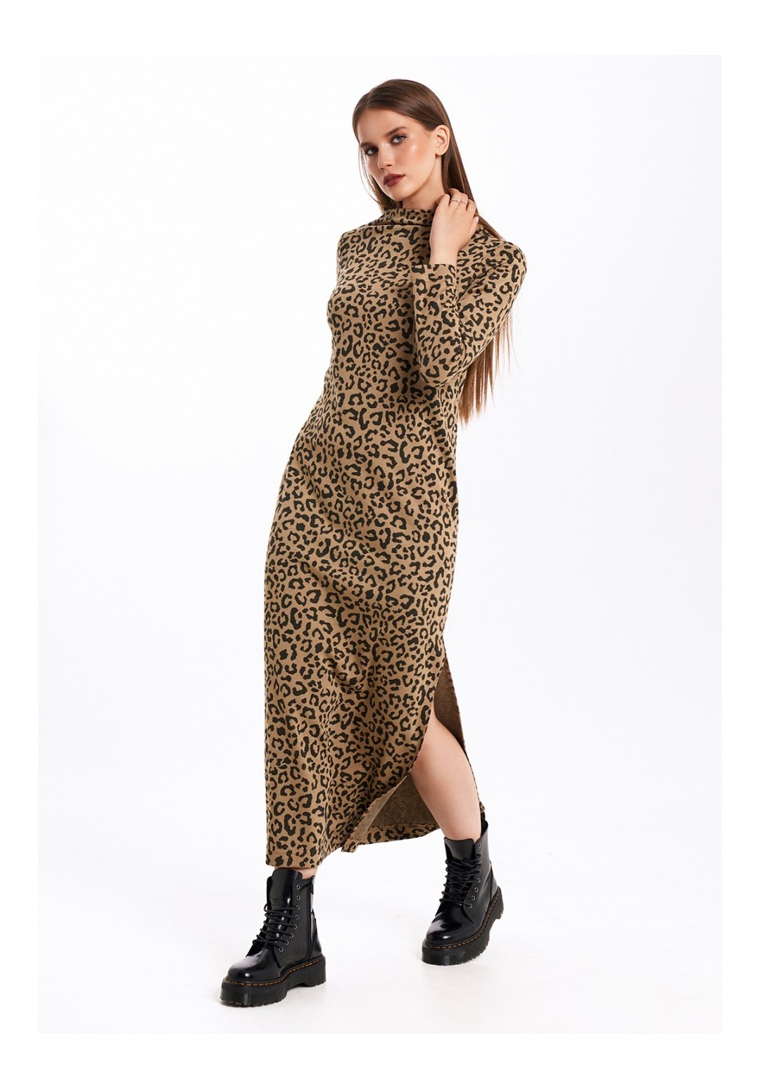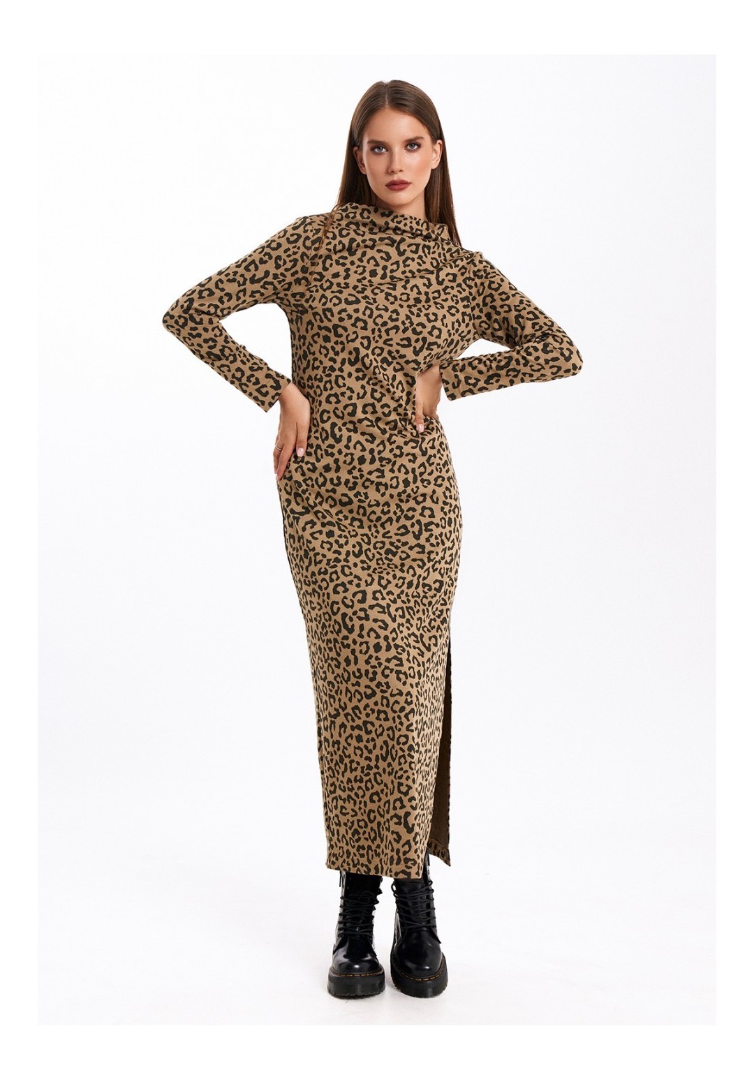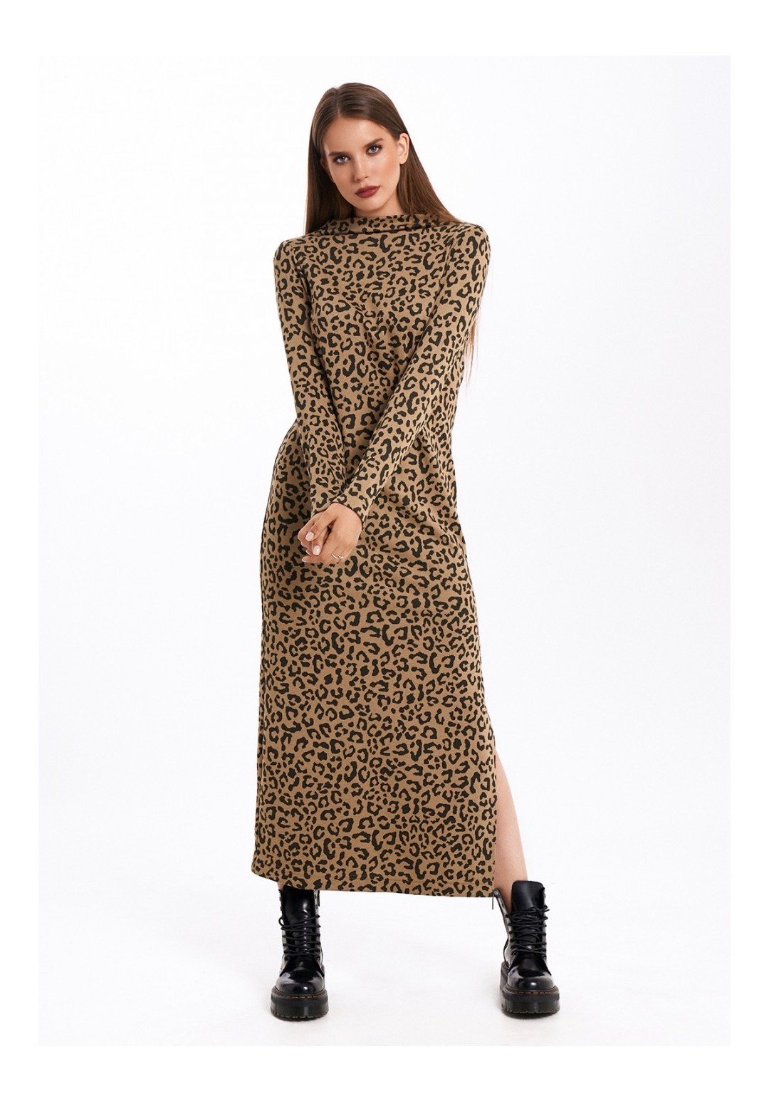 Платье умеренного объема, прямого силуэта. Перед платья с 2-мя нагрудными вытачками. Рукав длинный, малого объема, втачной. Горловина – цельнокроеная стойка умеренного объема. С левой стороны платья расположен разрез до линии колена. Длина платья до щиколотки. Длина изделия - 139 см. Длина рукава - 59 см.