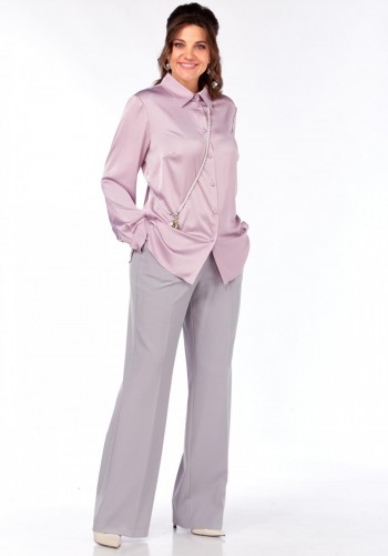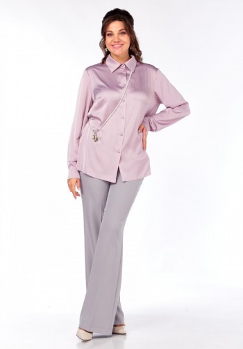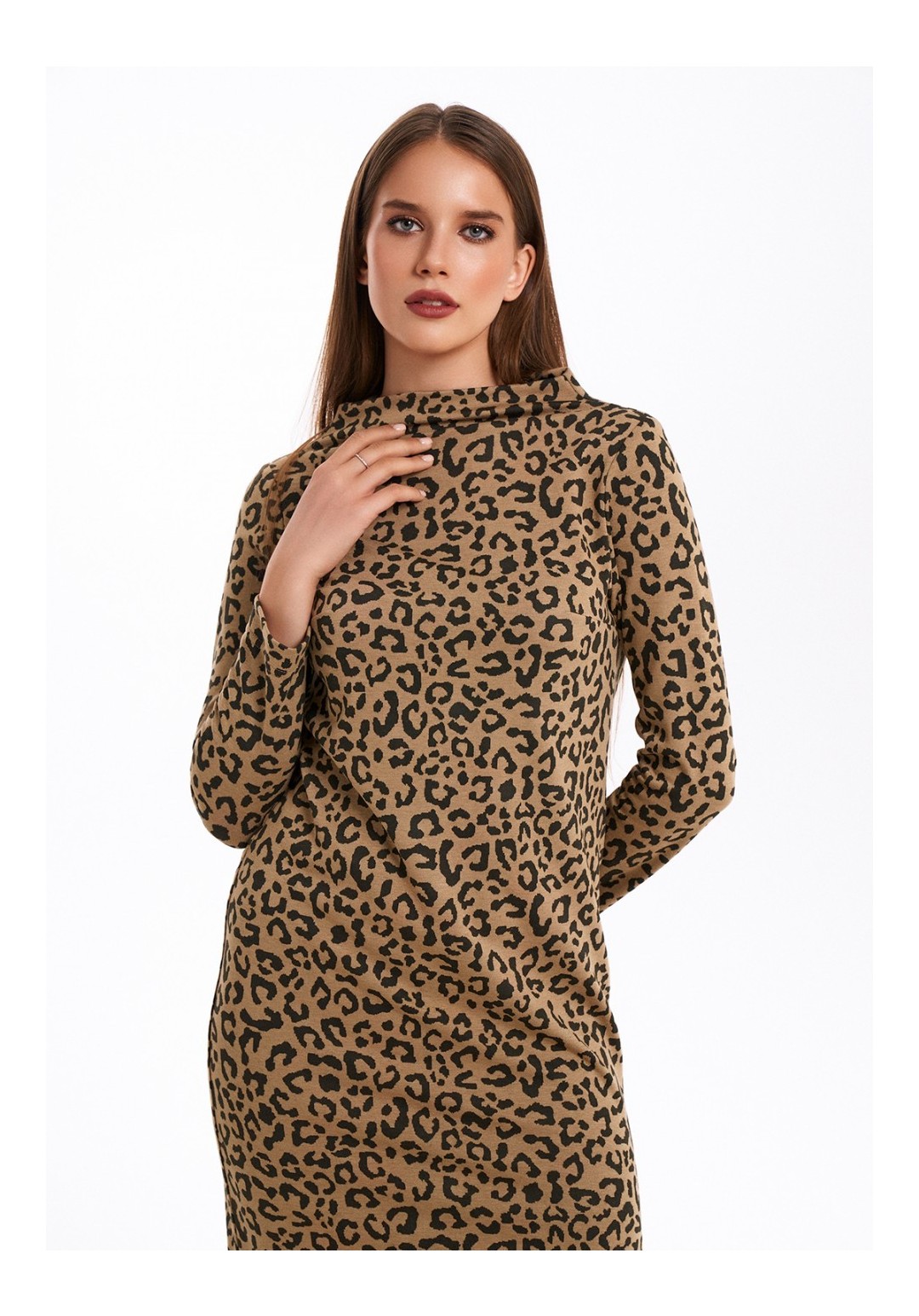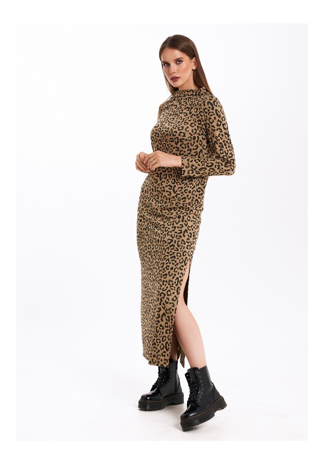 Платье умеренного объема, прямого силуэта. Перед платья с 2-мя нагрудными вытачками. Рукав длинный, малого объема, втачной. Горловина – цельнокроеная стойка умеренного объема. С левой стороны платья расположен разрез до линии колена. Длина платья до щиколотки. Длина изделия - 139 см. Длина рукава - 59 см.