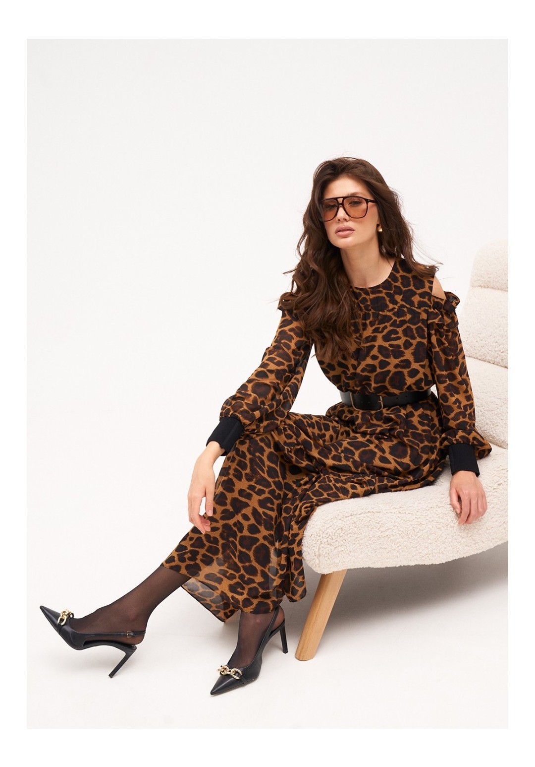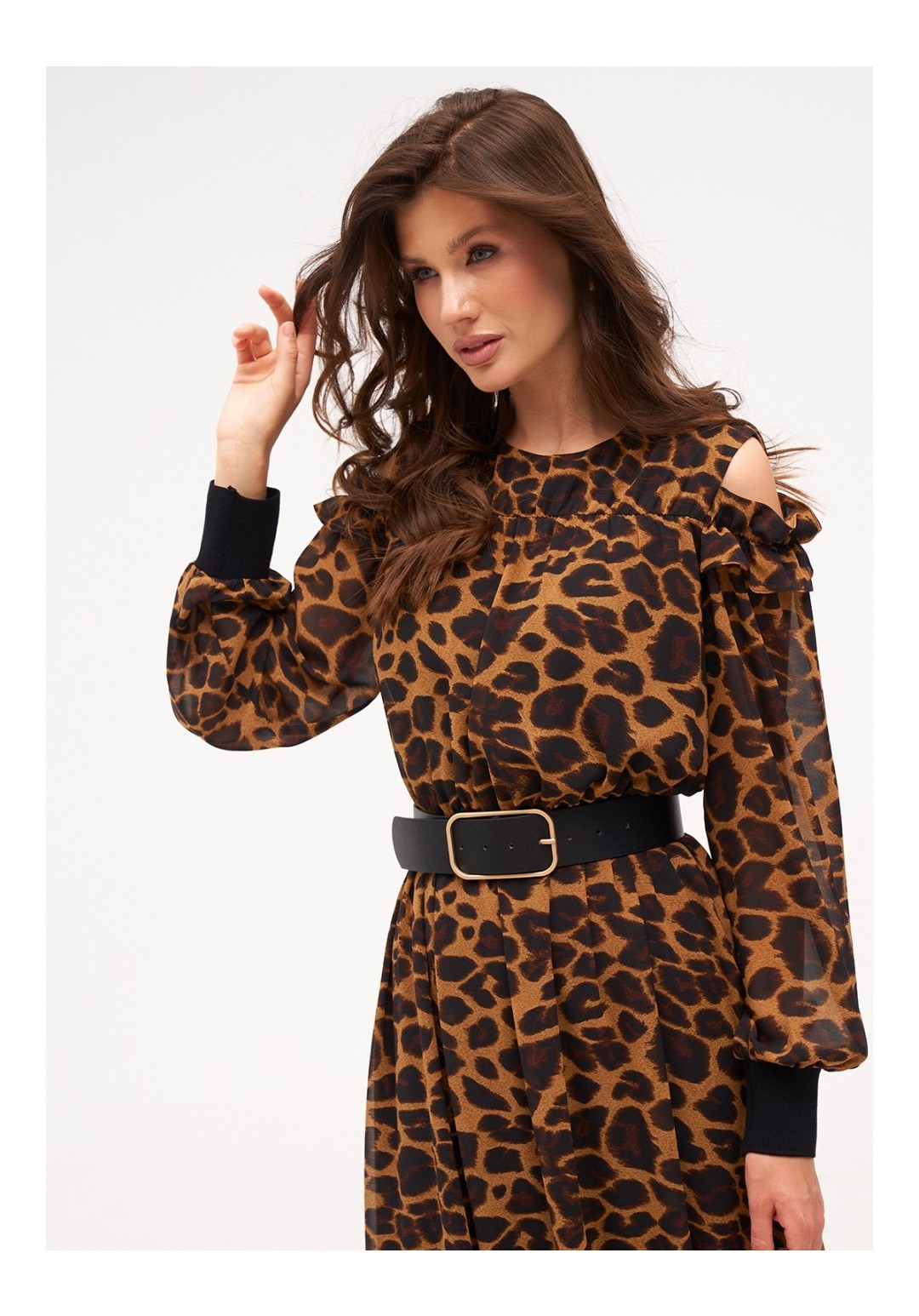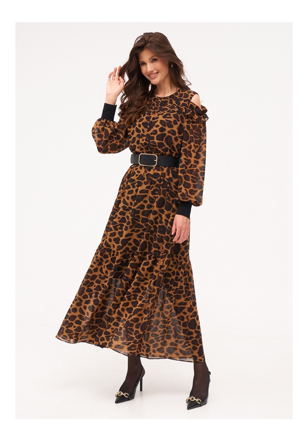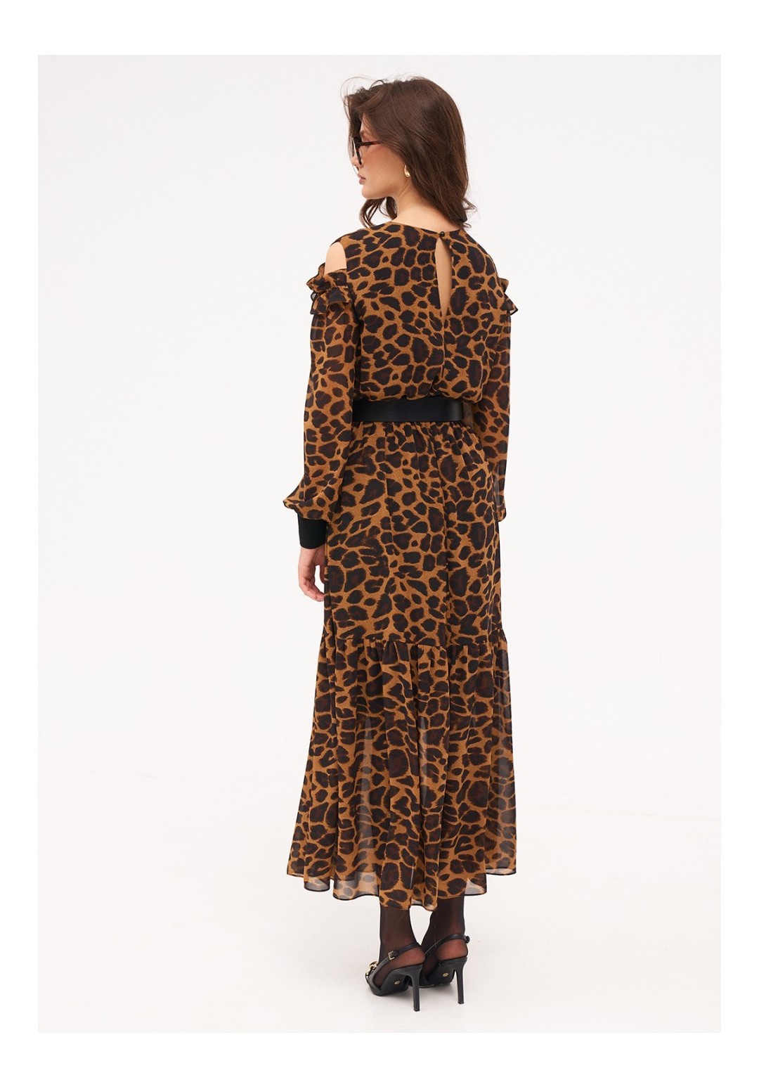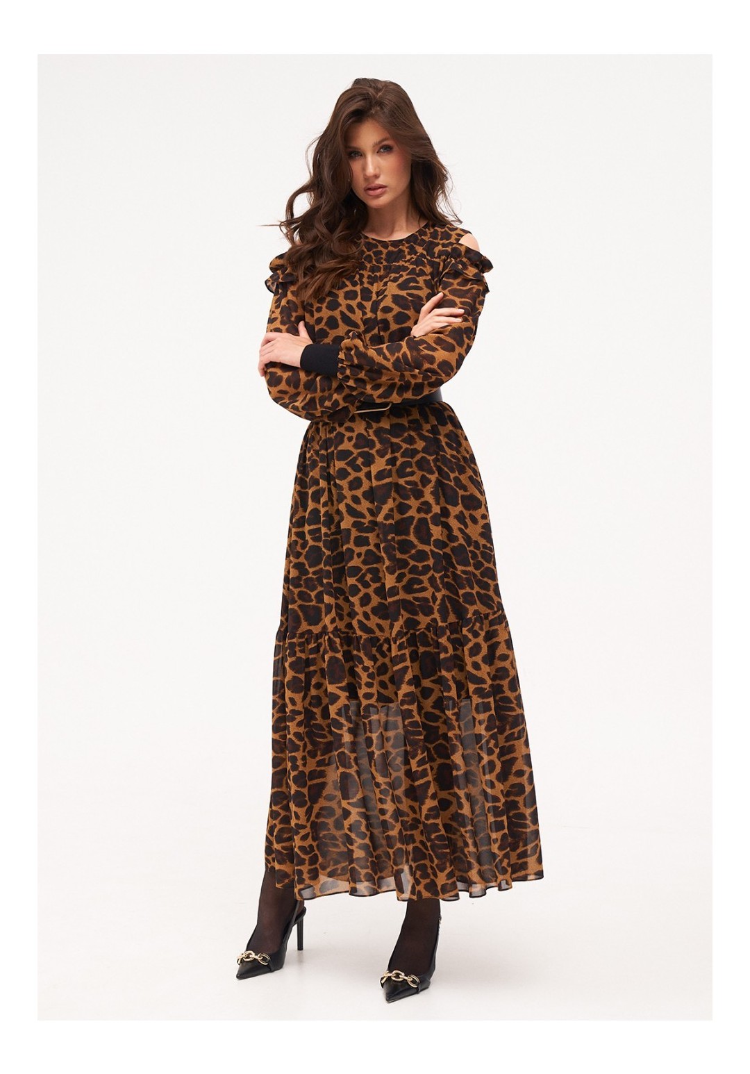 Платье из струящегося шифона длиной макси на вискозной подкладке. Рукав на трикотажной манжете. Верх рукава на резинке с рюшей, по плечам небольшие вырезы. По низу изделия притачной волан на сборке. По спинке застёжка на петлю и пуговицу по горловине. Платье на резинке по талии. Комплектуется ремнём. Длина изделия по спинке - 140 см, длина рукава - 66 см, длина манжета - 9 см.