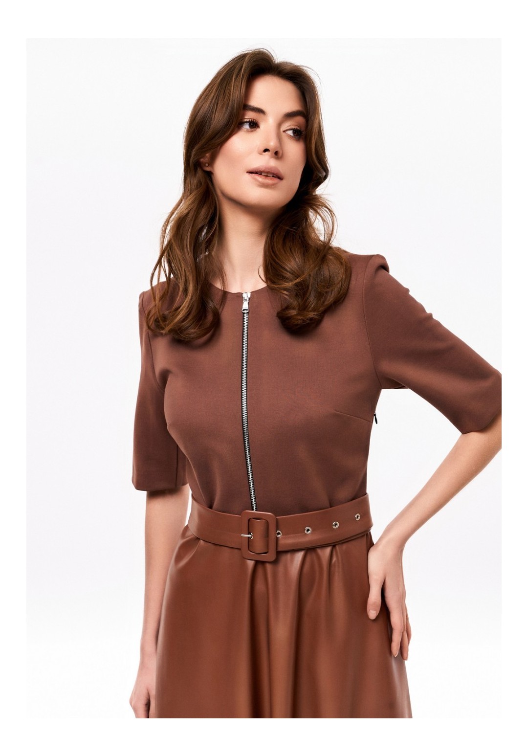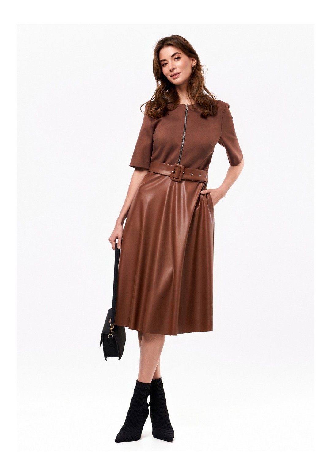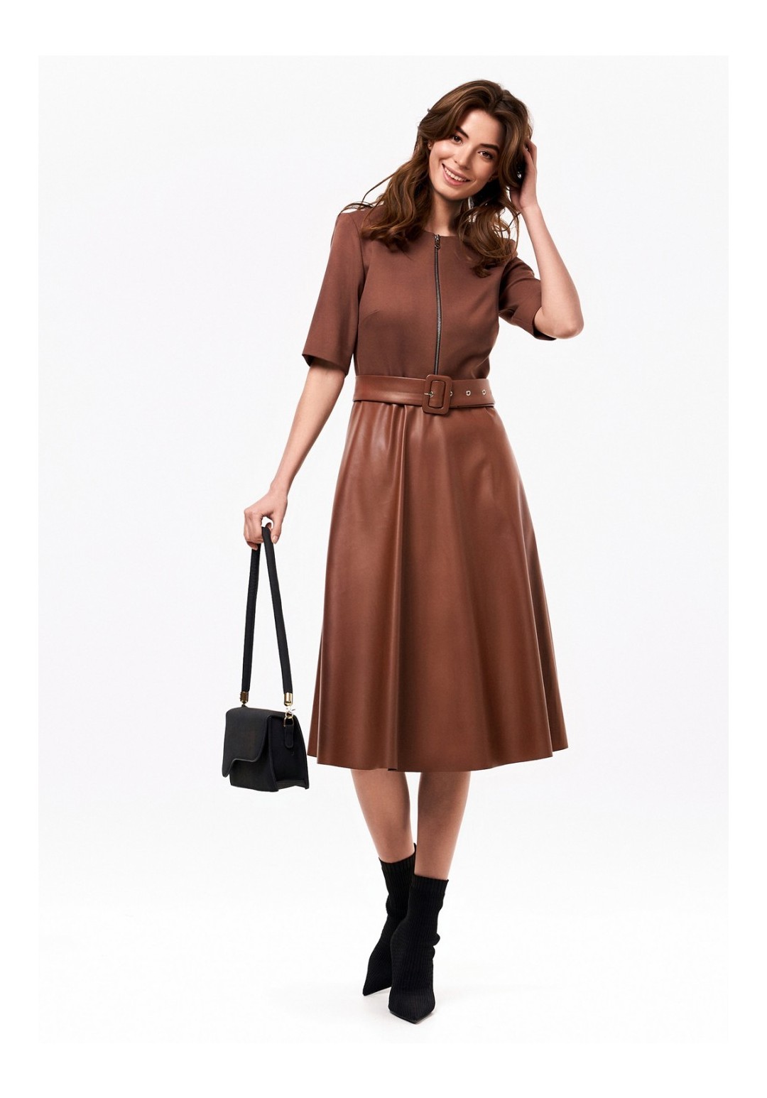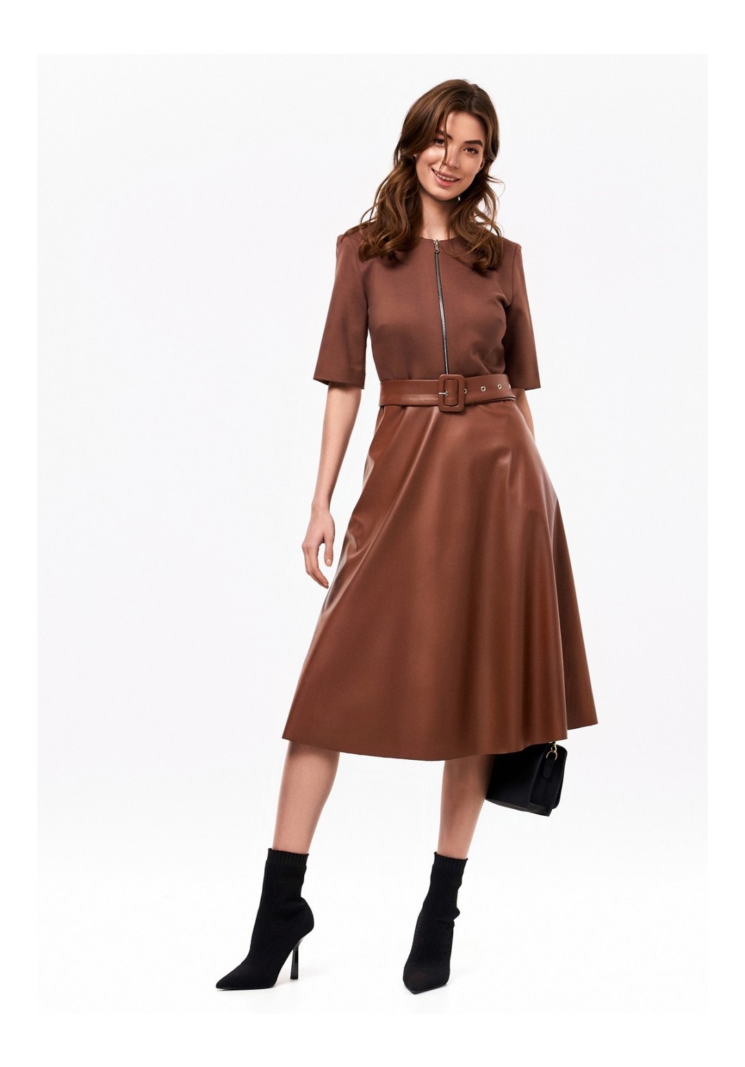 Приталенное платье с расклешённой юбкой выполнено из трикотажного полотна в сочетании с экокожей. По переду от горловины до пояса декоративная металлическая молния. Застёжка на потайную молнию сзади. Комплектуется ремнём из экокожи.