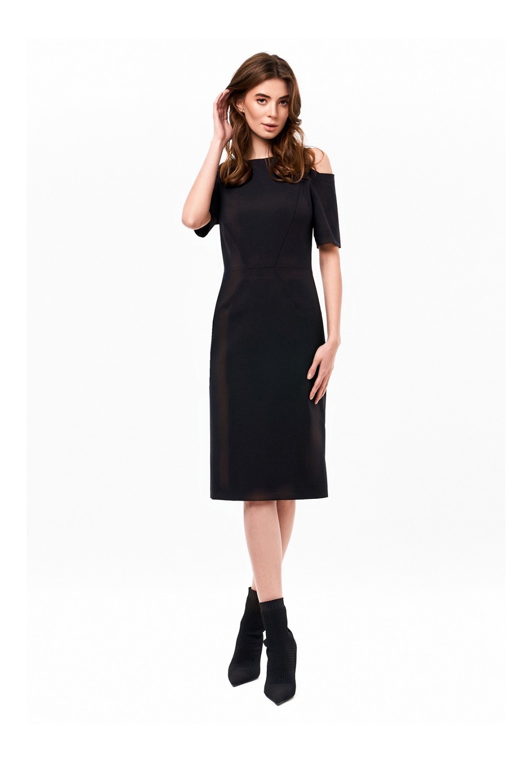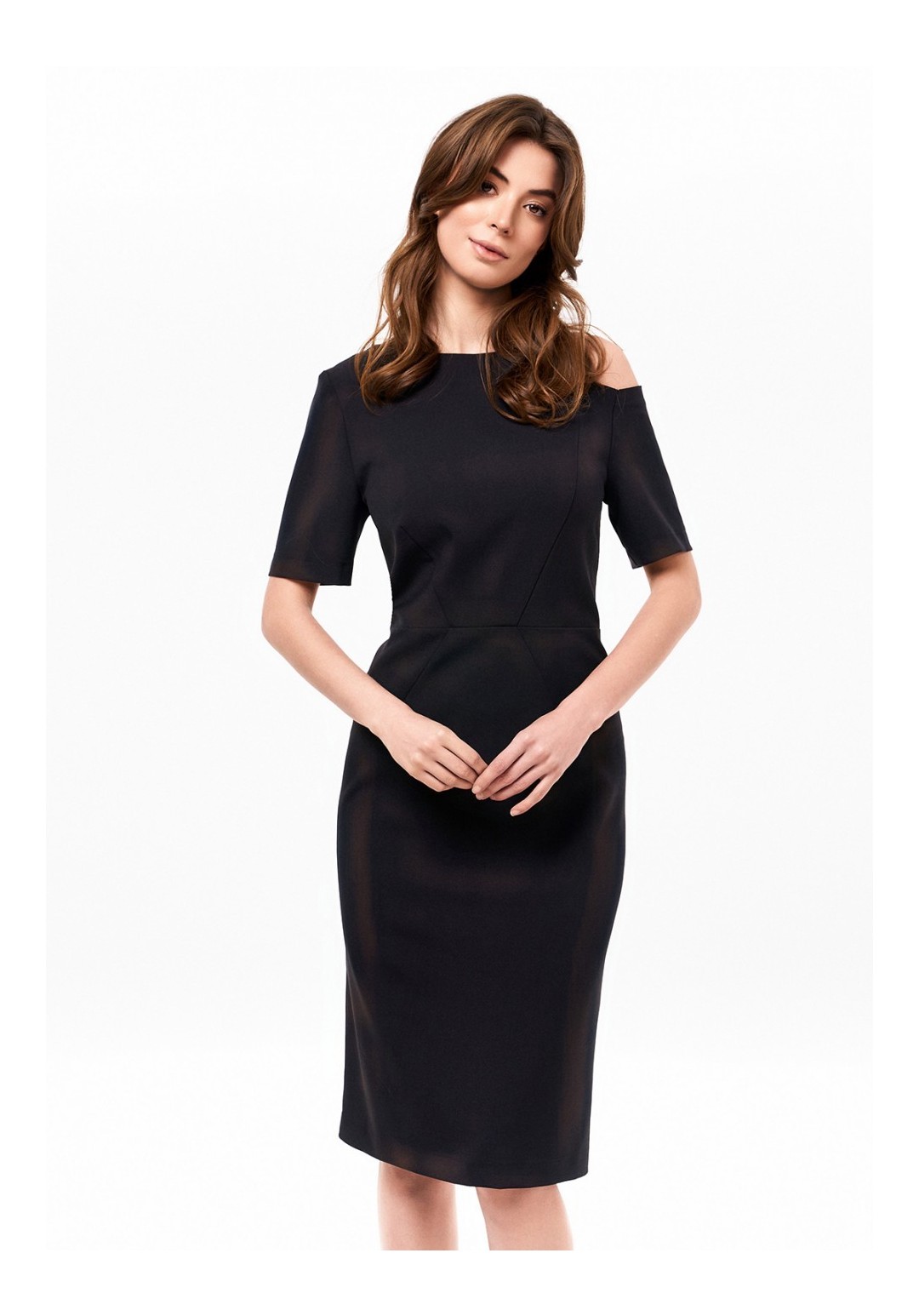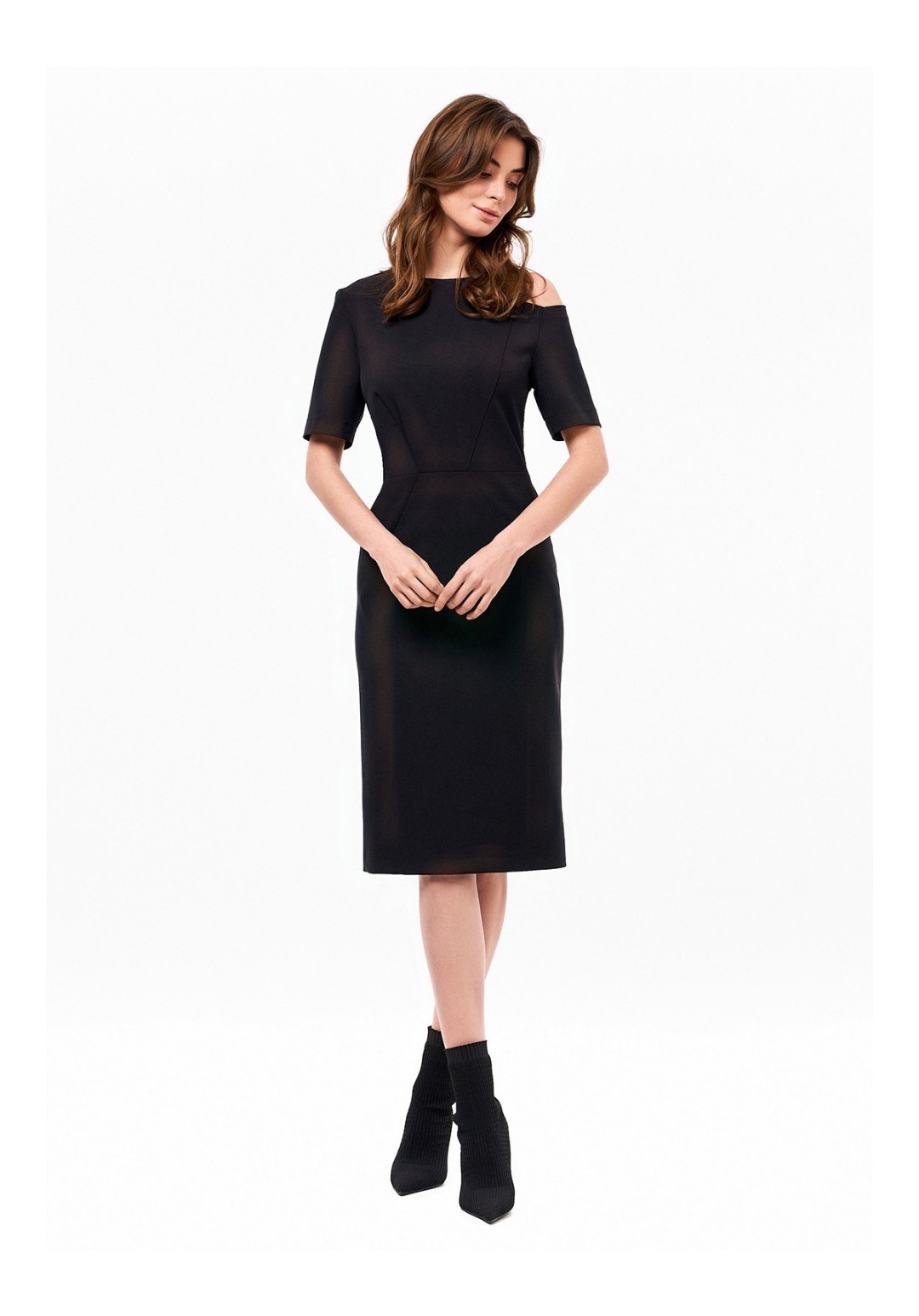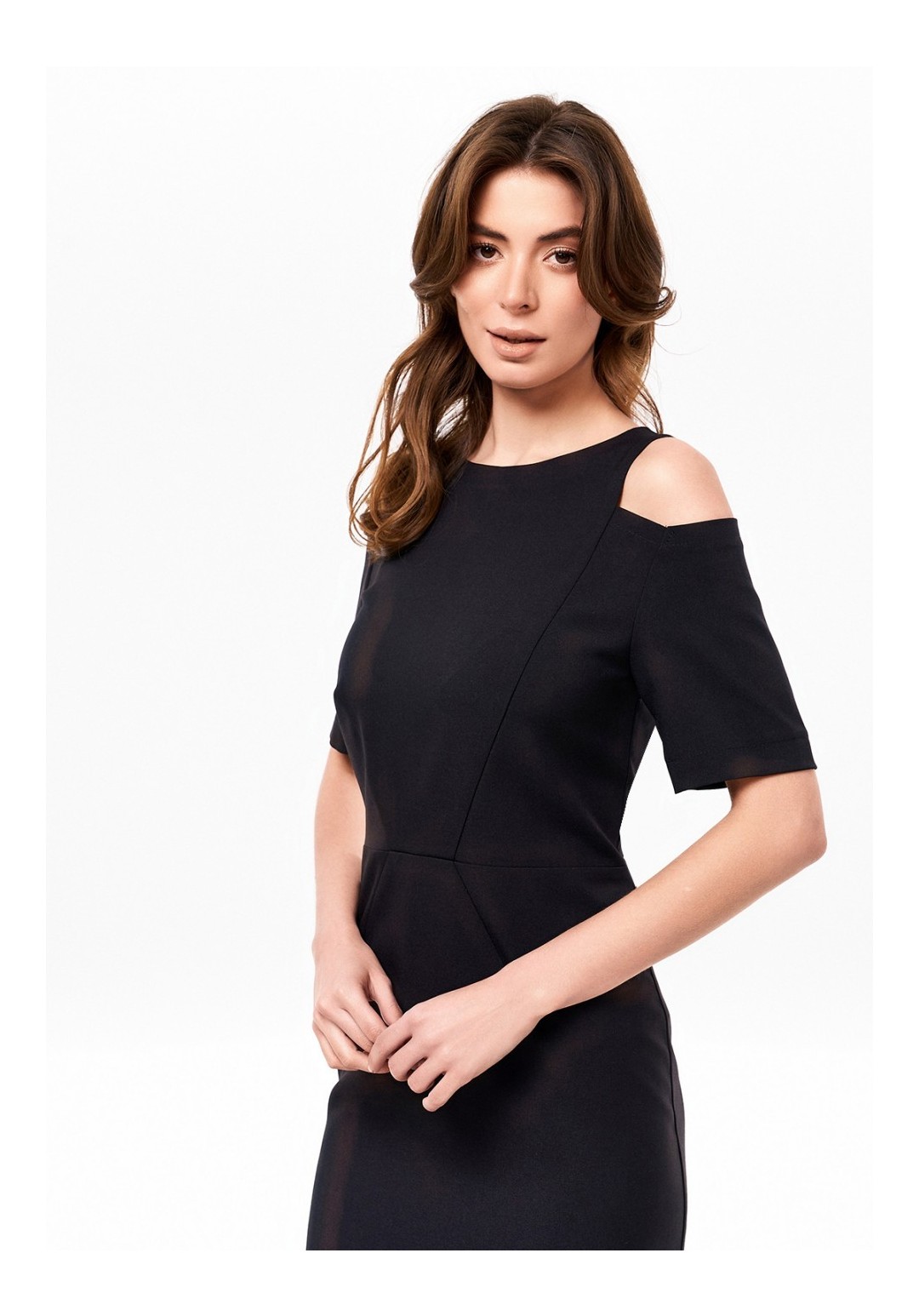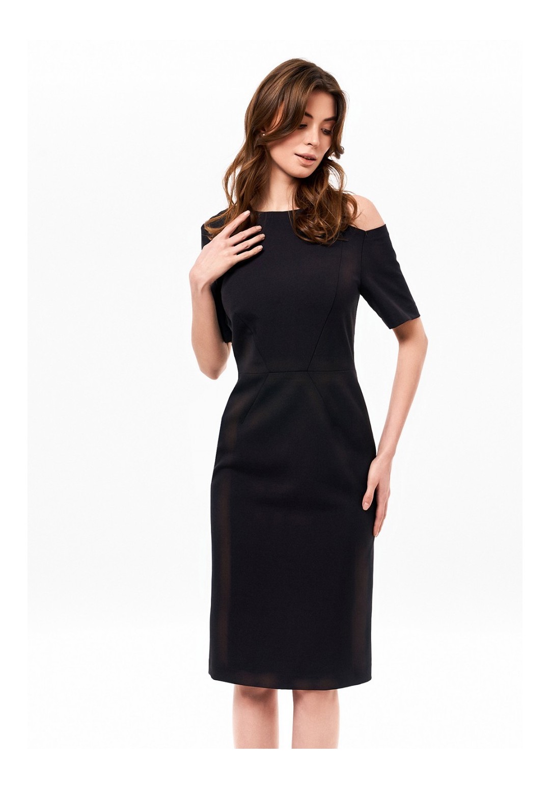 Платье футляр асимметричного кроя отрезное по талии с вырезом на левом плече. Застёжка на потайную молнию сзади.
