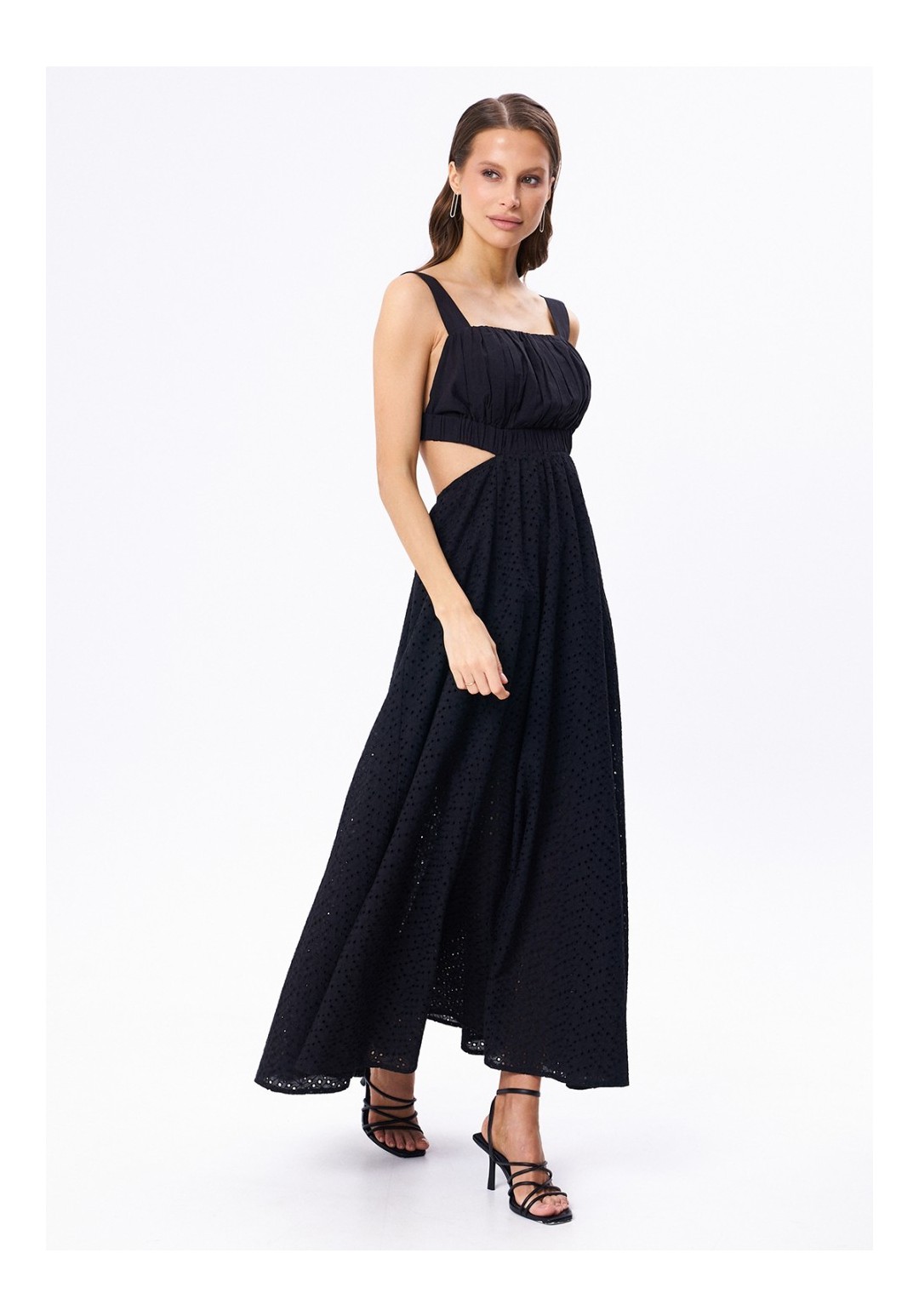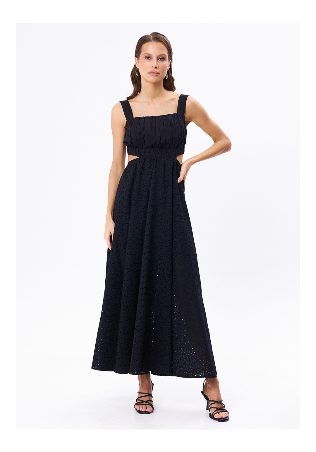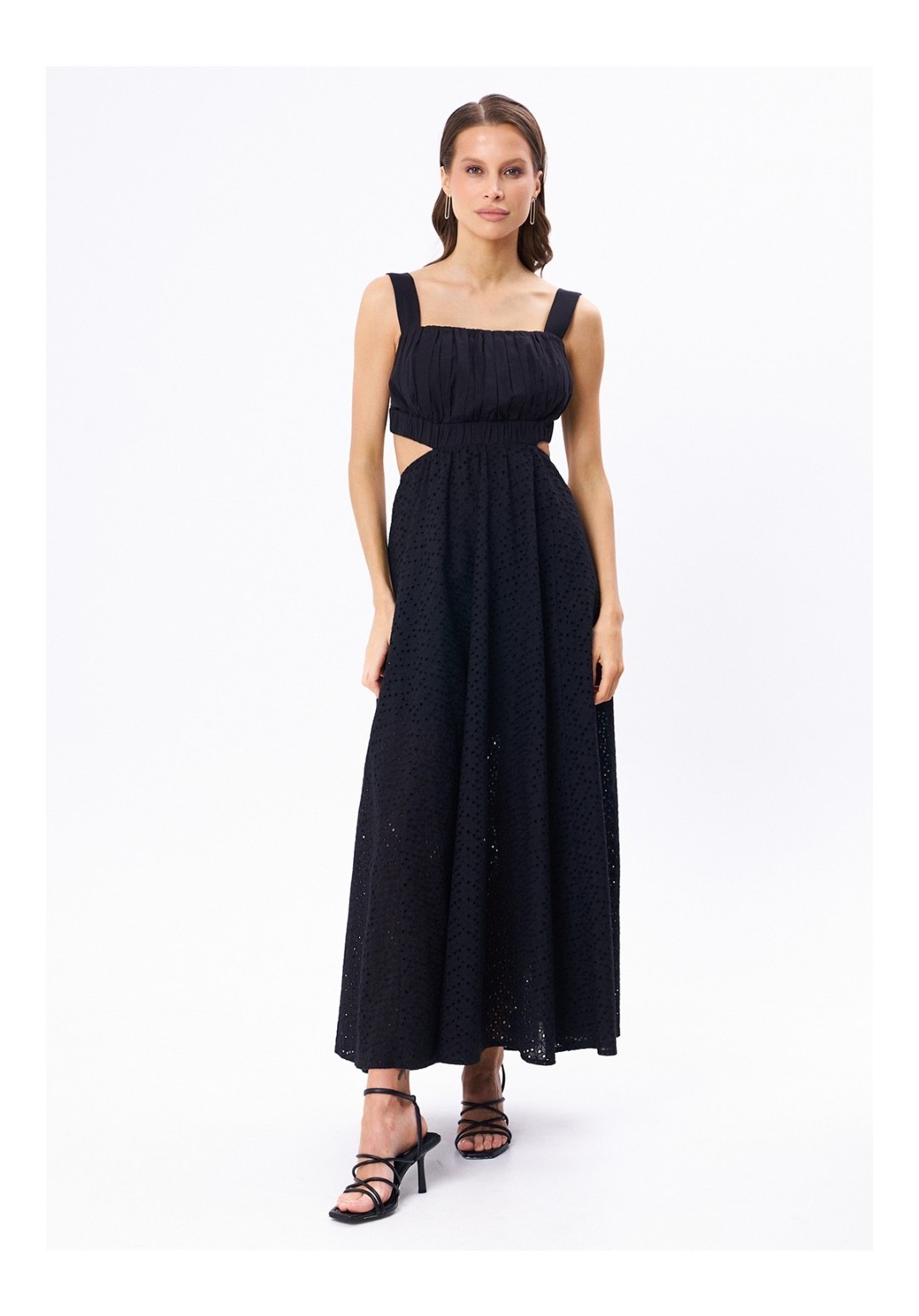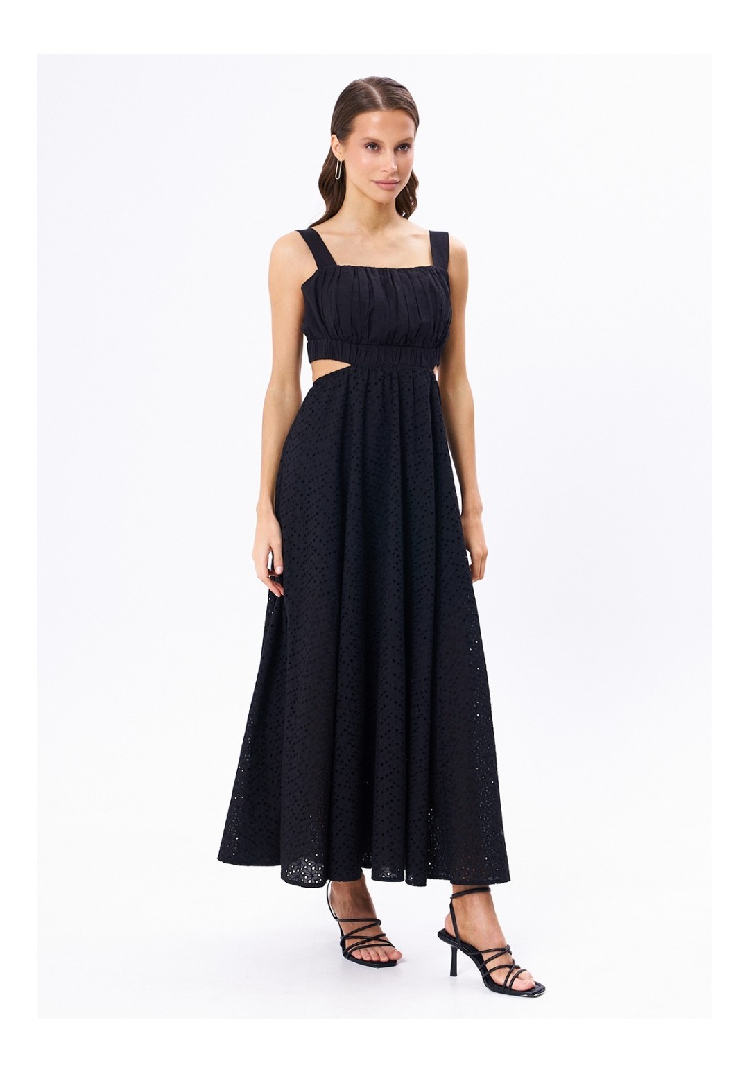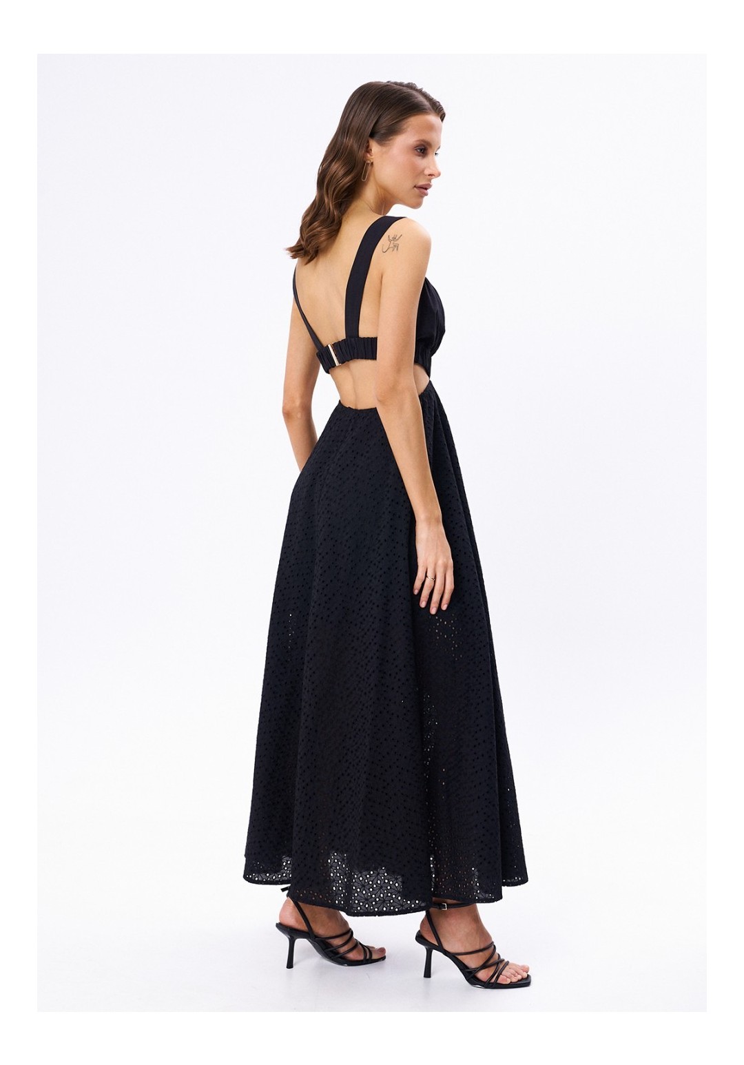Хлопковый сарафан длины макси из однотонной ткани в сочетании с ришелье. Лиф выполнен по принципу бюстгальтера с застёжкой на спине на металлическую пряжку. Юбка на резинке по талии и с потайной молнией в боковом шве для удобства.