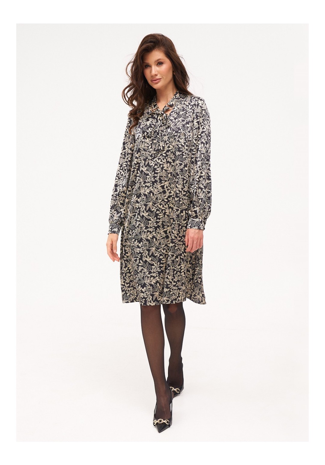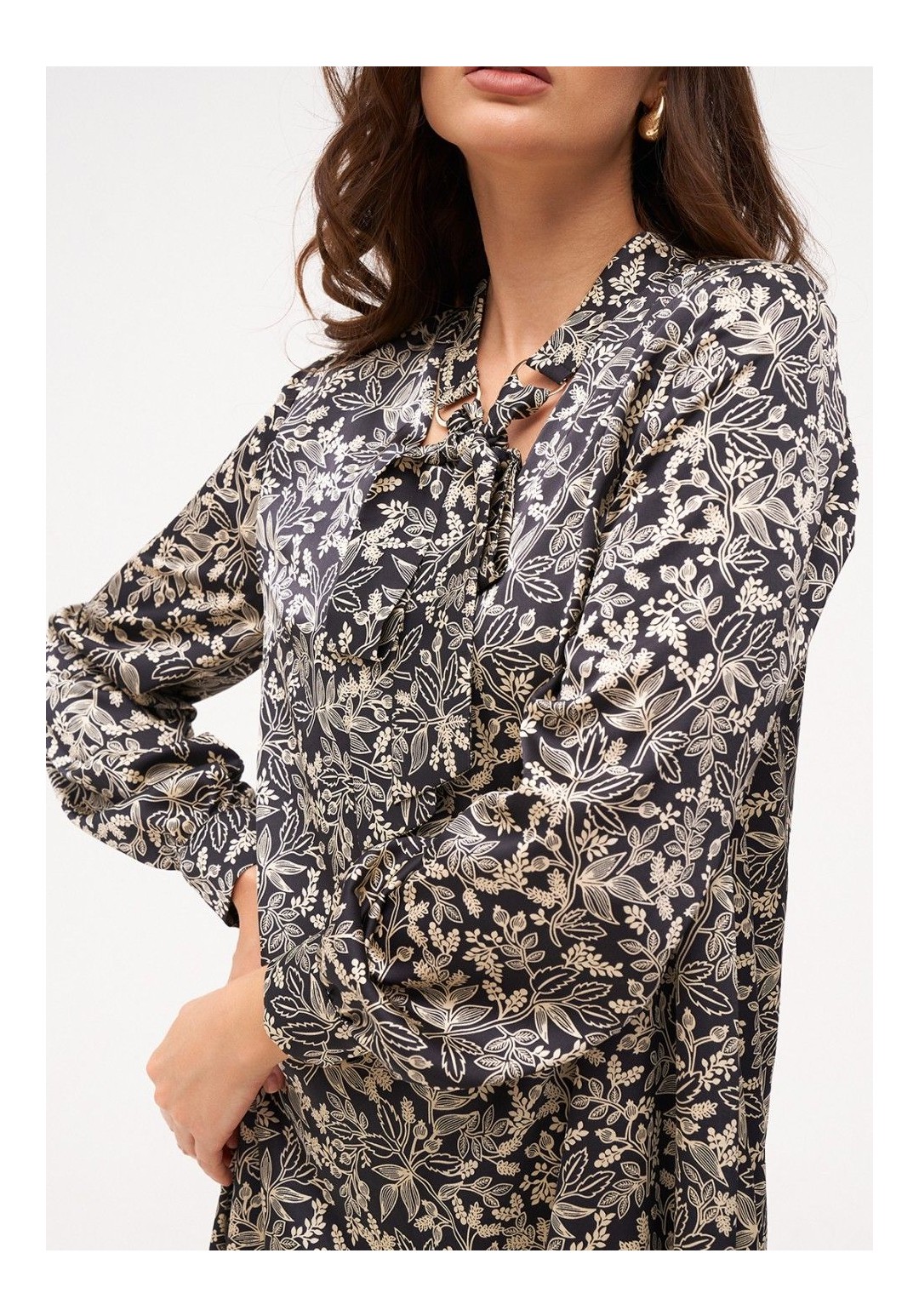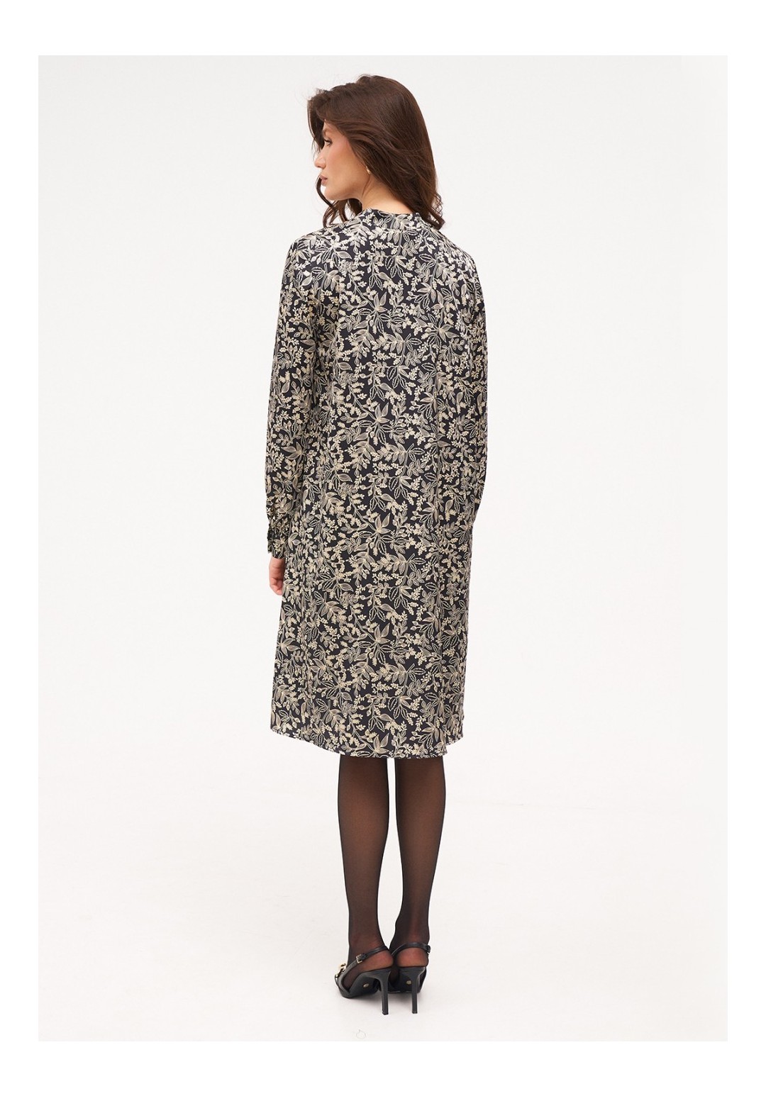 Платье из струящейся, шелковистой ткани длиной до середины колена. Рукав полноценной длины на манжете с застёжкой на пуговицы. По горловине V- образный вырез и стойка с металлическими полукольцами к которым крепятся завязки.