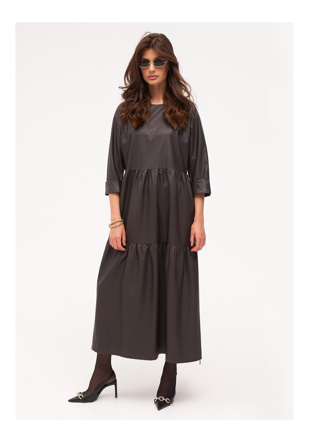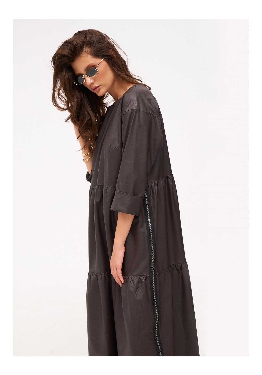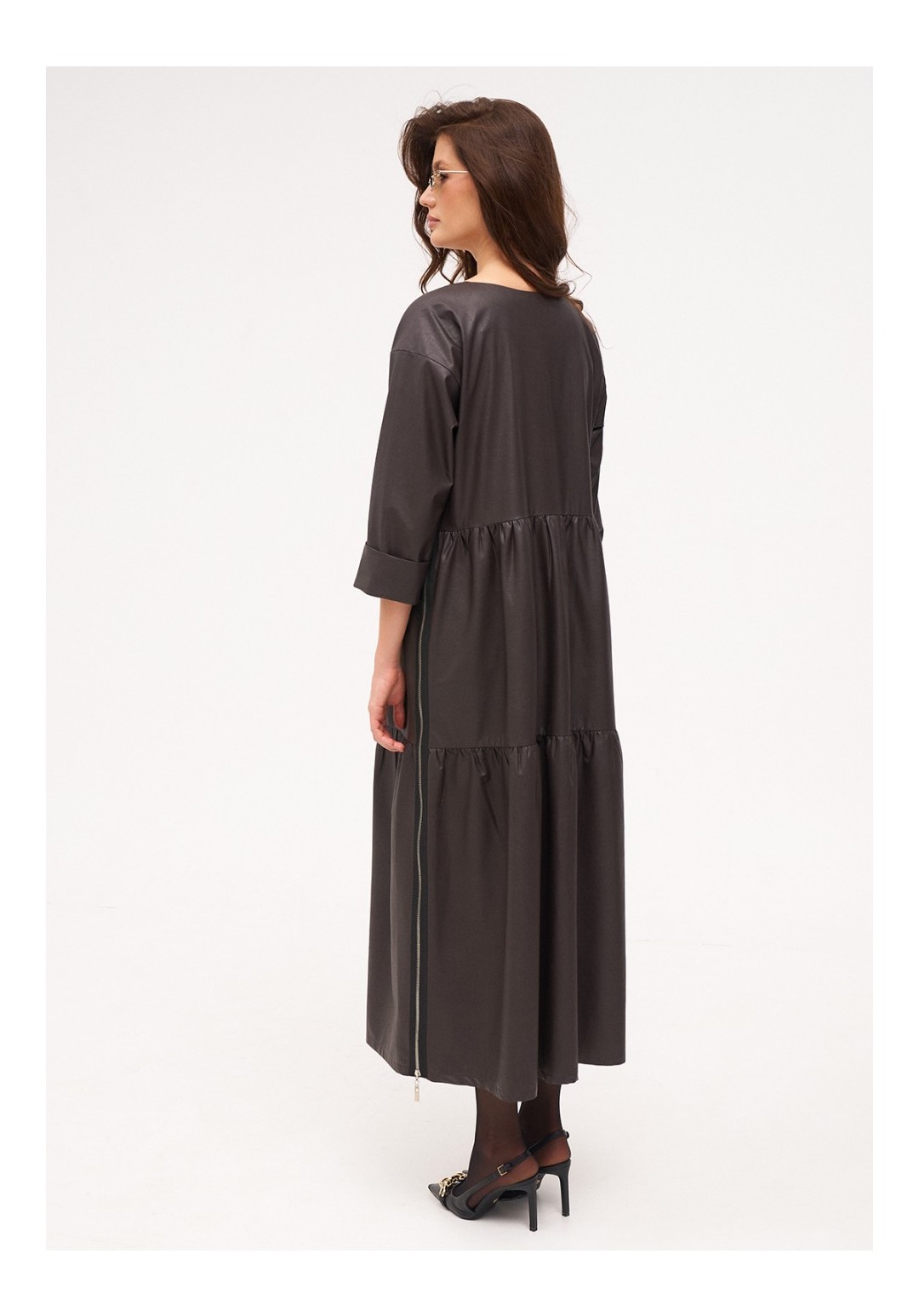 Платье длиной миди из тонкой экокожи с хлопковой изнанкой. Отрезное по талии. Юбка делится на два присборенных волана с декоративными молниями по бокам. Длина рукава 3/4.