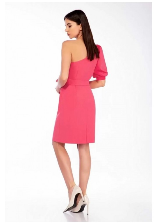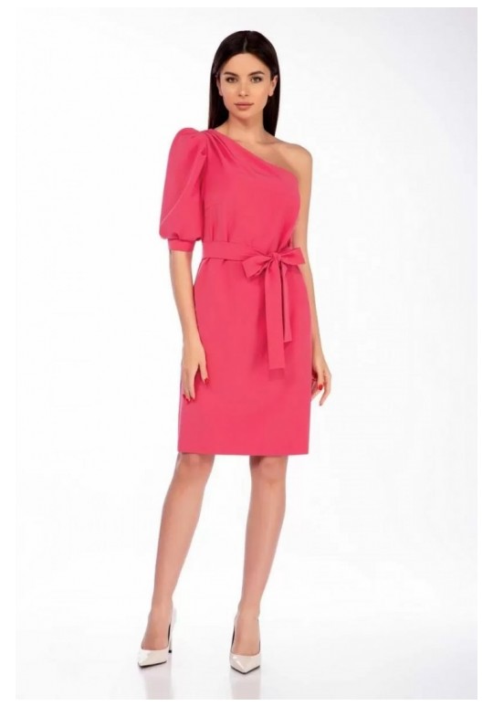 Маленькое, изящное, нарядное платье, полуприлегающего силуэта, со съемным поясом, красиво подчеркивающим талию. Модное веяние: крой на основе асимметрии, акцент на открытое плечо. Справа у плечевого шва – складочки. Рукав до локтя, пышный, на манжете, сверху и внизу – складочки. По спинке шов и шлица. Застежка молния - в боковом шве. Платье на трикотажной подкладке. Пышность и длина рукава изнутри фиксируются подкладкой. Длина платья по спинке 94 см, длина рукава 36 см.