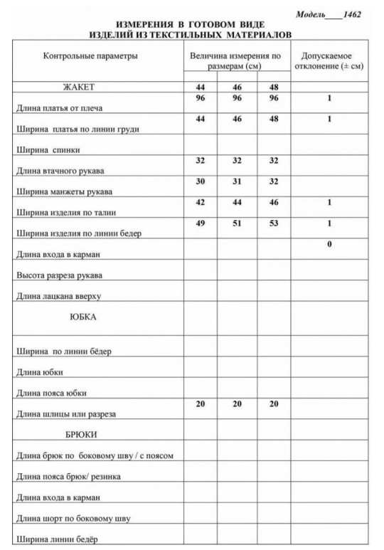 Таблица размеров