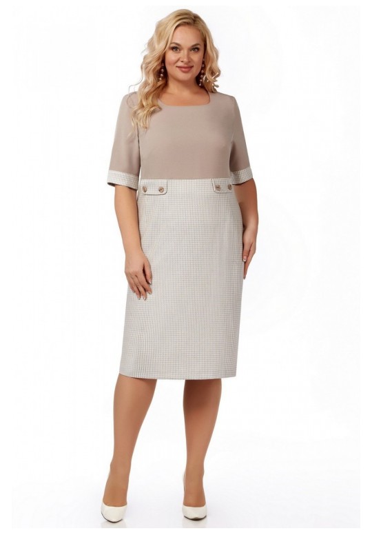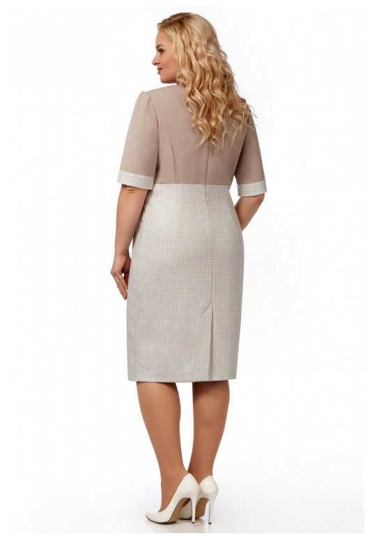 Платье средней длины, полуприлегающего силуэта, выполнено на сочетании двух тканей: основной – с жаккардовым переплетением, и однотонной. Платье с овальным вырезом горловины, с подрезом под грудью. В верхней части рельефы и вытачки, на нижней части у подреза – клапаны с пуговицами. По спинке тоже подрез. В верхней части рельефы, в нижней – вытачки. По центральному шву спинки застежка молния и шлица. Рукав до локтя, с притачной манжетой. Укороченный жакет выполнен из ткани с жаккардовым переплетением. Отложной воротник и лацканы, застежка на три пуговицы. Впереди рельефы и вытачки. Внутренние карманы с листочками. По спинке – шов. Рукав длинный. Жакет на подкладке Гранд.