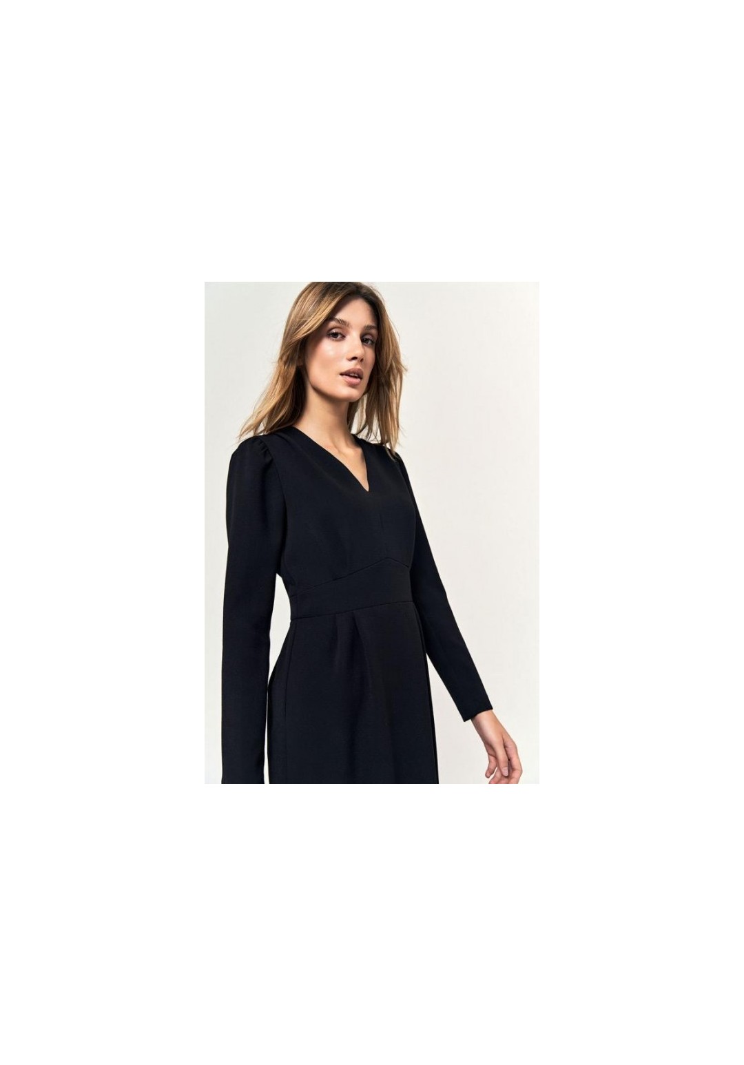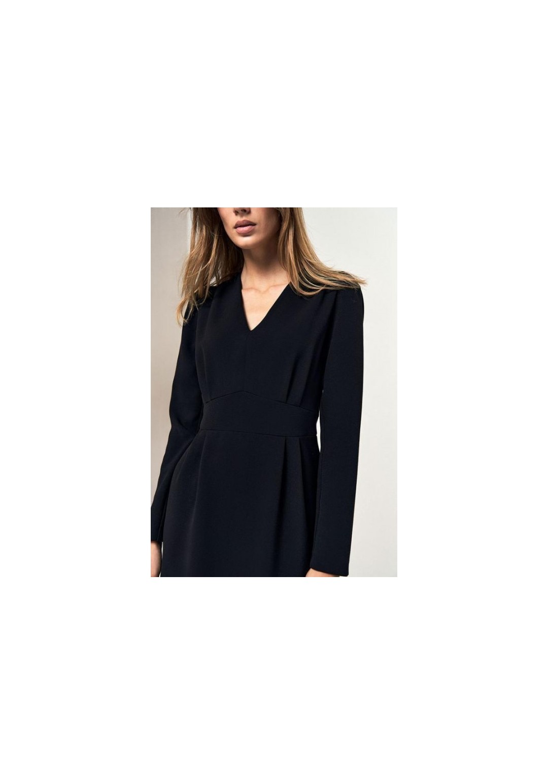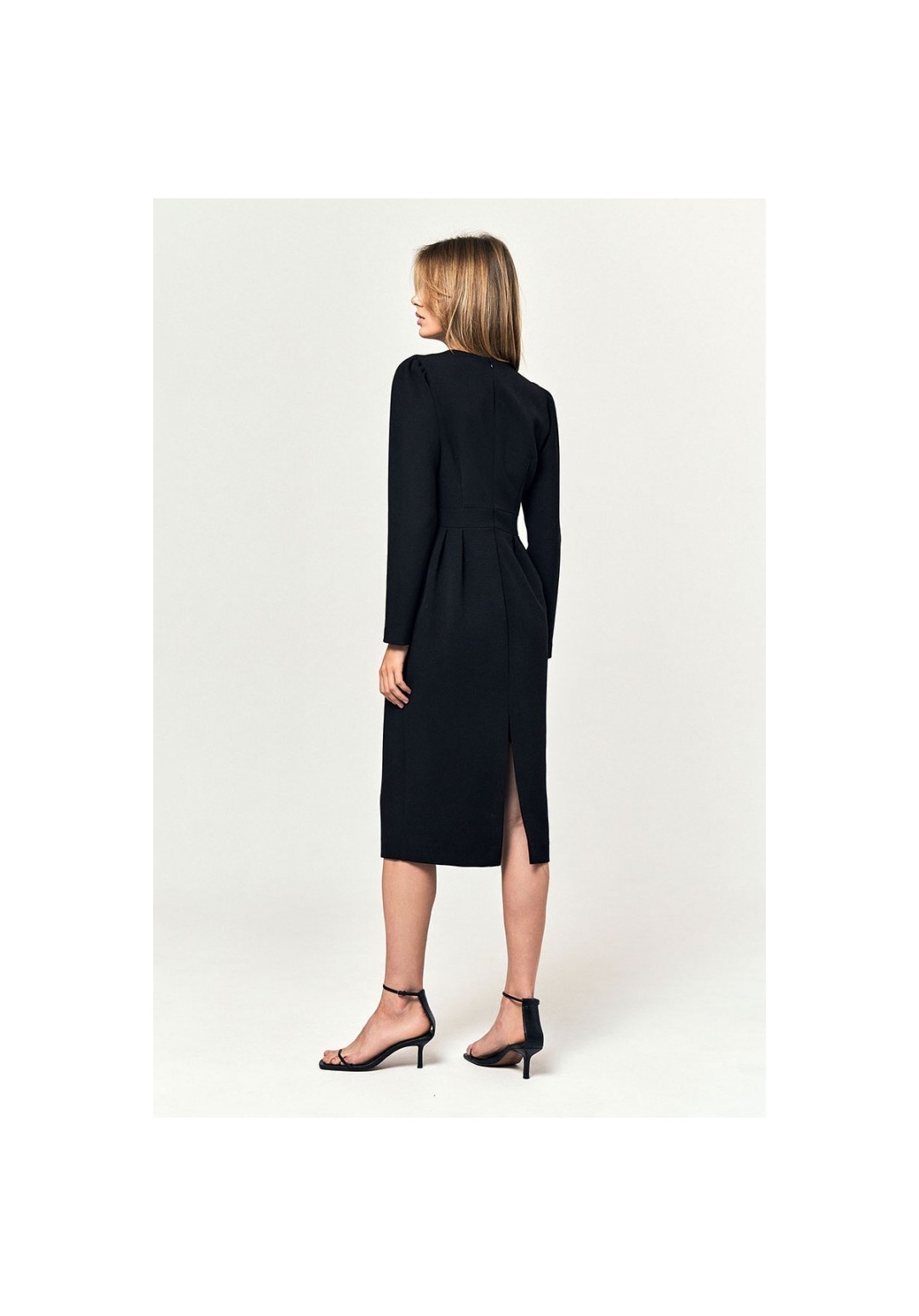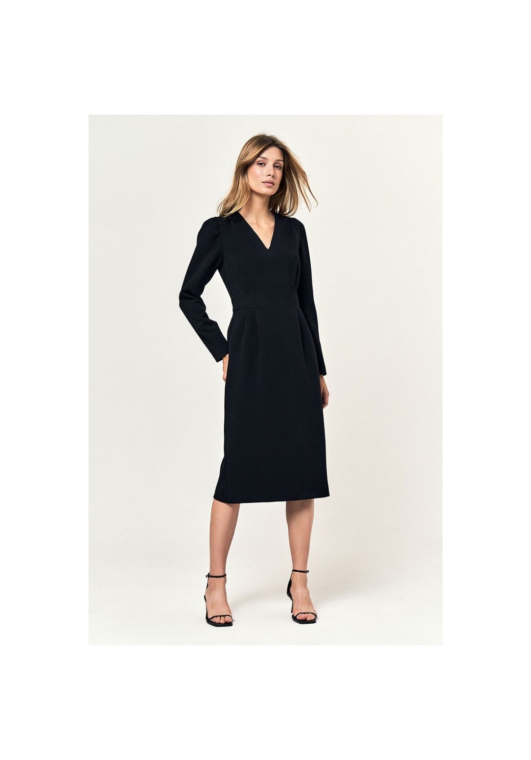 Платье женское приталенное длиной ниже линии колена на нежной эластичной подкладке. Вырез V-образный. Отрезное по линии талии. По переду ниже линии груди подрез с возвышение по центру, от горловины до подреза средний шов, на уровне вытачек от подреза вверх и вниз заложены по две односторонние складки. По плечевому срезу переда -сборка. Спинка со средним швом, с талиевыми вытачками выше линии подреза и двумя складками ниже линии подреза. В среднем шве спинки застежка на потайную тесьму-молнию и разрез. Рукав одношевный, втачной со сборкой по окату. Это платье будем чудесным решением для торжественного мероприятия или будет радовать Вас своим удобством в повседневной носке.