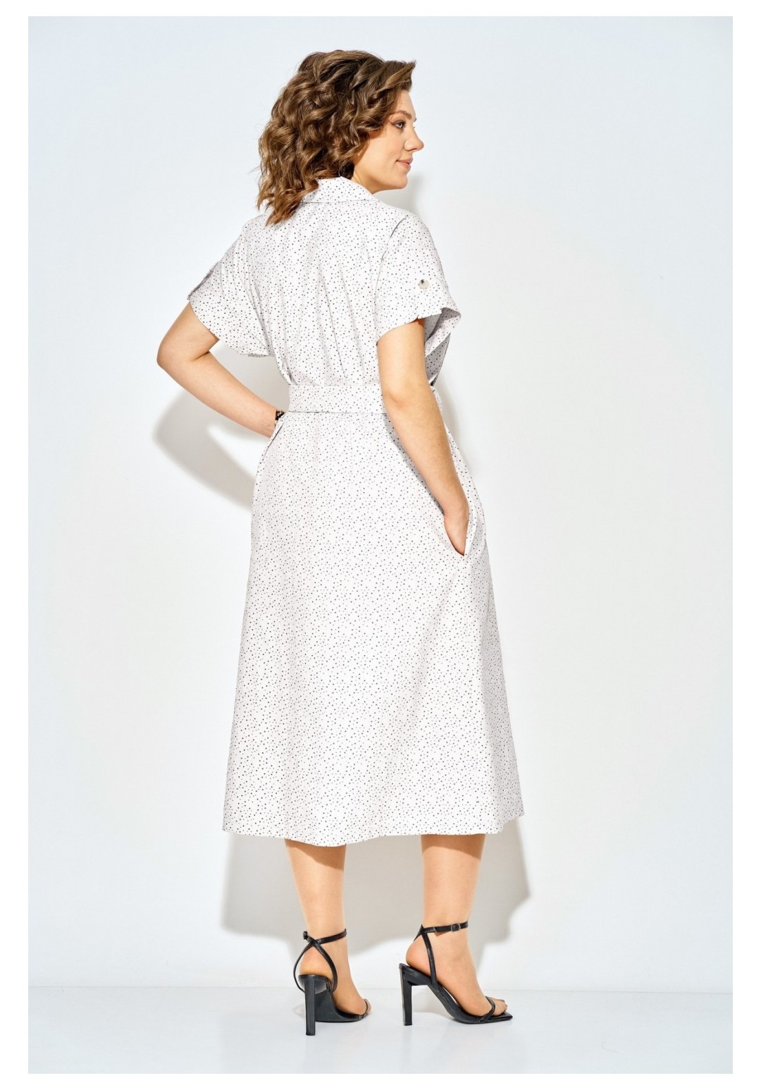 Платье 1521 белый + горох Liliana-style — это идеальный выбор для летних будней. Коллекция бренда Liliana-style представляет модель из хлопка и полиэстера, обеспечивающих комфортную носку и долговечность. Трапециевидный силуэт с отложным английским воротником и спущенной линией плеча делает платье стильным и удобным. Центральная застежка на петли и пуговицы, а также съемный пояс с роговой пряжкой добавляют оригинальности. Платье достигает длины 120 см по спинке и оснащено боковыми карманами, что повышает его функциональность. Декоративные паты на рукавах завершают образ, выводя его в категорию повседневного стиля. Белый цвет с рисунком горох подходит для офисного дресс-кода и праздничных мероприятий. Длина по спинке – 120 см, Рукав – 22 см.