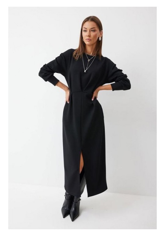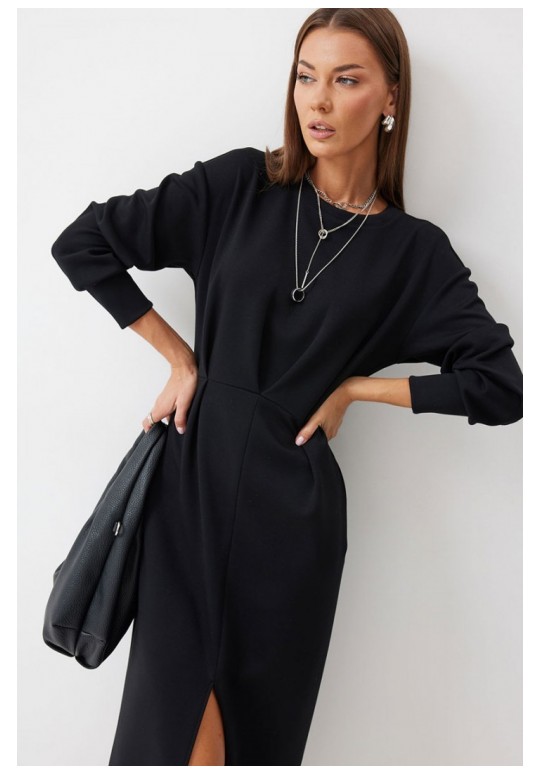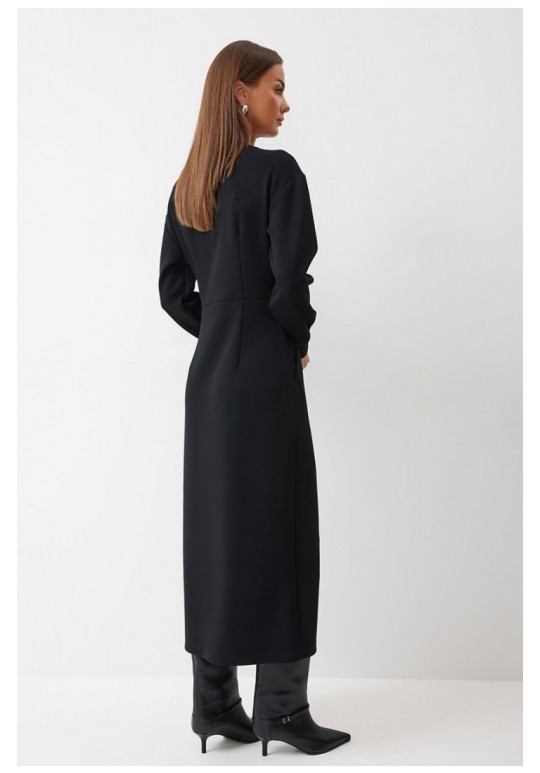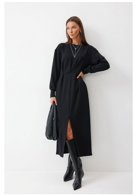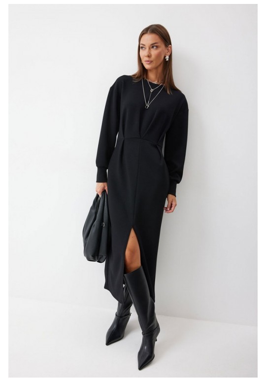 Платье полуприлегающего силуэта из трикотажного полотна. Горловина округлая. Рукав со спущенной линией плеча по низу манжета. Платье отрезное по линии талии. По переду на талии складки. В боковом шве функциональные карманы. В центральном шве юбки разрез. Подходит на рост 164-170 см. Длина платья 126 см. Длина рукава от горловины 72 см.