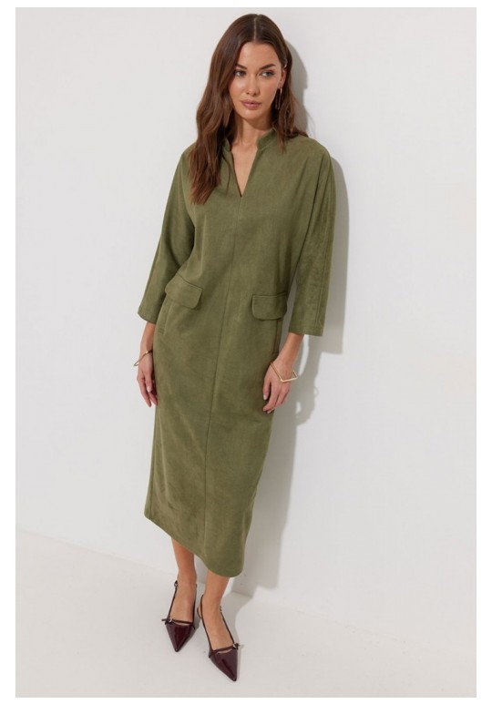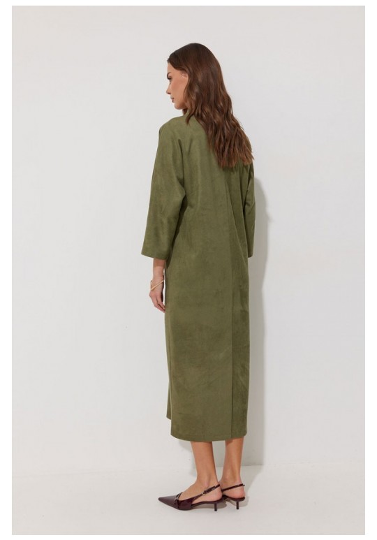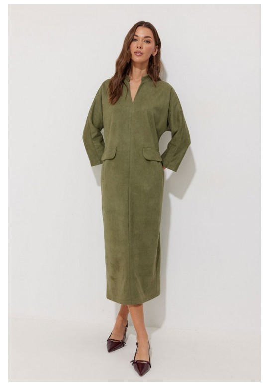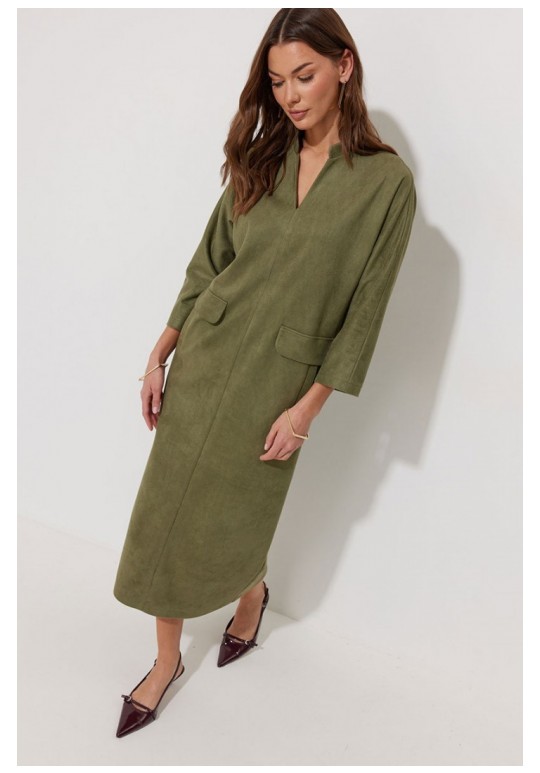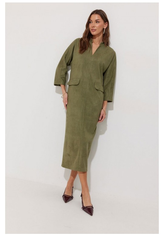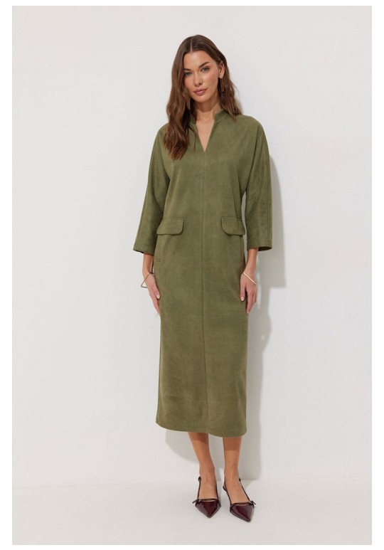 Платье прямого силуэта из трикотажного полотна длины миди. Рукав цельнокроеный, длиной ¾. Воротник-стойка. На передних половинках обработаны прорезные карманы с втачной листочкой и декоративным клапаном. По спинке расположен центральный шов с шлицей по низу. Подходит на рост 164-170 см. Длина изделия (в 44-48 р. – 120 см) (в 50-54 р. – 121см). Длина рукава от горловины (в 44-48 р. – 59 см) (в 50-54 р. - 60.5 см).