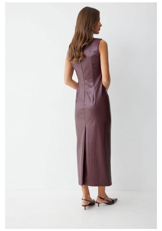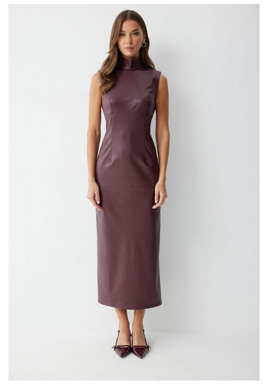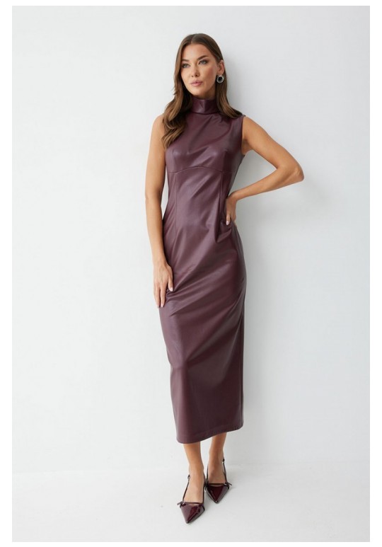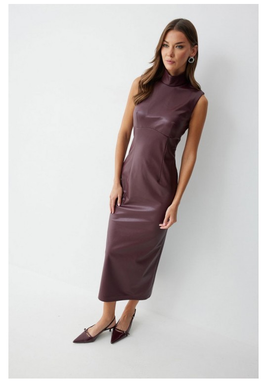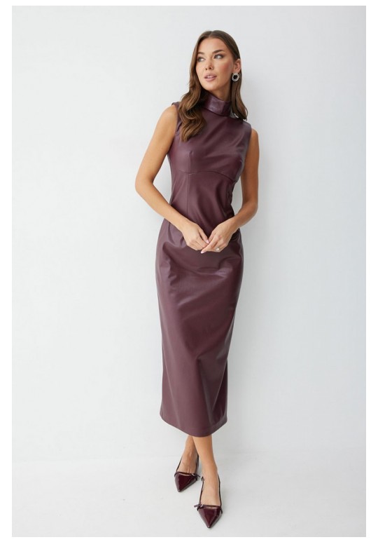 Платье прилегающего силуэта из экокожи длиной миди. Горловина-стойка. Спереди под грудью подрез, нагрудные и талиевые вытачки. На спинке в центральном шве потайная молния, по низу шлица. На спинке платья талиевые вытачки. Подходит на рост 164-170 см. Длина платья 130 см.