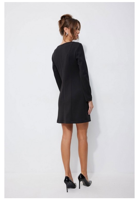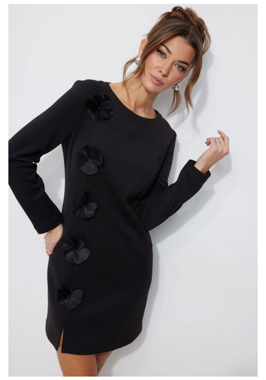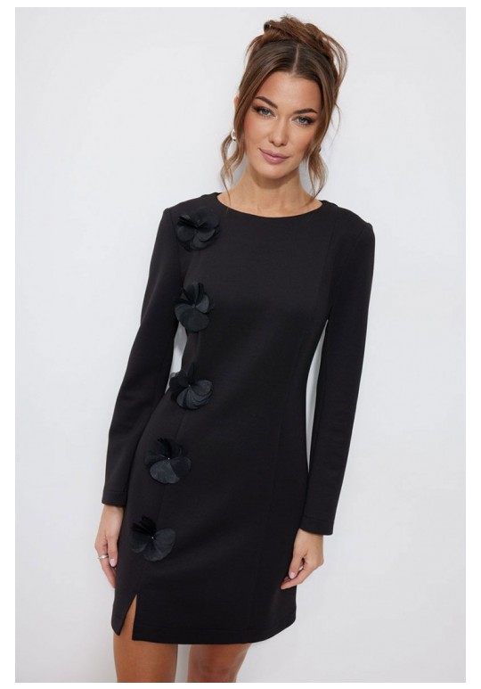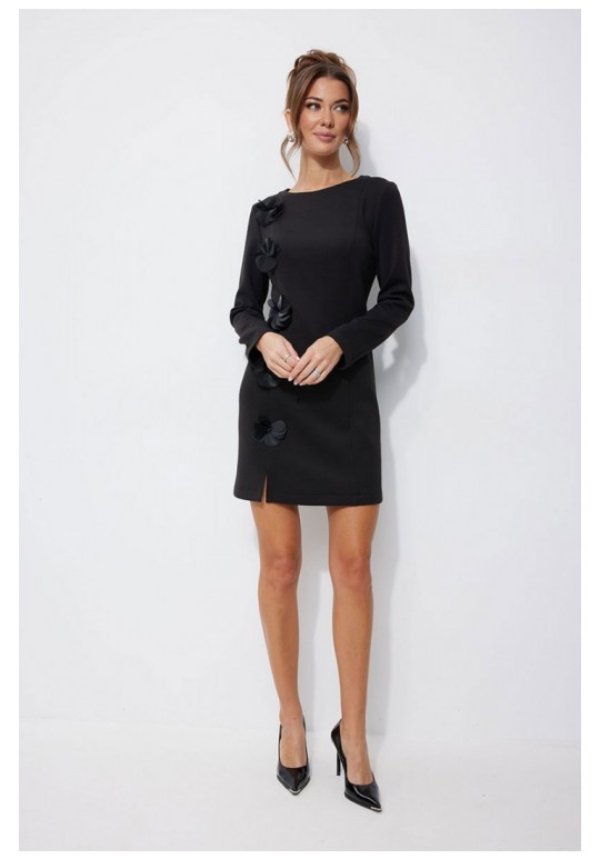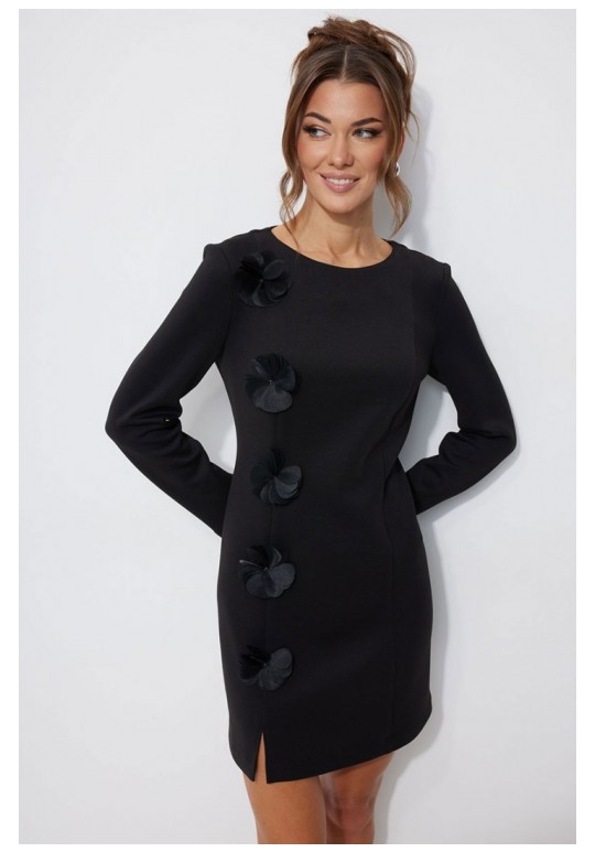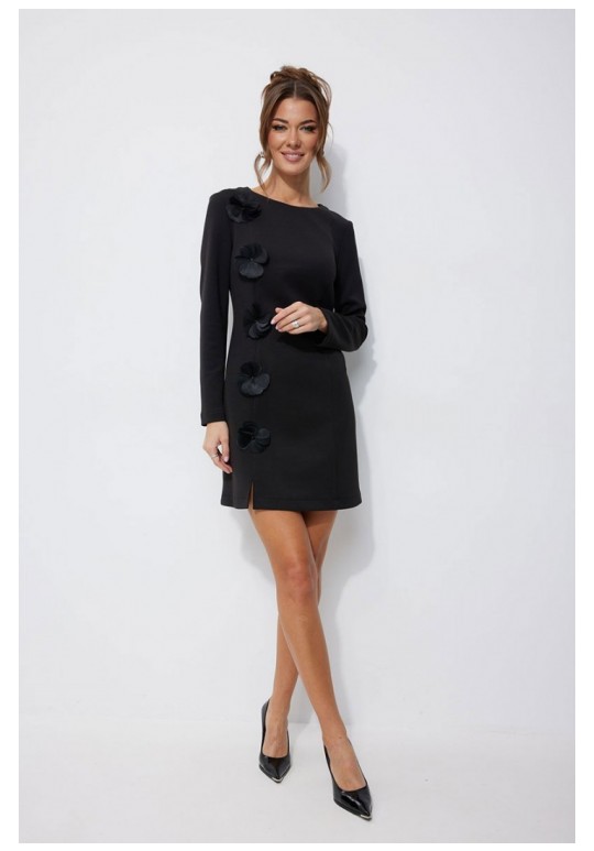 Нарядное платье из трикотажного полотна, длина мини. Платье прилегающего силуэта с небольшим расширением по низу. С рельефами по переду и спинке. По переду слева вдоль рельефа пришивной декор цветы. По переду слева рельеф с разрезом по низу. Рукав втачной, длинный. Вырез горловины лодочка. Потайная молния в среднем шве спинки. Обращаем Ваше внимание, что декор может незначительно отличаться от фото. Длина платья 44-48р 82 см, в 50-54р 92 см. Длина рукава 61 см во всех размерах.