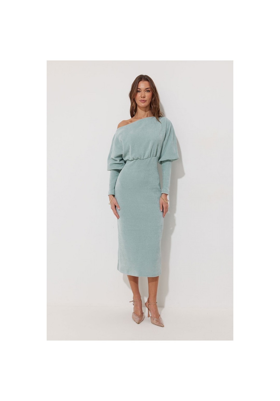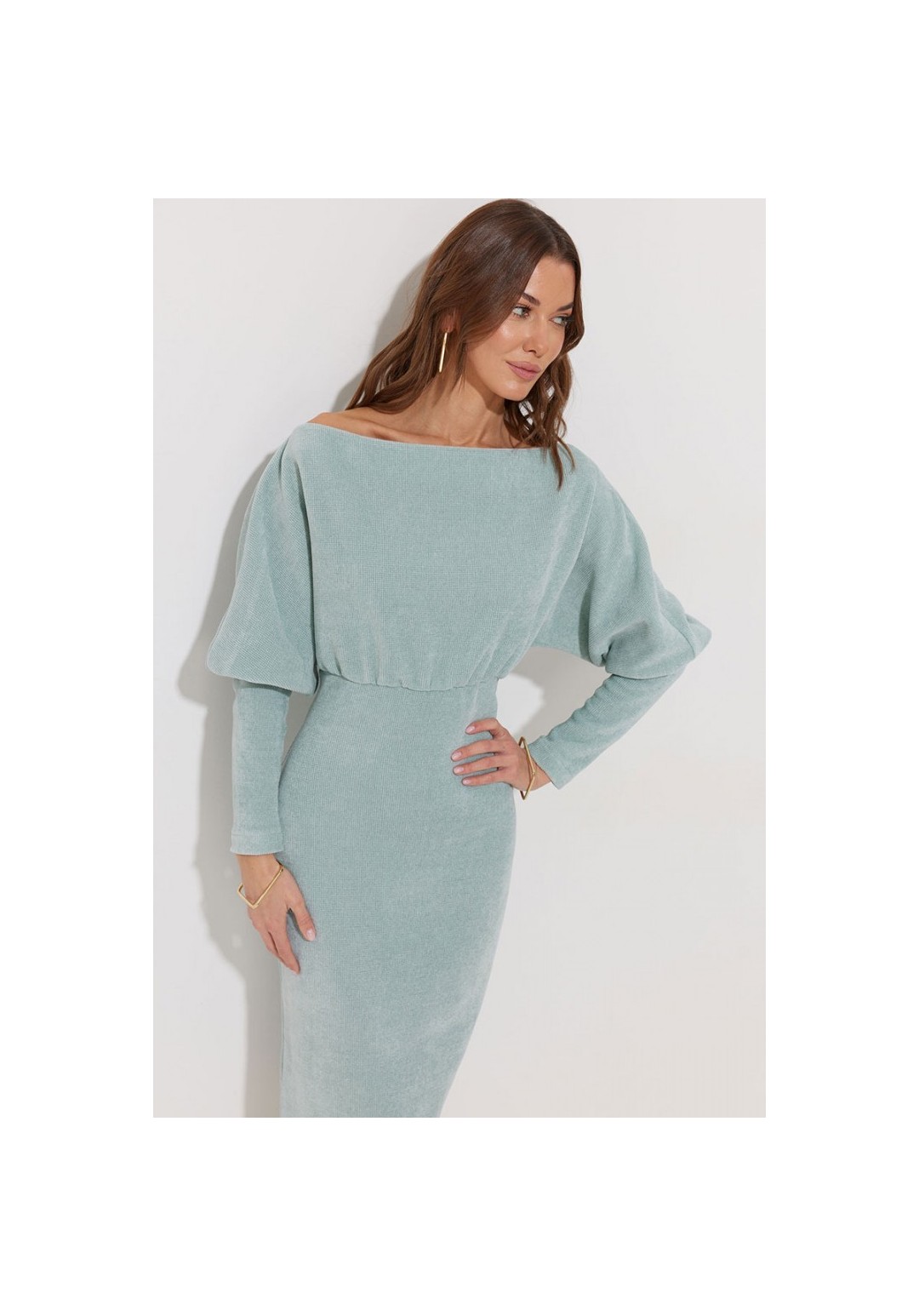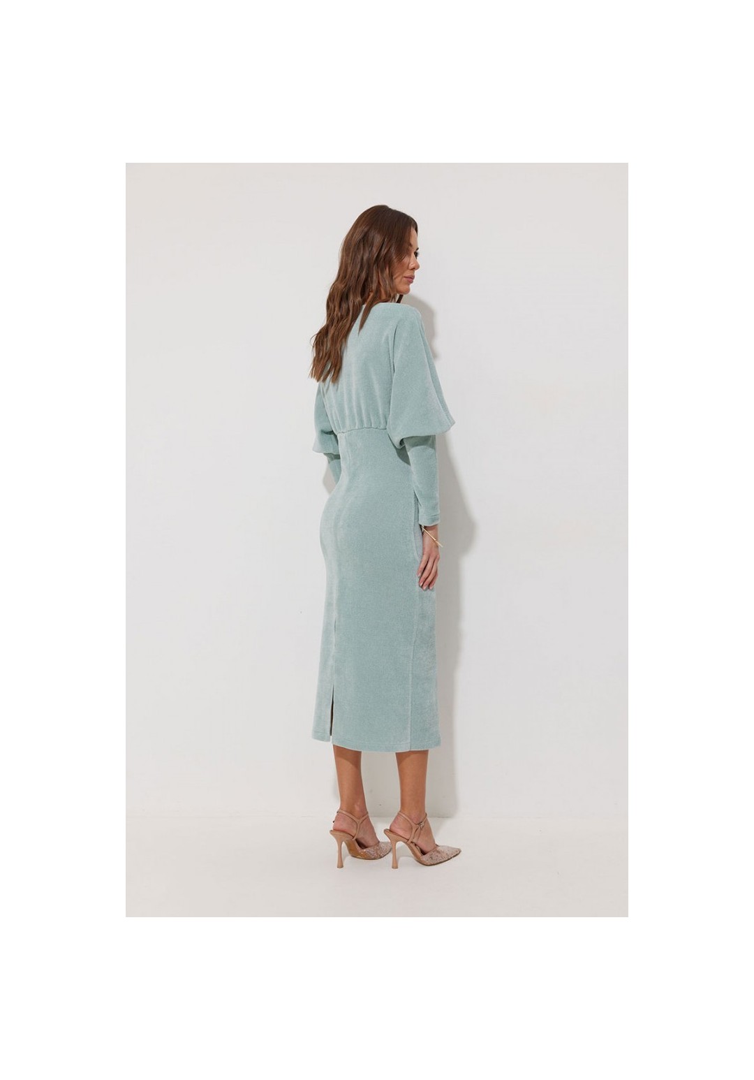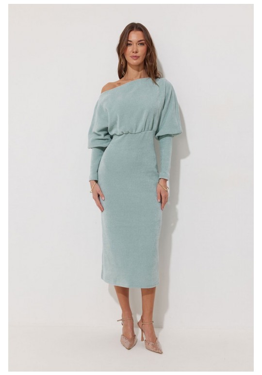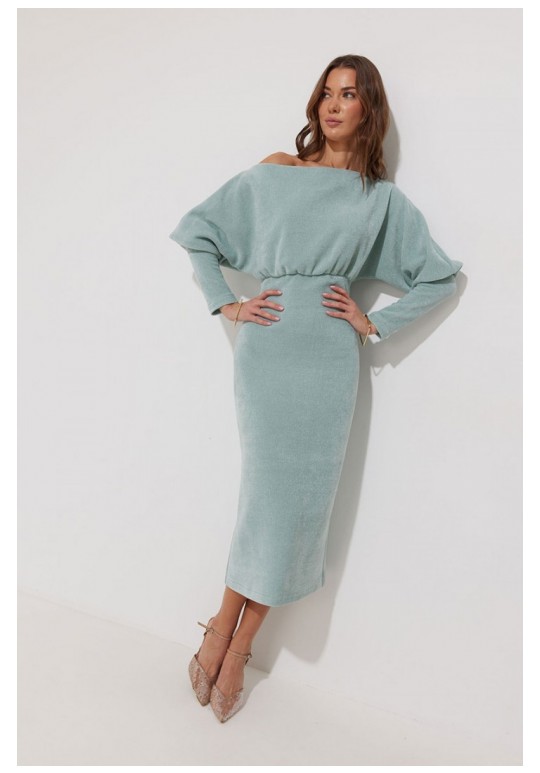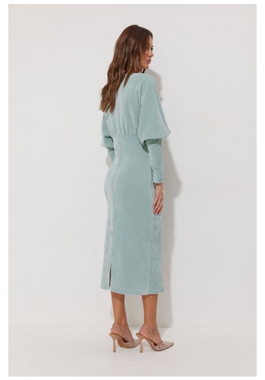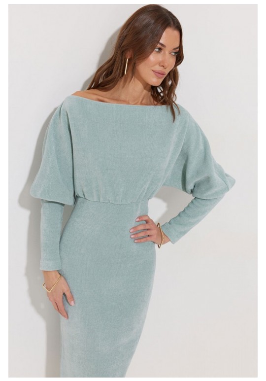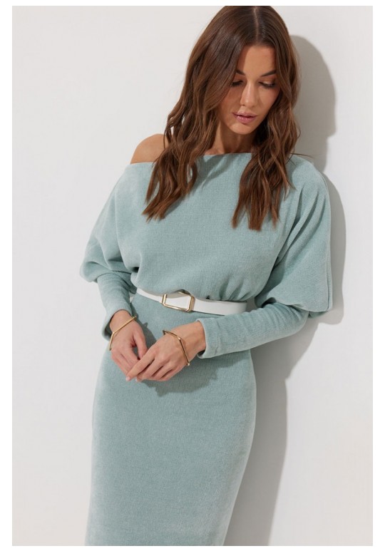 Платье полуприлегающего силуэта из трикотажного полотна. Горловина-лодочка. Рукав цельнокроеный, с подрезом выше уровня локтя и узкой длинной манжетой. По переду и спинке выше линии талии подрез, в который вставлена резинка. Обращаем ваше внимание, что ремень в комплект не входит. Подходит на рост 164-170 см. Длина платья (44-48р - 120см)(50-54р – 121см). Длина рукава от горловины 65см.