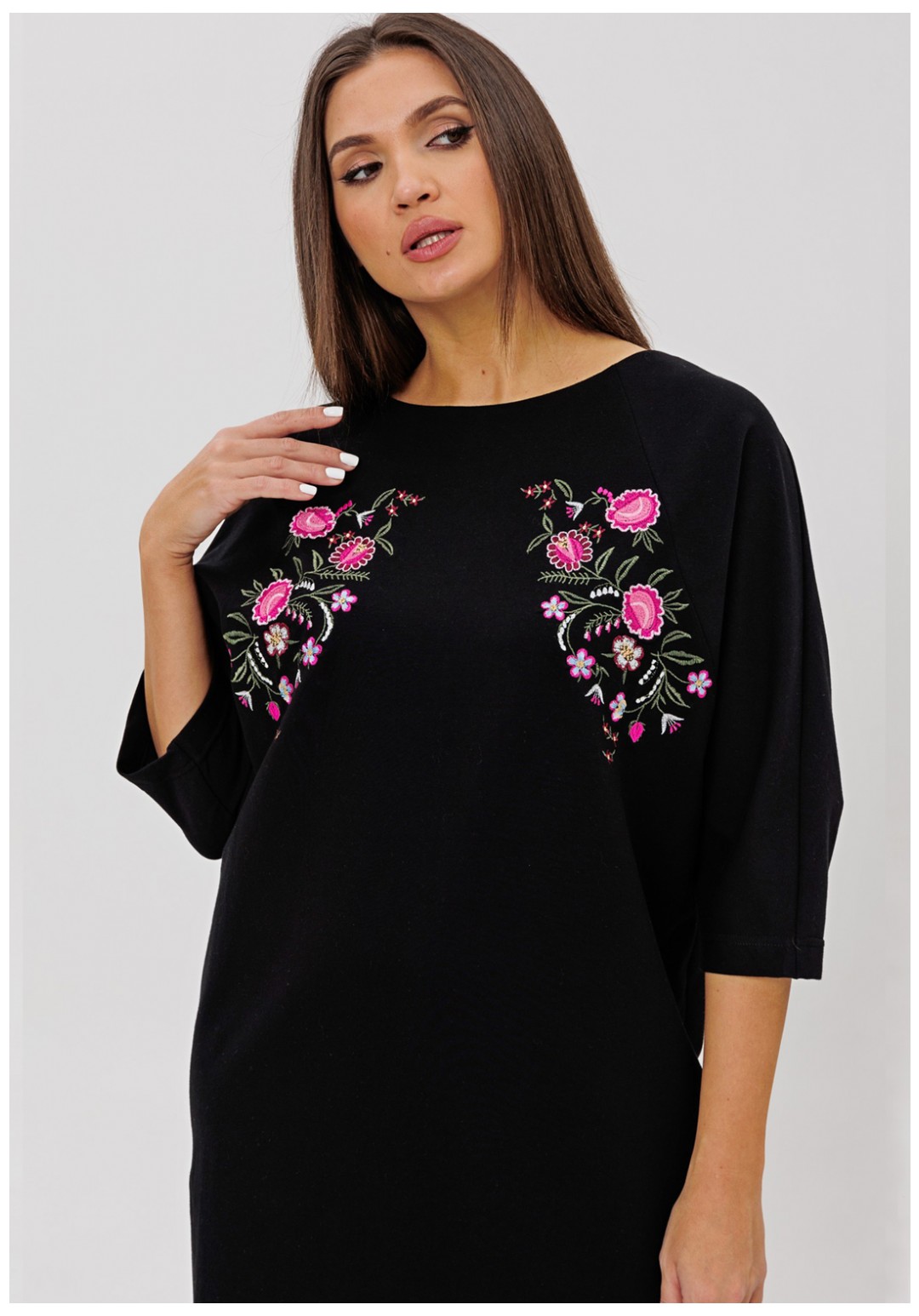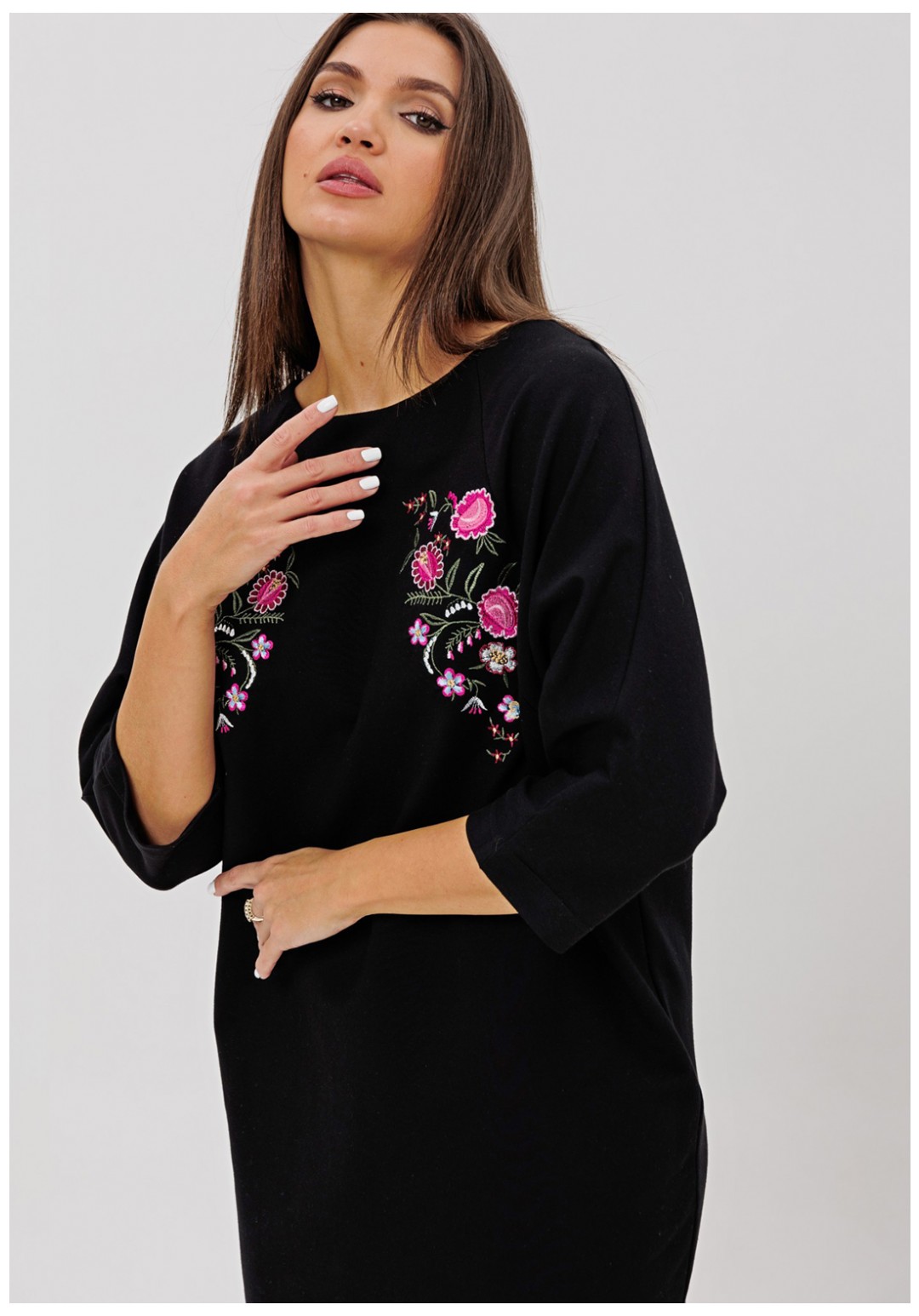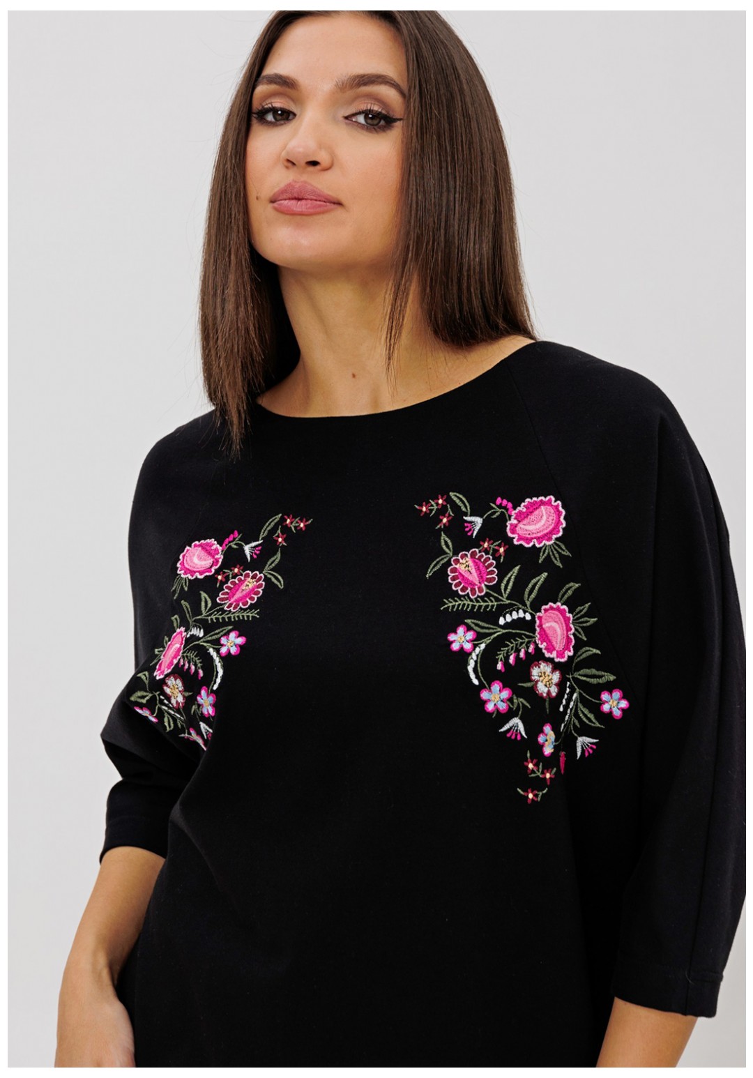 Перед цельный с декоративной дизайнерской вышивкой. Горловина - лодочка, обработана обтачкой. Спинка со средним швом. Рукав полуреглан.